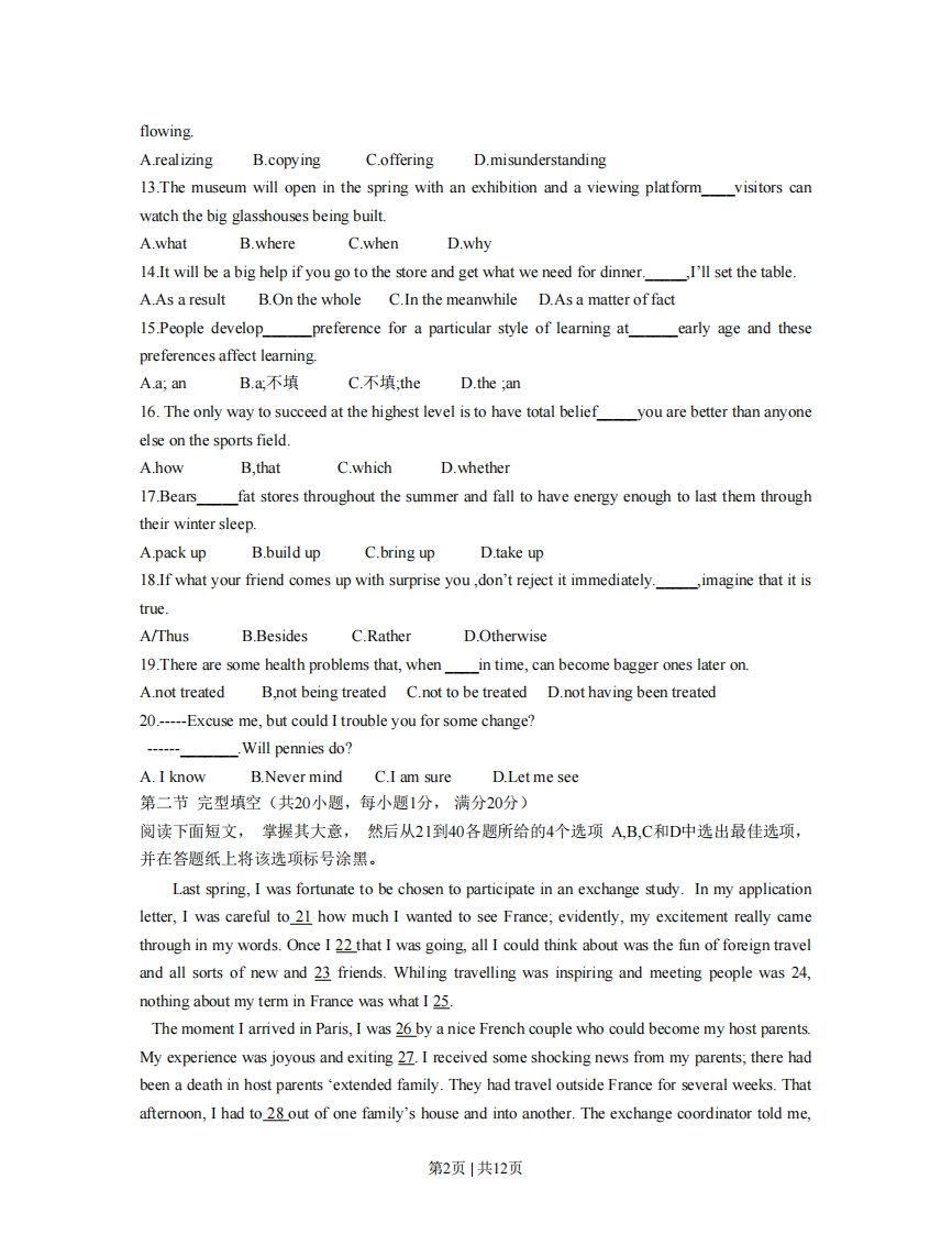 英语试题(选择题部分)第一部分:英语知识运用(共两节,满分30分)第一节:单项填空(共20题,每小题0.5分,满分10分)从A、B、C和D四个选项中,选出可以填入空白处的最佳选项,并在答题纸将该选项标号涂黑1.-Hey,can I ask you a favor?A.Here you are B.just as I thought C.how is it going?D.what can I do for you?2.Mary worked here as a-secretary and ended up getting a full-time job with the company.A.pessimistic B.temporary C.previousD.cautious3.I myself more-----it was a perfect day.A.should n't have enjoyedB.need n't have enjoyedC.would n't have enjoyedD.could n't have enjoyed4.As the world's population continues to grow,the of food becomes more and more of a concern.A.worthB.supplyC.packageD.list5.The children,had played the whole day long,were worn out.A.all of whatB.all of which C.all of themD.all of whom6.If we leave right away,we'll arrive on time.A.hopefullyB.curiouslyC.occasionally D.gradually7.how others react to the book you have just read creates an added pleasure.A.HearingB.Hear C.Having heardD.To be hearing8.Eye doctors recommend that a child's first eye exam__at the age of six months old.A.wasB.beC.wereD.is9.When the group discussion is nearing its end,make sure toit with important points.A.concludeB.leadC.avoidD.hold10.During the last three decades,the number of people participating in physical fitnessprogramssharply.A.was increasing B.has increased C.had increasedD.will be increasing11.Half of surveyed in 16 countries say they go first to their closest friend to share their deepestwishes and darkest fears.A.theseB,.someC.onesD.those12.A good listener takes part in the conversation,ideas and raising questions to keep the talk第1页|共12页flowing.A.realizingB.copyingC.offeringD.misunderstanding13.The museum will open in the spring with an exhibition and a viewing platformvisitors canwatch the big glasshouses being built.A.whatB.whereC.whenD.why14.It will be a big help if you go to the store and get what we need for dinner.,I'll set the table.A.As a resultB.On the whole C.In the meanwhile D.As a matter of fact15.People developpreference for a particular style of learning atearly age and thesepreferences affect learningA.a;anB.a不填C.不填,heD.the,an16.The only way to succeed at the highest level is to have total beliefyou are better than anyoneelse on the sports field.A.howB,thatC.whichD.whether17.Bearsfat stores throughout the summer and fall to have energy enough to last them throughtheir winter sleep.A.pack upB.build upC.bring upD.take up18.If what your friend comes up with surprise you,don't reject it immediately.,imagine that it istrue.A/ThusB.BesidesC.RatherD.Otherwise19.There are some health problems that,whenin time,can become bagger ones later on.A.not treated B.not being treated C.not to be treated D.not having been treated20.-----Excuse me,but could I trouble you for some change?.Will pennies do?A.I know B.Never mind C.I am sureD.Let me see第二节完型填空(共20小题,每小题1分,满分20分)阅读下面短文,掌握其大意,然后从21到40各题所给的4个选项A,B,C和D中选出最佳选项,并在答题纸上将该选项标号涂黑。Last spring,I was fortunate to be chosen to participate in an exchange study.In my applicationletter,I was caref