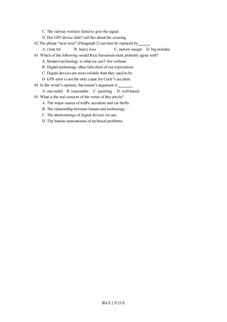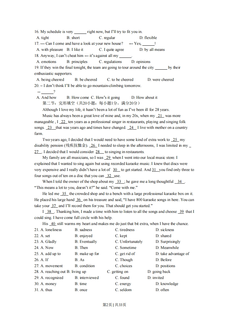 2011年普通高等学校招生全国统一考试(浙江卷)第一部分英语知识运用(共两节,满分80分)1.-I'm sorry I didn't make it to your party last night.I know you're busy these days.A.Of courseB.No kidding C.That's all nightD.Don't mention it2.Experts think that」recently discovered painting may bePicasso.A.the;不填B.a;theC.a,不填D.the;a3.Bats are surprisingly long lived creatures some.a life span of around 20 yearsA.havingB.hadC.haveD.to have4.One Friday,we were packing to leave for a weekend awaymy daughter heard cries forhelp.A.afterB.whileC.sinceD.when5.I always wanted to do the job which I'd been trainedA.onB.forC.byD.of6.The school isn't the one I really wanted to go to,but I suppose I'll just have toitA.make the best of B.get away from C.keep an eye onD.catch up with7.Since people are fond of humor,it is as well in conversation aselseA.anythingB.somethingC.anywhereD.somewhere8.English is a language shared by several diverse cultures,each ofuses it somewhatdifferently.A.whichB.whatC.themD.those9.The professor could tell by thelook in Maria's eyes that she didn't understand a singleword of his lecture.A.coldB.blankC.innocentD.fresh10.A bank is the placethey lend you an umbrella in fair weather and ask for it back whenit begins to rain.A.whenB.thatC.whereD.there11.---How's your new babysitter?---We ask for a better one.All our kids love her so much.A.shouldB.might C.mustn'tD.couldn't12.He decided that he would drive all the way home instead ofat a hotel for the night.A.putting down B.putting offC.putting onD.putting up13.I've been writing this reportfor the last two weeks,but it has to be handed intomorrow.A.finallyB.immediatelyC.occasionallyD.certainly14.Even the best writers sometimes find themselves for words.A.loseB.lostC.to loseD.having lost15.The manager was worried about the press conference his assistant in his place but,luckily,everything was going on smoothly.A.gaveB.givesC.was givingD.had given第1页1共33页16.My schedule is veryright now,but I'll try to fit you in.A.tightB.shortC.regularD.flexible17.---Can I come and have a look at your new house?--Yes,A.with pleasure B.I like itC.I quite agreeD.by all means18.Anyway,I can't cheat him--it's against all myA.emotions B.principlesC.regulationsD.opinions19.If they win the final tonight,the team are going to tour around the cityby theirenthusiastic supporters.A.being cheered B.be cheeredC.to be cheeredD.were cheered20.-I don't think I'll be able to go mountain-climbing tomorrow2A.And howB.How come C.How's it goingD.How about it第二节:完形填空(共20小题:每小题1分,满分20分)Although I love my life,it hasn't been a lot of fun as I've been ill for 28 years.Music has always been a great love of mine and,in my 20s,when my 21 was moremanageable,I 22 ten years as a professional singer in restaurants,playing and singing folksongs.23 that was years ago and times have changed.24 I live with mother on a countryfarm.Two years ago,I decided that I would need to have some kind of extra work to 25mydisability pension(残疾抚恤金).26_I needed to sleep in the afternoons,I was limited in my