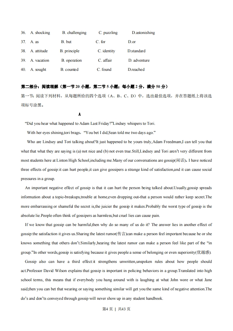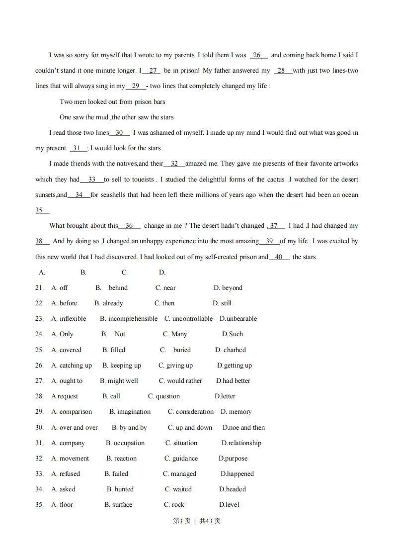 绝密★启封前2016普通高等学校招生全国统一考试(浙江卷)英语选择题部分(共80分)第一部分:英语知识运用(共两节,满分30分)第一节:单项填空(共20小题:每小题0.5分,满分10分)从A、B、C和D四个选项中,选出可以填入空白处的最佳选项,并在答题纸上将该选项标号涂黑。1.--Are you sure you're ready for the best?I'm well prepared for it.A.I'm afraid notB.No problemC.Hard to sayD.Not really2.prize for the winner of the competition is two-week holiday in Paris.A.The;不填B.A;不填C.A:theD.The;a3.In many ways,the education system in the US is not very different fromin the UK.A.thatB.thisC.oneD.it4.It is important to pay your electricity bill on time,as late payments may affect yourA.conditionB.incomeC.creditD.status5online shopping has changed our life,not all of its effects have been positive.A.SinceB.AfterC.WhileD.Unless6.That young man is honest,cooperative,always there when you need his helphe's reliable.A.Or elseB.In shortC.By the wayD.For one thing7.The study suggests that the cultures we grow upinfluence the basic processes by which we see worldaround us.A.onB.inC.atD.about8.We can achieve a lot when we learn to let our differences unite,rather thanA.divideB.rejectC.controlD.abandon9.Silkone of the primary goods traded along the Silk Road by about 100 BC.A.had becomeB.rejectC.controlD.abandon10.To retum to the problem of water pollution,I'd like you to look at a studyin Australia in 2012A.having conductedB.to be conductedC.conductingD.conducted11.Scientists have advanced many theories about why human beings cry tears,none ofhas been proved.第1页|共43页A.whomB.whichC.whatD.that12.When their children lived far away from them,these old people feltfrom the world.A.carried awayB.broken downC.cut offD.brought up13.A sudden stop can be a very frightening experience,.if you are travelling at high speed.A.eventuallyB.strangelyC.merelyD.especially14.When the time came to make the final decision for a course,I decided to apply for the one thatmyinterest.A.limitedB.reservedC.reflectedD.spoiled15.Had the govemments and scientists not worked together,AIDS-related deathssince their highest in2005.A.had not fallenB.would not fallC.did not fallD.would not have fallen16.In this article,you need to back up general statements withexamplesA.specificB.permanentC.abstractD.universal17.Georgetoo far.His coffee is still warmA.must have goneB.might have goneC.can't have goneD.needn't have gone18.I have always enjoyed all the events you organized and I hope to attend in the coming yearsA.little moreB.no moreC.much more D.many more19.I had as much fun sailing the seas as I now dowith students.A.workingB.workC.to workD.worked20.-The movie starts at 8:30,and we can have a quick bite before we go.See you at 8:10A.So long B.Sounds great C.Good luck D.Have a good time第二节:完形填空(共20小题:每小题1分,满分20分0)阅读下面短文,掌握其大意,然后从21一40各题所给的四个选项(A、B、C和D)中,选出最佳选项,并在答题纸上将该选项标号涂黑。During the war,my husband was stationed at an ammy camp in a desert in California.I went to live there inorder to be 21 him.I hated the place.I had never 22 been so unhappy.My husband was ordered out on along-term duty,and I was left in a tiny shack()alone.The hea