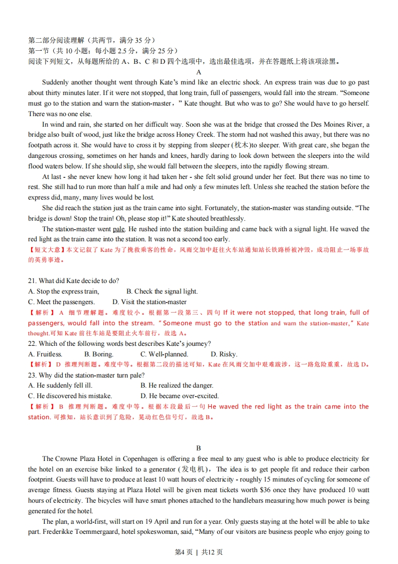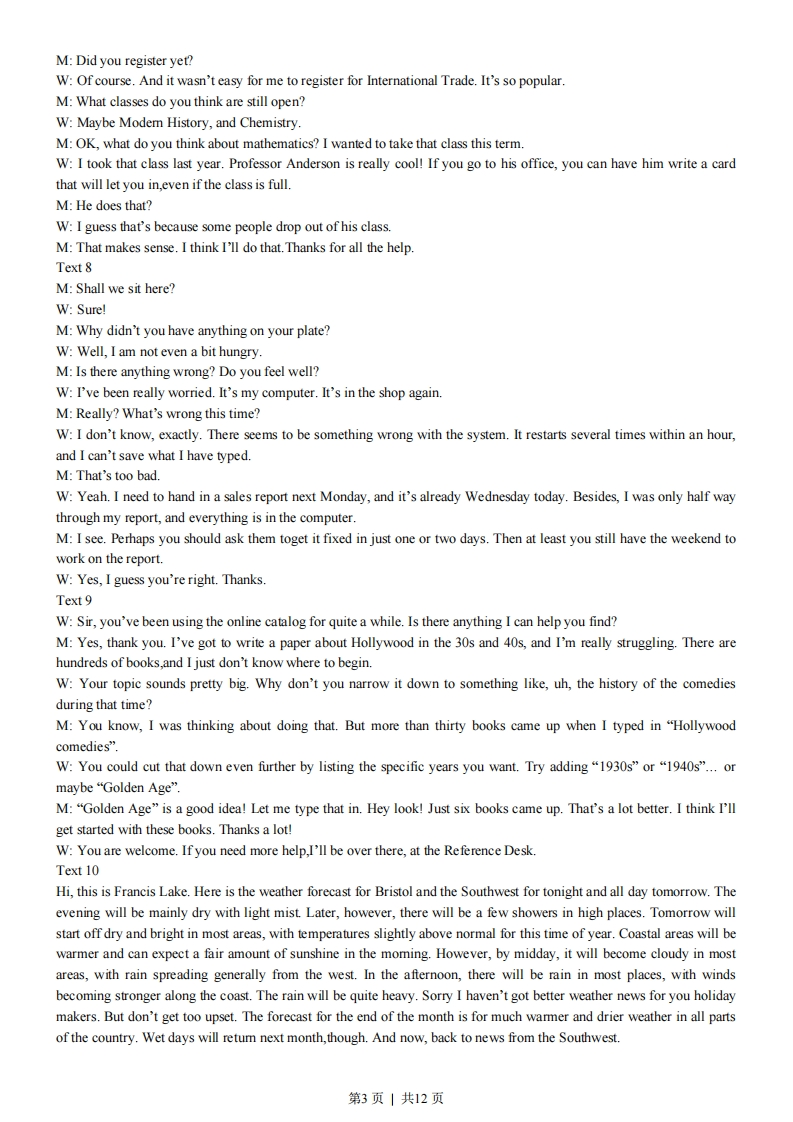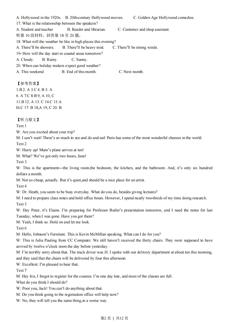 2016年10月浙江省高考英语试题姓名:准考证号:第一部分听力(共两节,满分30分)做题时先将答案标在试卷上。录音内容结束后,你将有两分钟的时间将试卷上的答案转涂到答题纸上。第一节(共5小题:每小题1.5分,满分7.5分)听下面5段对话。每段对话后有一个小题,从题中所给的A、B、C三个选项中选出最佳选项,并标在试卷的相应位置。听完每段对话后,你都有10秒钟的时间来回答有关小题和阅读下一小题。每段对话仅读一遍。例:How much is the shirt?A.£19.15.B.£9.18.C.£9,5.答案是C。1.What is the man planning to do?A,Make some cheese.B,Go on a trip,C.Find a job in Paris.2.What is the time now?A.8 o'clock.B.10 o'clock.C.12 o'clock3.What are the speakers talking about?A.A local artist.B.The man's salary.C.An apartment to let.4.How does Dr.Heath spend most of his time?A.Giving lectures.B.Conducting research.C.Doing office work,5.Why does Elaine call Peter?A.To borrow his notes.B.To explain her absence.C.To discuss the presentation第二节(共15小题:每小题1.5分,满分22.5分)听下面5段对话或独白。每段对话或独白后有几个小题,从题中所给的A、B、C三个选项中选出最佳选项,并标在试卷的相应位置。听每段对话或独白前,你将有时间阅读各个小题,每小题5秒钟听完后,各小题将给出5秒钟的作答时间。每段对话或独白读两遍。听第6段材料,回答第6、7题。6.What is Julia doing?A.Asking about her order.B.Reporting a computer problem.C.Confirming a visit to a company.7.When will the chairs arrive today?A.At about 10 am,B,Around 12 noon.C.By 4 pm.听第7段材料,回答第8至10题。8.What is the conversation mainly about?A.Course design.B.Course registration.C.Course evaluation.9.What course did the woman choose?A.International Trade.B.Modem History C.Chemistry.10.What will Jack do to take mathematics?A.Watt for an opening.B.Apply to the departmentC.Speak to Professor Anderson.听第8段材料,回答第11至13题。11.Where does the conversation probably take place?A.In a shop.B.In a canteen.C.In an office12.What bothers the woman?A.Her computer is down.B.Her paper is missing.C.Her hand is aching.13.When is the woman's report due?A.Wednesday.B.Friday.C.Next Monday.听第9段材料,回答第14至17题。14.What is the man doing?A.Writing a book.B.Preparing a lecture.C.Searching for references,15.What does the woman suggest the man do?A.Make his topic more specific.B.Get a complete reading listC.Read at least six books.16.What is the roan going to focus on?第1页|共12页A.Hollywood in the 1920s.B.20th-century Hollywood movies.C.Golden Age Hollywood comedies.17.What is the relationship between the speakers?A.Student and teacher B.Reader and librarian.C.Customer and shop assistant.听第10段材料,回答第18至20题,18.What will the weather be like in high places this evening?A.There'll be showers.B.There'll be heavy mist.C.There'll be strong winds.19-How will the day start in coastal areas tomorrow?A.Cloudy.B.Rainy.C.Sunny.20.When can holiday makers expect good weather?A.This weekendB.End of this month.C.Next month.【参考答案】1.B2.A3.C4.B5.A6.A7.C8.B9,A10,C11.B12.A13.C14.C15.AI6.C17.B18,A19,C20.B【听力原文】Text 1W:Are you excited about your trip?M:I can't wait!There's so much to see and do and eat!Paris has some of the most wonderful cheeses in the world.Text 2W:Hurry up!Mum's plane arrives at ten!M:What?We've got only two hours,Jane!Text 3W:This is the apartment-the living room,the bedroom,the kitchen,and the bathroom.And,it's only six hundreddollars a month.M:Not so cheap,actually.But it's quiet,and should be a nice place for an artist.Text4W:D
