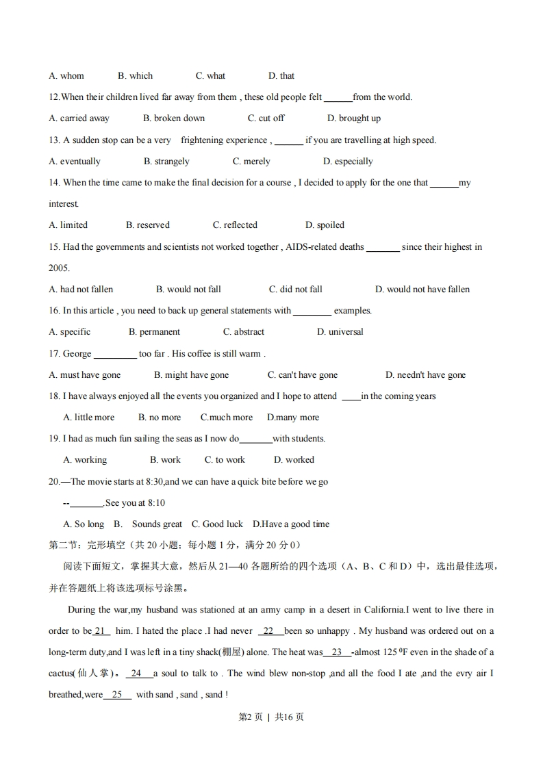 绝密★启封前2016普通高等学校招生全国统一考试(浙江卷)英语选择题部分(共80分)第一部分:英语知识运用(共两节,满分30分)第一节:单项填空(共20小题:每小题0.5分,满分10分)从A、B、C和D四个选项中,选出可以填入空白处的最佳选项,并在答题纸上将该选项标号涂黑。1.--Are you sure you're ready for the best?I'm well prepared for it.A.I'm afraid notB.No problemC.Hard to sayD.Not really2.prize for the winner of the competition is two-week holiday in Paris.A.The;不填B.A;不填C.A:theD.The;a3.In many ways,the education system in the US is not very different fromin the UK.A.thatB.thisC.oneD.it4.It is important to pay your electricity bill on time,as late payments may affect yourA.conditionB.incomeC.creditD.status5online shopping has changed our life,not all of its effects have been positive.A.SinceB.AfterC.WhileD.Unless6.That young man is honest,cooperative,always there when you need his helphe's reliable.A.Or elseB.In shortC.By the wayD.For one thing7.The study suggests that the cultures we grow upinfluence the basic processes by which we see worldaround us.A.onB.inC.atD.about8.We can achieve a lot when we learn to let our differences unite,rather thanA.divideB.rejectC.controlD.abandon9.Silkone of the primary goods traded along the Silk Road by about 100 BC.A.had becomeB.rejectC.controlD.abandon10.To retum to the problem of water pollution,I'd like you to look at a studyin Australia in 2012A.having conductedB.to be conductedC.conductingD.conducted11.Scientists have advanced many theories about why human beings cry tears,none ofhas been proved.第1页|共16页A.whomB.whichC.whatD.that12.When their children lived far away from them,these old people feltfrom the world.A.carried awayB.broken downC.cut offD.brought up13.A sudden stop can be a very frightening experience,.if you are travelling at high speed.A.eventuallyB.strangelyC.merelyD.especially14.When the time came to make the final decision for a course,I decided to apply for the one thatmyinterest.A.limitedB.reservedC.reflectedD.spoiled15.Had the govemments and scientists not worked together,AIDS-related deathssince their highest in2005.A.had not fallenB.would not fallC.did not fallD.would not have fallen16.In this article,you need to back up general statements withexamplesA.specificB.permanentC.abstractD.universal17.Georgetoo far.His coffee is still warmA.must have goneB.might have goneC.can't have goneD.needn't have gone18.I have always enjoyed all the events you organized and I hope to attend in the coming yearsA.little moreB.no moreC.much more D.many more19.I had as much fun sailing the seas as I now dowith students.A.workingB.workC.to workD.worked20.-The movie starts at 8:30,and we can have a quick bite before we go.See you at 8:10A.So long B.Sounds great C.Good luck D.Have a good time第二节:完形填空(共20小题:每小题1分,满分20分0)阅读下面短文,掌握其大意,然后从21一40各题所给的四个选项(A、B、C和D)中,选出最佳选项,并在答题纸上将该选项标号涂黑。During the war,my husband was stationed at an ammy camp in a desert in California.I went to live there inorder to be 21 him.I hated the place.I had never 22 been so unhappy.My husband was ordered out on along-term duty,and I was left in a tiny shack()alone.The hea