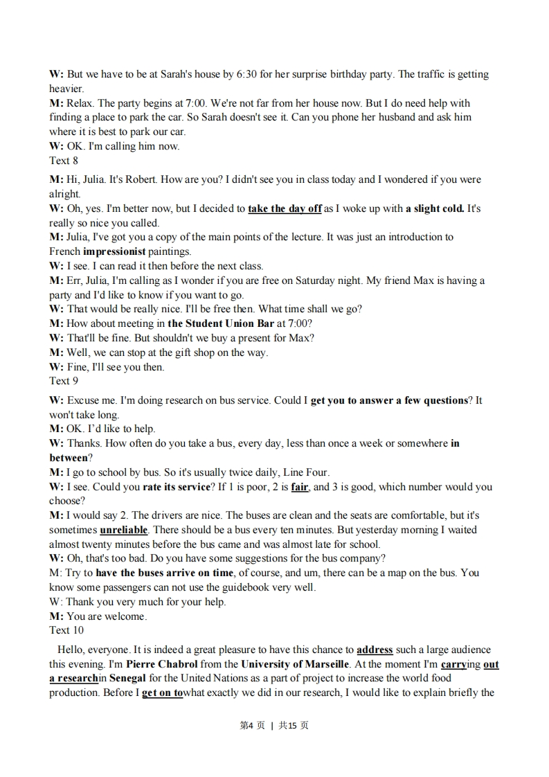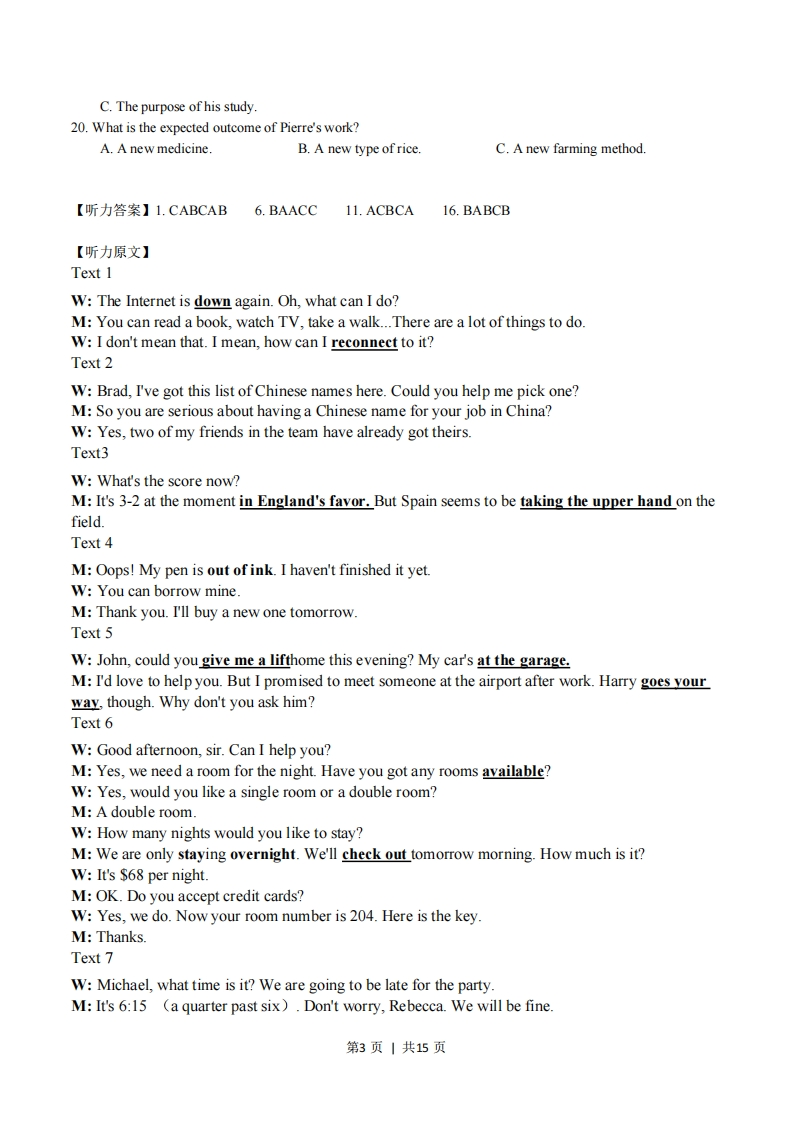 绝密★启用前2018年下半年普通高等学校招生全国统一考试英语姓名准考证号本试题卷分选择题和非选择题两部分。全卷共12页,选择题部分1至9页,非选择题部分10至12页。满分150分,考试时间120分钟。考生注意:1.答题前,请务必将自己的姓名、准考证号用黑色字迹的签字笔或钢笔分别填写在试题卷和答题纸规定的位置上。2.答题时,请按照答题纸上“注意事项”的要求,在答题纸相应的位置上规范作答在本试题卷上的作答一律无效。选择题部分第一部分听力(共两节,满分30分)做题时,先将答案标在试卷上。录音内容结束后,你将有两分钟的时间将试卷上的答案转涂到答题纸上。第一节(共5小题:每小题1.5分,满分75分)听下面5段对话。每段对话后有一个小题,从题中所给的A、B、C三个选项中选出最佳选项,并标在试卷的相应位置。听完每段对话后,你都有10秒钟的时间来回答有关小题和阅读下一小题。每段对话仅读一遍。例:How much is the shirt?A.£9.15B.£9.18C.£9.15.答案是C1.What does the woman want to do?A.Watch TV.B.Go for a walk.C.Access the Internet.2.Why would the woman like to have a Chinese name?A.She is taking a Chinese class.B.She will be working in ChinaC.She has made some Chinese friends.3.What are the speakers talking about?A.A travel plan.B.An exam result.C.A sports game.4.What has the man been doing?A.Writing something.B.Repairing his pen.C.Shopping.5.What does John suggest the woman do?A.Meet his friend.B.Ask Harry for help.C.Go to the airport with him.第二节(共15小题:每小题1.5分,满分22.5分)听下面5段对话或独白。每段对话或独白后有几个小题,从题中所给的A、B、C三个选项中选出最佳第1页|共15页选项,并标在试卷的相应位置。听每段对话或独白前,你将有时间阅读各个小题,每小题5秒钟:听完后,各小题将给出5秒钟的作答时间。每段对话或独白读两遍。听第6段材料,回答第6、7题。6.Where are the speakers?A.In a bank.B.Ina hotel.C.In a restaurant.7.How much does the man need to pay?A.$68B.$136.C.$204听第7段材料,回答第8至10题。8.Whose birthday is it?A.Sarah'sB.Michael's.C.Rebecca's.9.When will the birthday party begin?A.At6:15.B.At6:30C.At7:0010.What does the man want to know?A.What to buy.B.Who to call.C.Where to park.听第8段材料,回答第11至13题。11.Why was Julia absent from the class?A.She was ill.B.She got up late.C.She went to a party.12.What has Robert got for Julia?A.Textbooks.B.Oil paintings.C.Lecture notes.13.Where will the speakers meet on Saturday?A.At Robert's home.B.At a bar.C At a shop.听第9段材料,回答第14至17题。14.What is the woman doing?A.Attending a seminar.B.Giving some advice.C.Doing an interview.15.How often does the man travel by bus?A.Twice a day.B.Every other day.C.Once a week.16.How does the man feel about the bus service?A.It's good.B.It's fair.C.It's poor.17.What improvement should the bus company make?A.Buses should be more punctual.B.Drivers should be more polite.C.Seats should be more comfortable.听第10段材料,回答第18至20题。18.Who is Pierre?A.A doctor from SenegalB.A university researcher.C.A United Nations official.19.What does Pierre mainly talk about?A.Food supplies in the world.B.The role that the UN plays.第2页|共15页C.The purpose of his study.20.What is the expected outcome of Pierre's work?A.A new medicine.B.A new type of rice.C.A new farming method.【听力答案】1.CABCAB6.BAACC11.ACBCA16.BABCB【听力原文】Text 1W:The Internet is down again.Oh,what can I do?M:You can read a book,watch TV,take a walk...There are a lot of things to do.W:I don't mean that.I mean,how can I reconnect to it?Text 2W:Brad,I've got this list of Chinese names here.Could you help me pick one?M:So you are serious about having a Chinese name for your job in China?W:Yes,two of my friends in the team have already got theirs.Text3W:What's the score now?M:It's 3-2 at the moment in England's