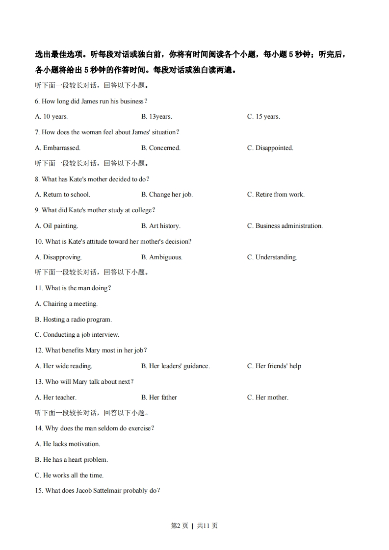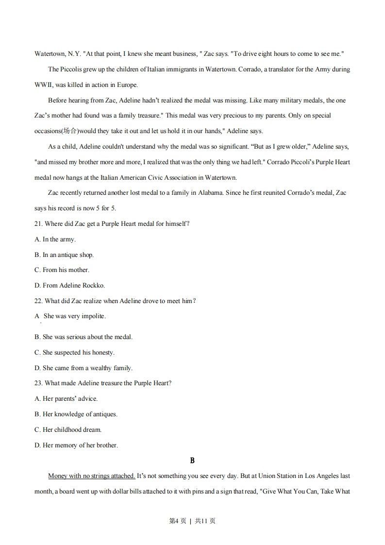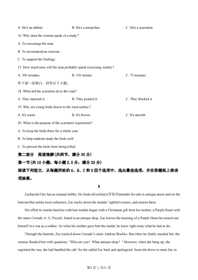 2019年6月普通高等学校招生全国统一考试(浙江卷)英语选择题部分第一部分听力(共两节,满分30分)做题时,先将答案标在试卷上。录音内容结束后,你将有两分钟的时间将试卷上的答案转涂到答题纸上。第一节(共5小题:每小题1.5分,满分7.5分)听下面5段对话。每段对话后有一个小题,从题中所给的A、B、C三个选项中选出最佳选项。听完每段对话后,你都有10秒钟的时间来回答有关小题和阅读下一小题。每段对话仅读一遍。例:How much is the shirt?A.£19.15.B.f9.18.C.f9.15.答案是C。1.Where does this conversation take place?A.In a classroom.B.In a hospital.C.In a museum.2.What does Jack want to do?A.Take fitness classesB.Buy a pair of gym shoes.C.Change his work schedule.3.What are the speakers talking about?A.What to drink.B.Where to meetC.When to leave4.What is the relationship between the speakers?A.Colleges.B.Classmates.C.Strangers.5.Why is Emily mentioned in the conversation?A.She might want a ticket.B.She is looking for the manC.She has an extra ticket第二节(共15小题,每小题1.5分,满分22.5分)听下面5段对话或独白。每段对话或独白后有几个小题,从题中所给的A、B、C三个选项中第1页|共11页选出最佳选项。听每段对话或独白前,你将有时间阅读各个小题,每小题5秒钟;听完后,各小题将给出5秒钟的作答时间。每段对话或独白读两遍。听下面一段较长对话,回答以下小题。6.How long did James run his business?A.10 years.B.13years.C.15 years.7.How does the woman feel about James'situation?A.Embarrassed.B.Concemed.C.Disappointed.听下面一段较长对话,回答以下小题。8.What has Kate's mother decided to do?A.Retum to school.B.Change her jobC.Retire from work.9.What did Kate's mother study at college?A.Oil painting.B.Art history.C.Business administration.10.What is Kate's attitude toward her mother's decision?A.DisapprovingB.AmbiguousC.Understanding听下面一段较长对话,回答以下小题。11.What is the man doing?A.Chairing a meeting.B.Hosting a radio program.C.Conducting a job interview.12.What benefits Mary most in her job?A.Her wide reading.B.Her leaders'guidance.C.Her friends'help13.Who will Mary talk about next?A.Her teacherB.Her fatherC.Her mother.听下面一段较长对话,回答以下小题。14.Why does the man seldom do exercise?A.He lacks motivation.B.He has a heart problem.C.He works all the time15.What does Jacob Sattelmair probably do?第2页|共11页A.He's an athlete.B.He's a researcher.C.He's a journalist.16.Why does the woman speak of a study?A.To encourage the man.B.To recommend an exercise.C.To support her findings.17.How much time will the man probably spend exercising weekly?A.300 minutes.B.150 minute.C.75 minutes.听下面一段独白,回答以下小题。18.What did the scientists do to the road?A.They repaired it.B.They painted it.C.They blocked it19.Why are young birds drawn to the road surface?A.It's warm.B.It's brown.C.It's smooth.20.What is the purpose of the scientists'experiment?A.To keep the birds there for a whole year.B.To help students study the birds well.C.To prevent the birds from being killed.第二部分阅读理解(共两节,满分35分)第一节(共10小题:每小题2.5分,满分25分)阅读下列短文,从每题所给的A、B、C和D四个选项中,选出最佳选项,并在答题纸上将该项涂黑。以Zachariah Fike has an unusual hobby.He finds old military()medals for sale in antique stores and on theInternet.But unlike most collectors,Zac tracks down the medals'rightful owners,and returns them.His effort to reunite families with lost medals began with a Christmas gift from his mother,a Purple Heart withthe name Corrado A.G.Piccoli,found in an antique shop.Zac knows the meaning of a Purple Heart-he eamed onehimself in a war as a