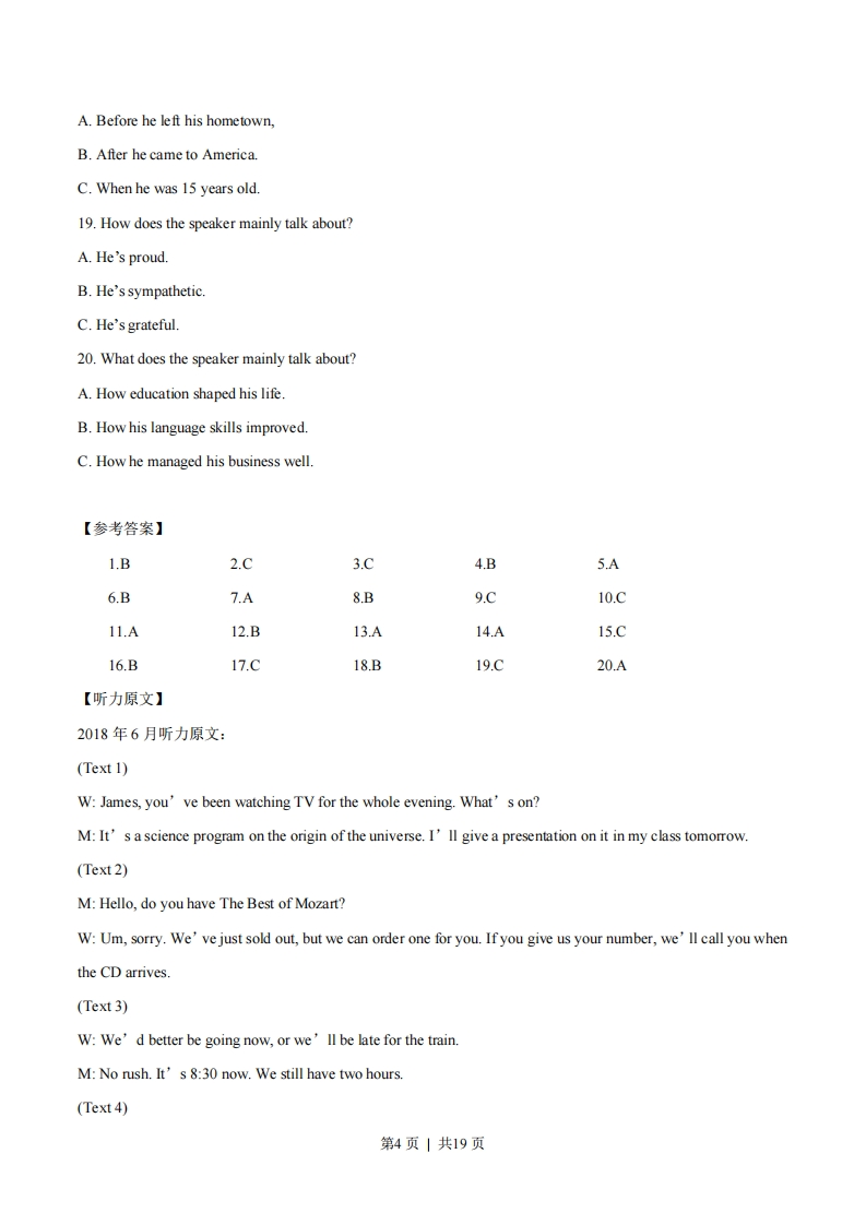 绝密★启用前2018年6月普通高等学校招生全国统一考试(浙江卷)英语选择题部分第一部分听力(共两节,满分30分)做题时,先将答案标在试卷上。录音内容结束后,你将有两分钟的时间将试卷上的答案转涂到答题纸上。第一节(共5小题:每小题1.5分,满分7.5分)听下面5段对话。每段对话后有一个小题,从题中所给的A、B、C三个选项中选出最佳选项,并标在试卷的相应位置。听完每段对话后,你都有10秒钟的时间来回答有关小题和阅读下一小题。每段对话仅读一遍。1.What will James do tomorrow?A.Watch a TV program.B.Give a talk.C.Write a report.2.What can we say about the woman?A.She's generous.B.She's curious.C.She's helpful.3.When does the train leave?A.At6:30B.At8:30.C.At10:304.How does the woman go to work?A.By car.B.On foot.C.By bike.5.What is the probable relationship between the speakers?A.Classmates.第1页|共19页B.Teacher and student.C.Doctor and patient.第二节(共15小题:每小题1.5分,满分22.5分)听下面5段对话或独白。每段对话或独白后有几个小题,从题中所给的A、B、C三个选项中选出最佳选项,并标在试卷的相应位置。听每段对话或独白前,你将有时间阅读各个小题,每小题5秒钟:听完后,各小题将给出5秒钟的作答时间。每段对话或独白读两遍。听第6段材料,回答第6、7题。6.What does the woman regret?A.Giving up her research.B.Dropping out of college.C.Changing her major.7.What is the woman interested in studying now?A.Ecology.B.Education.C.Chemistry.听第7段材料,回答第8、9题。8.What is the man?A.A hotel manager.B.A tour guideC.A taxi driver.9.What is the man doing for the woman?A.Looking for some local foodsB.Showing her around the seaside.C.Offering information about a hotel.听第8段材料,回答第10至12题。10.Where does the conversation probably take place?A.In an officeB.At home.C.At a restaurant11.What will the speakers do tomorrow evening?第2页|共19页A.Go to a concert.B.Visit a friend.C.Work extra hours.12.Who is Alice going to call?A.Mike.B.Joan.C.Catherine.听第9段材料,回答第13至16题。13.Why does the woman meet the man?A.To look at an apartment.B.To deliver some fumiture.C.To have a meal together.14.What does the woman like about the carpet?A.Its color.B.Its design.C.Its quality.15.What does the man say about the kitchen?A.It's a good size.B.It's newly painted.C.It's adequately equipped.16.What will the woman most probably do next?A.Go downtown.B.Talk with her friend.C.Make payment.听第10段材料,回答第17至20题。17.Who is the speaker probably talking to?A.Movie fans.B.News reporters.C.College students.18.When did the speaker take English classes?第3页|共19页
