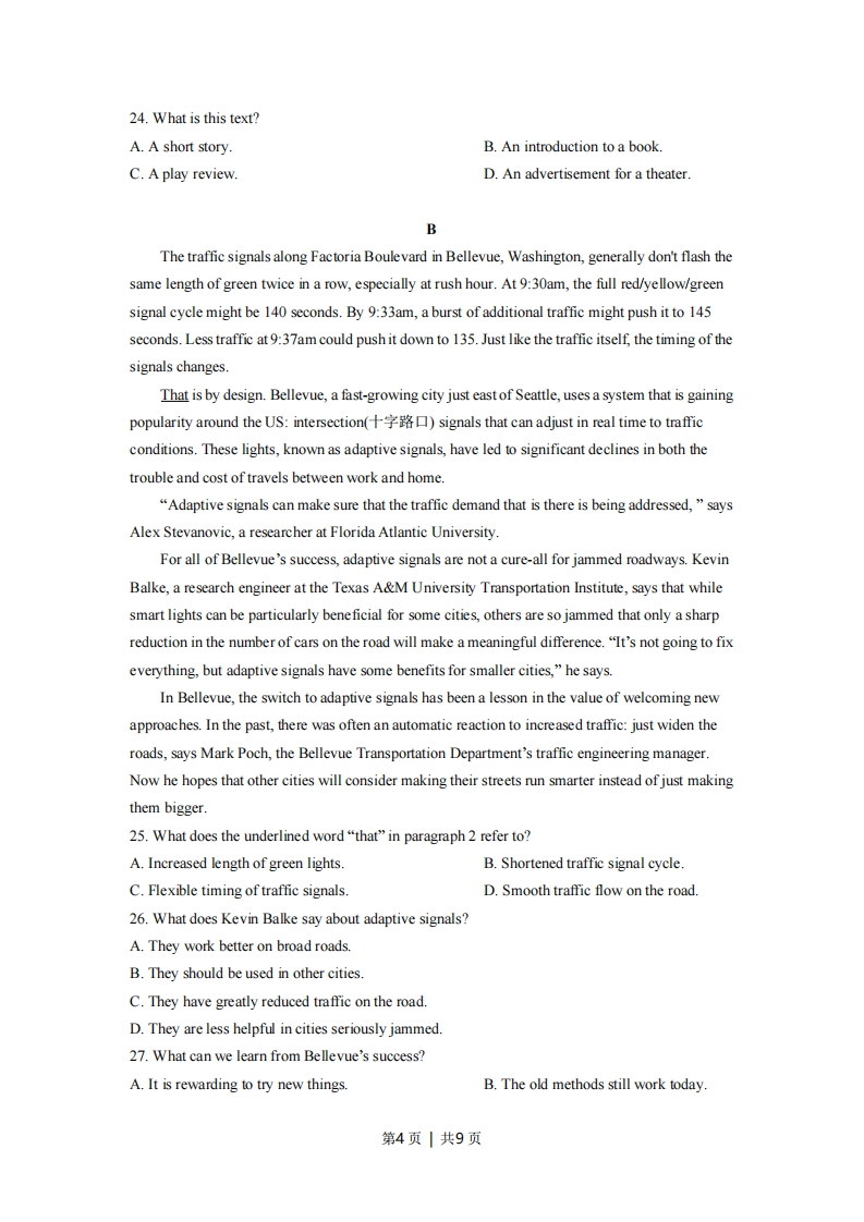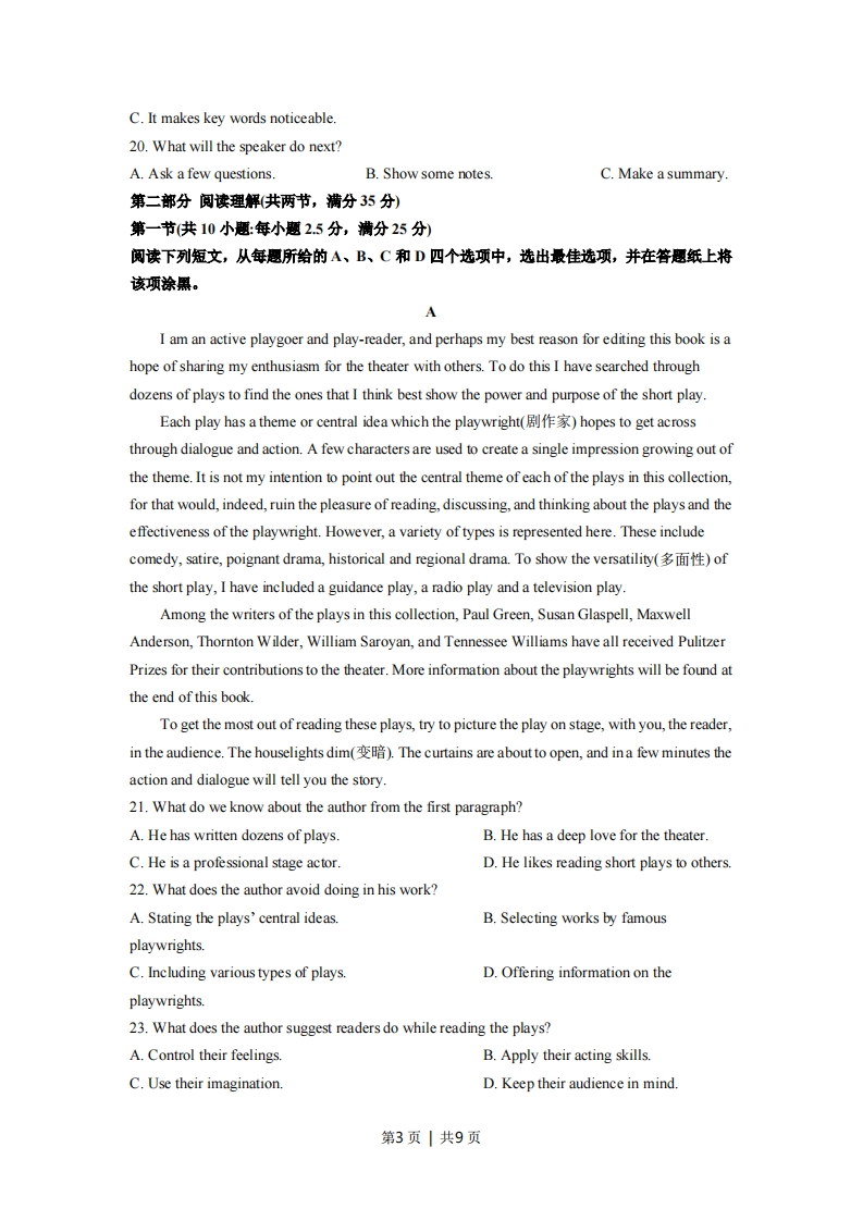 2020年全国统一高考英语试题(浙江卷)选择题部分第一部分听力(共两节,满分30分)做题时,先将答案标在试卷上。录音内容结束后,你将有两分钟的时间将试卷上的答案转涂到答题纸上。第一节(共5小题:每小题15分,满分7.5分)听下面5段对话。每段对话后有一个小题,从题中所给的A、B、C三个选项中选出最佳选项,并标在试卷的相应位置。听完每段对话后,你都有10秒钟的时间来回答有关小题和阅读下一小题。每段对话仅读一遗。例:How much is the shirt?A.£19.15.B.£9.18.C.9.15.答案是C。1.What will the speakers do tonight?A.Visit MaryB.Go out of town.C.Host a dinner.2.How does the woman go to work this week?A.By car.B.By bike.C.On foot.3.What time does Dave's meeting start?AAt8:30.B.At900.C.At10:004.What is Helen going to do?A.Buy some books.B.Study in the library.C.Attend a historyclass.5.What is the woman's feeling now?A.Relief.B.Regret.C.Embarrassment.【原文】本题为听力题,解析略。第二节(共15小题:年小题15分,满分22.5分)听下面5段对话或独白。每段对话或独白后有几个小题,从题中所给的A、B、C三个选项中选出最佳选项,并标在试卷的相应位置。听每段对话或独白前,你将有时间阅读各个小题,每小题5秒钟:听完后,各小题将给出5秒钟的作答时间。每段对话或独白读两遍。听下面一段较长对话,回答以下小题。6.What is Tom busy doing?A.Raising money.B.Writing a lab report.C.Giving classes tochildren.7.Who might be able to help Tom this week?A.MikeB.Cathy.C.Jane.听下面一段较长对话,回答以下小题。8.Why is Jack leaving early?第1页|共9页A.To avoid getting stuck in trafficB.To enjoy the scenery on the wayC.To buy some gifts for his family9.What does Judy often do at the railway station?A.Read books.B.Call some friends.C.Look around theshops.10.What are the speakers mainly talking about?A.What to do next year.B.Where to go for vacations.C.How to pass the waiting time.听下面一段较长对话,回答以下小题。11.Why does Bill look troubled?A.He is short of moneyB.He has made a big mistake.C.He is facing a tough choice.12.What is Bill now?A.A college student.B.An army officer.C.A computerengineer.13.What does the woman seem to suggest Bill do?A.Learn to repair cars.B.Decline the job offer.C.Ask his uncle foradvice.听下面一段较长对话,回答以下小题。14.What is the woman recommending to the man?A.A writer.B.A club.C.A course.15.What is the woman reading now?A.The Beautiful Mind.B.The Great Gatsby.C.The Kite Runner.16.How much time does the man have to read the book?A.Two weeks.B.Three weeks.C.Four weeks.听下面一段独白,回答以下小题。17.What is the speaker doing?A.Reporting a study.B.Chairing a meeting.C.Teaching a class.18.What should you pay most attention to when taking notes?A.Listening.B.Reading.C.Writing.19.What is an advantage of using symbols in note-taking?A.It keeps information secret.B.It leaves space for future use.第2页|共9页C.It makes key words noticeable.20.What will the speaker do next?A.Ask a few questionsB.Show some notes.C.Make a summary第二部分阅读理解(共两节,满分35分)第一节共10小题:每小题2.5分,满分25分)阅读下列短文,从每题所给的A、B、C和D四个选项中,选出最佳选项,并在答题纸上将该项涂黑。I am an active playgoer and play-reader,and perhaps my best reason for editing this book is ahope of sharing my enthusiasm for the theater with others.To do this I have searched throughdozens of plays to find the ones that I think best show the power and purpose of the short play.Each play has a theme or central idea which the playwright()hopes to get acrossthrough dialogue and action.A few characters are used to create a single impression growing out ofthe theme.It is not my intention to point out the central the