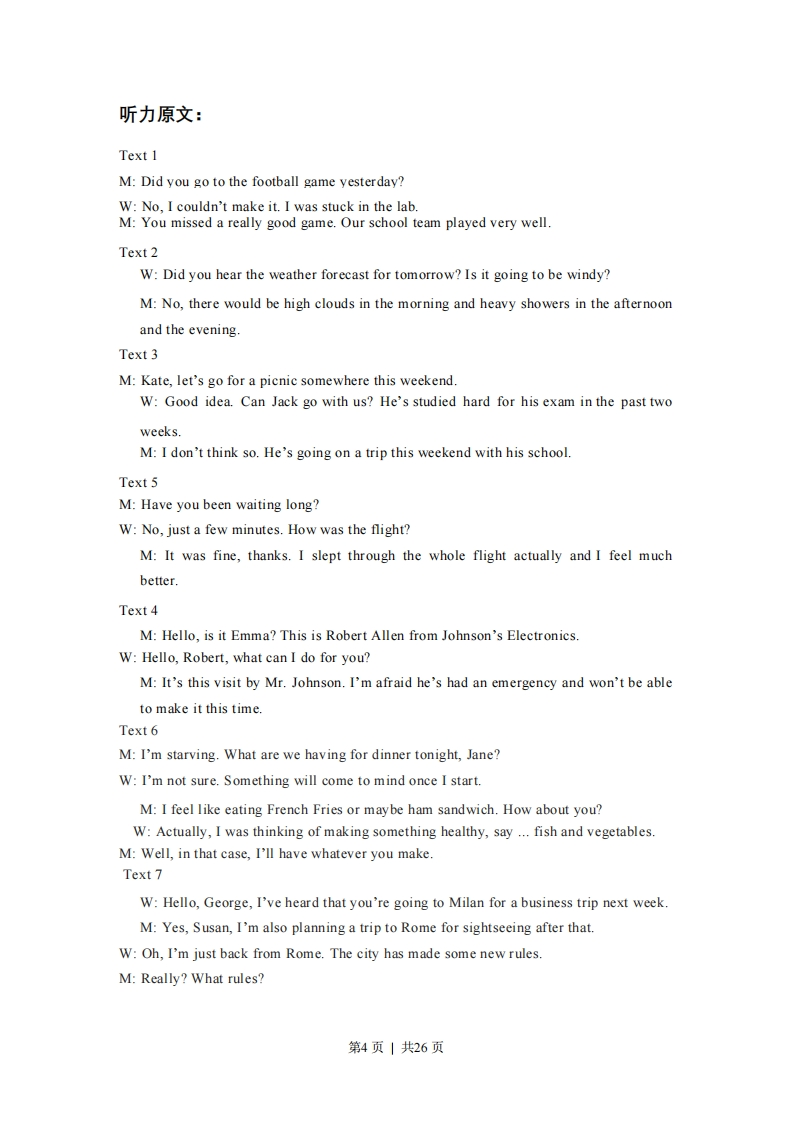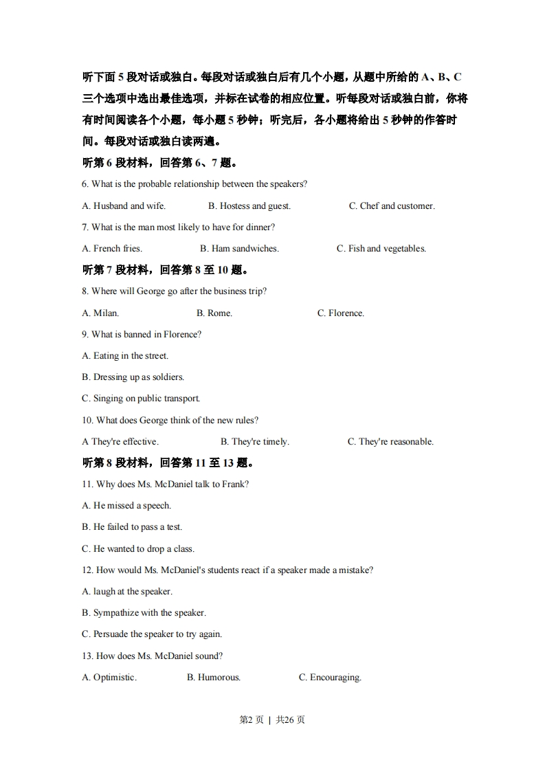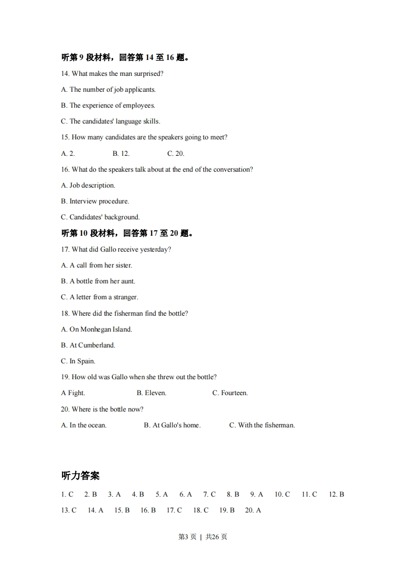 2021年1月浙江省普通高校招生学考科目考试英语试题及答案第一部分听力(共两节,满分30分)做题时,先将答案标在试卷上。录音内容结束后,你将有两分钟的时间将试卷上的答案转涂到答题纸上。第一节(共5小题;每小题1.5分,满分7.5分)听下面5段对话。每段对话后有一个小题,从题中所给的A、B、C三个选项中选出最佳选项,并标在试卷的相应位置。听完每段对话后,你都有10秒钟的时间来回答有关小题和阅读下一小题。每段对话仅读一遍。例:How much is the shirt?A.19.15.B.f9.18.C.9.15.答案是C。1.What did the woman do yesterday?A.She played football.B.She watched a game.C She worked in the lab2.What will the weather be like tomorrow evening?A.Cloudy.B.Rainy.C.Windy.3.What will Jack do this weekend?A.Go on a school trip.B.Have a family picnic.C.Prepare for an exam.4.Why does the man make the call?A.To arrange a meeting.B.To cancel a visit.C.To ask for assistance5.How does the man feel now?A.Refreshed.B.AnxiousC.Sleepy.第二节(共15小题;每小题1.5分,满分22.5分)第1页1共26页听下面5段对话或独白。每段对话或独白后有几个小题,从题中所给的A、B、C三个选项中选出最佳选项,并标在试卷的相应位置。听每段对话或独白前,你将有时间阅读各个小题,每小题5秒钟;听完后,各小题将给出5秒钟的作答时间。每段对话或独白读两遍。听第6段材料,回答第6、7题。6.What is the probable relationship between the speakers?A.Husband and wife.B.Hostess and guest.C.Chef and customer.7.What is the man most likely to have for dinner?A.French friesB.Ham sandwichesC.Fish and vegetables.听第7段材料,回答第8至10题。8.Where will George go after the business trip?A.Milan.B.Rome.C.Florence.9.What is banned in Florence?A.Eating in the street.B.Dressing up as soldiers.C.Singing on public transport.10.What does George think of the new rules?A They're effective.B.They're timelyC.They're reasonable听第8段材料,回答第11至13题。11.Why does Ms.McDaniel talk to Frank?A.He missed a speech.B.He failed to pass a test.C.He wanted to drop a class.12.How would Ms.McDaniel's students react if a speaker made a mistake?A.laugh at the speaker.B.Sympathize with the speaker.C.Persuade the speaker to try again.13.How does Ms.McDaniel sound?A.Optimistic.B.Humorous.C.Encouraging.第2页|共26页听第9段材料,回答第14至16题。14.What makes the man surprised?A.The number of job applicants.B.The experience of employees.C.The candidates'language skills.15.How many candidates are the speakers going to meet?A.2.B.12.C.20.16.What do the speakers talk about at the end of the conversation?A.Job description.B.Interview procedure.C.Candidates'background听第10段材料,回答第17至20题。17.What did Gallo receive yesterday?A.A call from her sister.B.A bottle from her auntC.A letter from a stranger.18.Where did the fisherman find the bottle?A.On Monhegan Island.B.At Cumberland.C.In Spain.19.How old was Gallo when she threw out the bottle?A Fight.B.Eleven.C.Fourteen.20.Where is the bottle now?A.In the ocean.B.At Gallo's home.C.With the fisherman.听力答案1.C2.B3.A4.B5.A6.A7.C8.B9.A10.C11.C12.B13.C14.A15.B16.B17.C18.C19.B20.A第3页|共26页