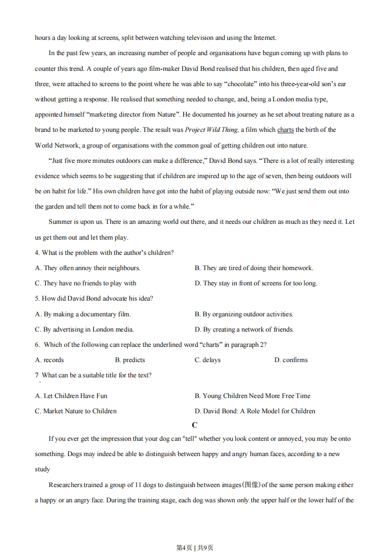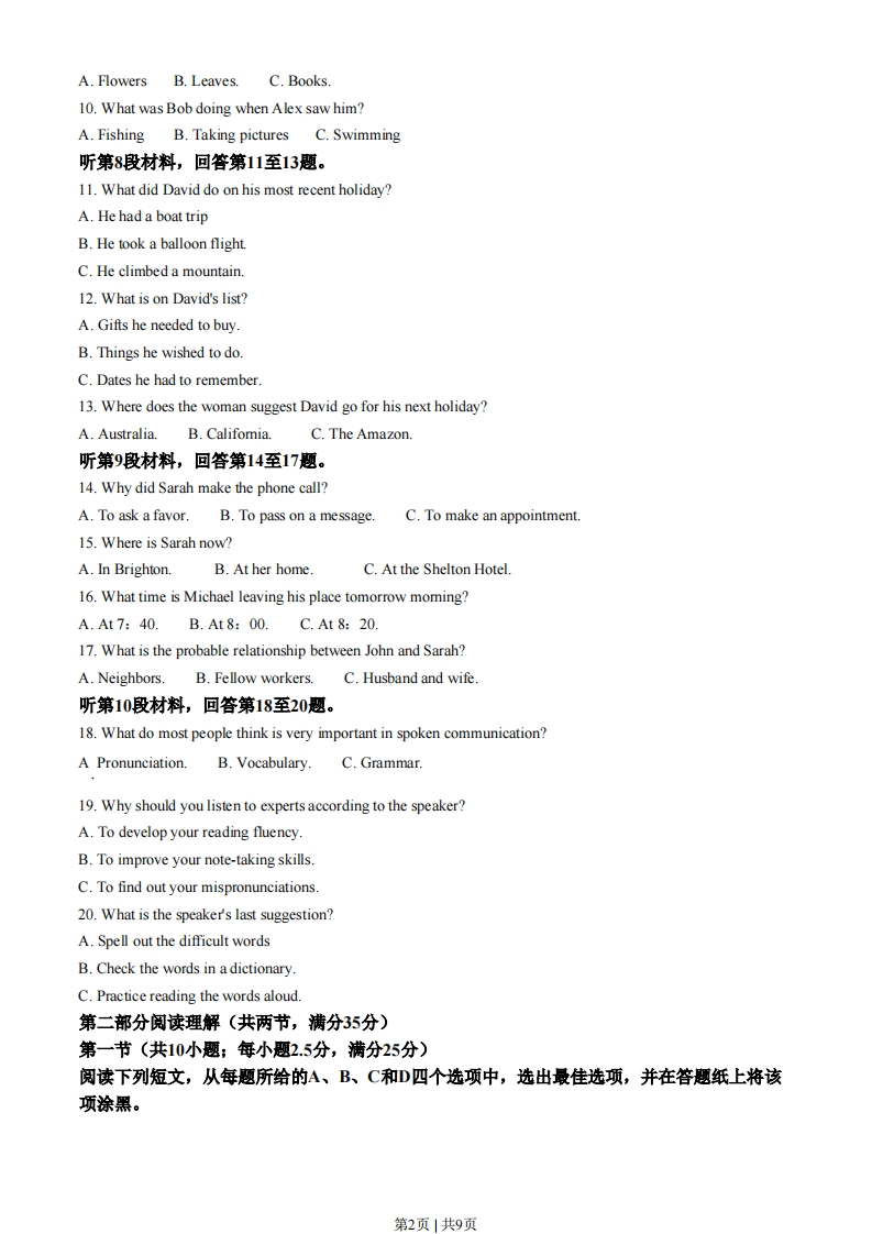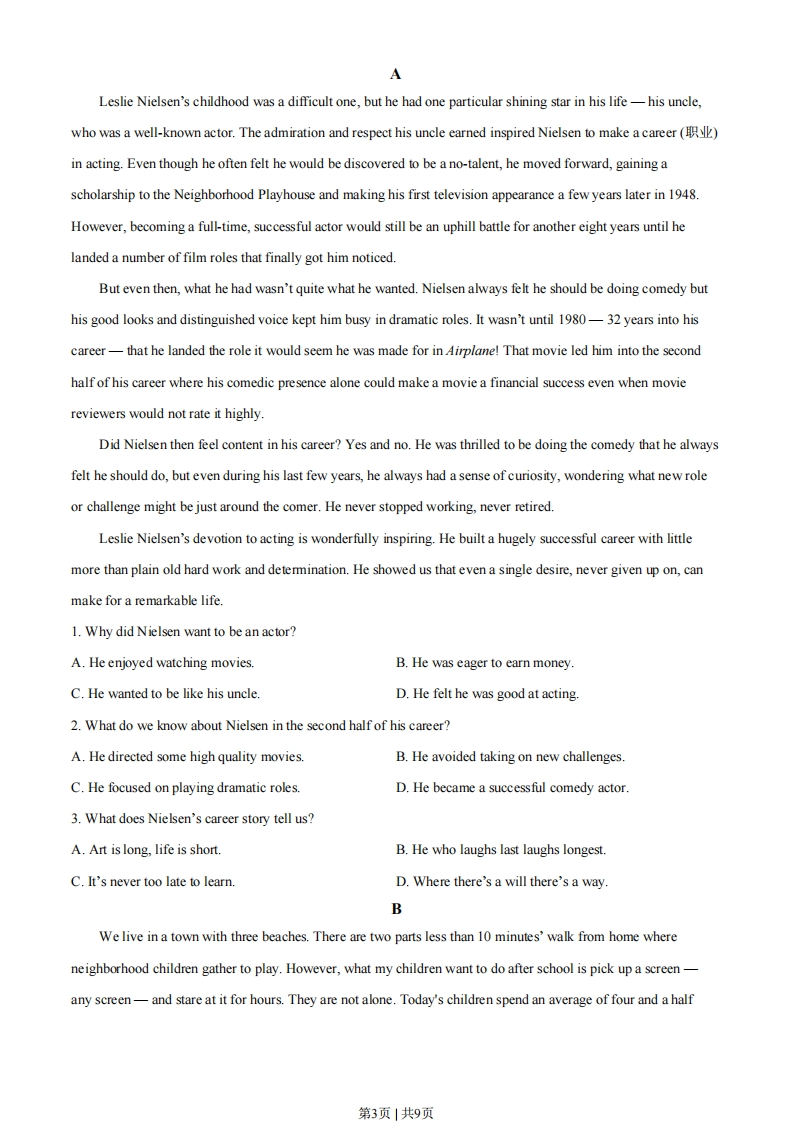 2021年高考浙江卷英语试题第一部分听力(共两节,满分30分)做题时,先将答案标在试卷上。录音内容结束后,你将有两分钟的时间将试卷上的答案转涂到答题纸上第一节(共5小题;每小题1.5分,满分7.5分)听下面5段对话。每段对话后有一个小题,从题中所给的A、B、C三个选项中选出最佳选项,并标在试卷的相应位置。听完每段对话后,你都有10秒钟的时间来回答有关小题和阅读下一小题。每段对话仅读一遍。例:How much is the shirt?A.£19.15.B.9.18.C.9.15.答案是C1.Why did the woman go to Mallorca?A.To teach SpanishB.To look for a jobC.To see a friend.2.What does the man ask the woman to do?A.Take him to hospital.B.Go to a class with him.C.Submit a report for him.3.Who will look after the children?A.Jennifer.B.Suzy.C.Marie.4.What are the speakers going to do?A.Drive home.B.Go shopping.C.Eat out5.What are the speakers talking about?A.How to fry fish.B.How to make coffee.C.How to remove a bad smell第二节(共15小题;每小题1.5分,满分22.5分)听下面5段对话或独白。每段对话或独白后有几个小题,从题中所给的A、B、C三个选项中选出最佳选项,并标在试卷的相应位置。听每段对话或独白前,你将有时间阅读各个小题,每小题3秒钟:听完后,各小题将给出5秒钟的作答时间。每段对话或独白读两遍。听第6段材料,回答第6、7题。6.When does Gomez watch a football game on TV?A.When he fails to get a ticket.B.When the stadium is crowdedC.When his friends are too busy.7.How much did Gomez pay for the football game last time?A.$20B.$25.C.$50听第7段材料,回答第8至10题。8.What did Alex do in the aftemoon?A.He bad a walk.B.He went huntingC.He planted trees9.What did Alex bring back?第1页|共9页A.Flowers B.Leaves.C.Books10.What was Bob doing when Alex saw him?A.Fishing B.Taking pictures C.Swimming听第8段材料,回答第11至13题。11.What did David do on his most recent holiday?A.He had a boat tripB.He took a balloon flightC.He climbed a mountain.12.What is on David's list?A.Gifts he needed to buy.B.Things he wished to do.C.Dates he had to remember.13.Where does the woman suggest David go for his next holiday?A.Australia.B.Califomia.C.The Amazon听第9段材料,回答第14至17题。14.Why did Sarah make the phone call?A.To ask a favor.B.To pass on a message.C.To make an appointment.15.Where is Sarah now?A.In Brighton.B.At her home.C.At the Shelton Hotel.16.What time is Michael leaving his place tomorrow moming?A.At7:40.B.At8:00.C.At8:20.17.What is the probable relationship between John and Sarah?A.Neighbors.B.Fellow workers.C.Husband and wife听第10段材料,回答第18至20题。18.What do most people think is very important in spoken communication?A PronunciationB.Vocabulary.C.Grammar19.Why should you listen to experts according to the speaker?A.To develop your reading fluency.B.To improve your note-taking skillsC.To find out your mispronunciations.20.What is the speaker's last suggestion?A.Spell out the difficult wordsB.Check the words in a dictionary.C.Practice reading the words aloud.第二部分阅读理解(共两节,满分35分)第一节(共10小题:每小题2.5分,满分25分)阅读下列短文,从每题所给的A、B、C和D四个选项中,选出最佳选项,并在答题纸上将该项涂黑。第2页1共9页ALeslie Nielsen's childhood was a difficult one,but he had one particular shining star in his life-his uncle,who was a well-known actor.The admiration and respect his uncle earned inspired Nielsen to make a career (in acting.Even though he often felt he would be discovered to be a no-talent,he moved forward,gaining ascholarship to the Neighborhood Playhouse and making his first television appearance a few years later in 1948.However,becoming a ful