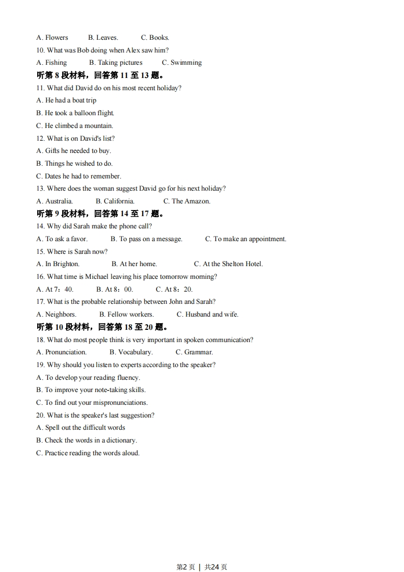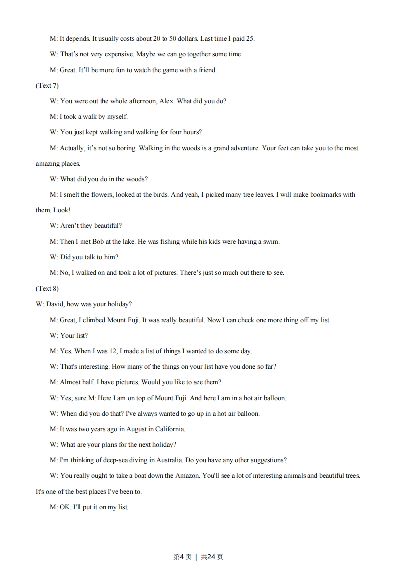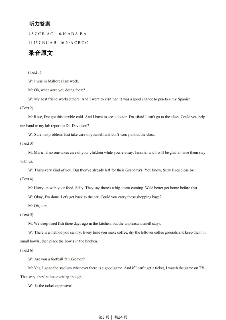 2021年高考浙江卷英语试题第一部分听力(共两节,满分30分)做题时,先将答案标在试卷上。录音内容结束后,你将有两分钟的时间将试卷上的答案转涂到答题纸上第一节(共5小题;每小题1.5分,满分7.5分)听下面5段对话。每段对话后有一个小题,从题中所给的A、B、C三个选项中选出最佳选项,并标在试卷的相应位置。听完每段对话后,你都有10秒钟的时间来回答有关小题和阅读下一小题。每段对话仅读一遍。例:How much is the shirt?A.£19.15.B.9.18.C.9.15答案是C1.Why did the woman go to Mallorca?A.To teach SpanishB.To look for a job.C.To see a friend.2.What does the man ask the woman to do?A.Take him to hospital.B.Go to a class with himC.Submit a report for him3.Who will look after the children?A.JenniferB.Suzy.C.Marie.4.What are the speakers going to do?A.Drive home.B.Go shopping.C.Eat out.5.What are the speakers talking about?A.How to fry fish.B.How to make coffee.C.How to remove a bad smell第二节(共15小题;每小题1.5分,满分22.5分)听下面5段对话或独白。每段对话或独白后有几个小题,从题中所给的A、B、C三个选项中选出最佳选项,并标在试卷的相应位置。听每段对话或独白前,你将有时间阅读各个小题,每小题3秒钟:听完后,各小题将给出5秒钟的作答时间。每段对话或独白读两遍。听第6段材料,回答第6、7题。6.When does Gomez watch a football game on TV?A.When he fails to get a ticket.B.When the stadium is crowdedC.When his friends are too busy7.How much did Gomez pay for the football game last time?A.$20B.$25.C.$50.听第7段材料,回答第8至10题。8.What did Alex do in the aftemoon?A.He bad a walk.B.He went huntingC.He planted trees9.What did Alex bring back?第1页|共24页A.FlowersB.Leaves.C.Books.10.What was Bob doing when Alex saw him?A.FishingB.Taking picturesC.Swimming听第8段材料,回答第11至13题。11.What did David do on his most recent holiday?A.He had a boat tripB.He took a balloon flightC.He climbed a mountain.12.What is on David's list?A.Gifts he needed to buy.B.Things he wished to do.C.Dates he had to remember.13.Where does the woman suggest David go for his next holiday?A.Australia.B.California.C.The Amazon听第9段材料,回答第14至17题。14.Why did Sarah make the phone call?A.To ask a favorB.To pass on a message.C.To make an appointment.15.Where is Sarah now?A.In Brighton.B.At her home.C.At the Shelton Hotel.16.What time is Michael leaving his place tomorrow moming?A.At7:40.B.At8:00C.At8:2017.What is the probable relationship between John and Sarah?A.Neighbors.B.Fellow workers.C.Husband and wife听第10段材料,回答第18至20题。18.What do most people think is very important in spoken communication?A.Pronunciation.B.Vocabulary.C.Grammar.19.Why should you listen to experts according to the speaker?A.To develop your reading fluency.B.To improve your note-taking skillsC.To find out your mispronunciations.20.What is the speaker's last suggestion?A.Spell out the difficult wordsB.Check the words in a dictionary.C.Practice reading the words aloud.第2页|共24页听力答案1-5CCB AC 6-10ABA BA11-15CBCAB 16-20ACBCC录音原文(Text 1)W:I was in Mallorca last week.M:Oh,what were you doing there?W:My best friend worked there.And I went to visit her.It was a good chance to practice my Spanish.(Text 2)M:Rose,I've got this terrible cold.And I have to see a doctor.I'm afraid I can't go to the class.Could you helpme hand in my lab report to Dr.Davidson?W:Sure,no problem.Just take care of yourself and don't worry about the class.(Text 3)M:Marie,if no one takes care of your children while you're away,Jennifer and I wi