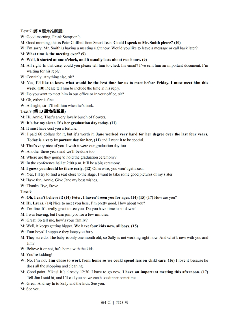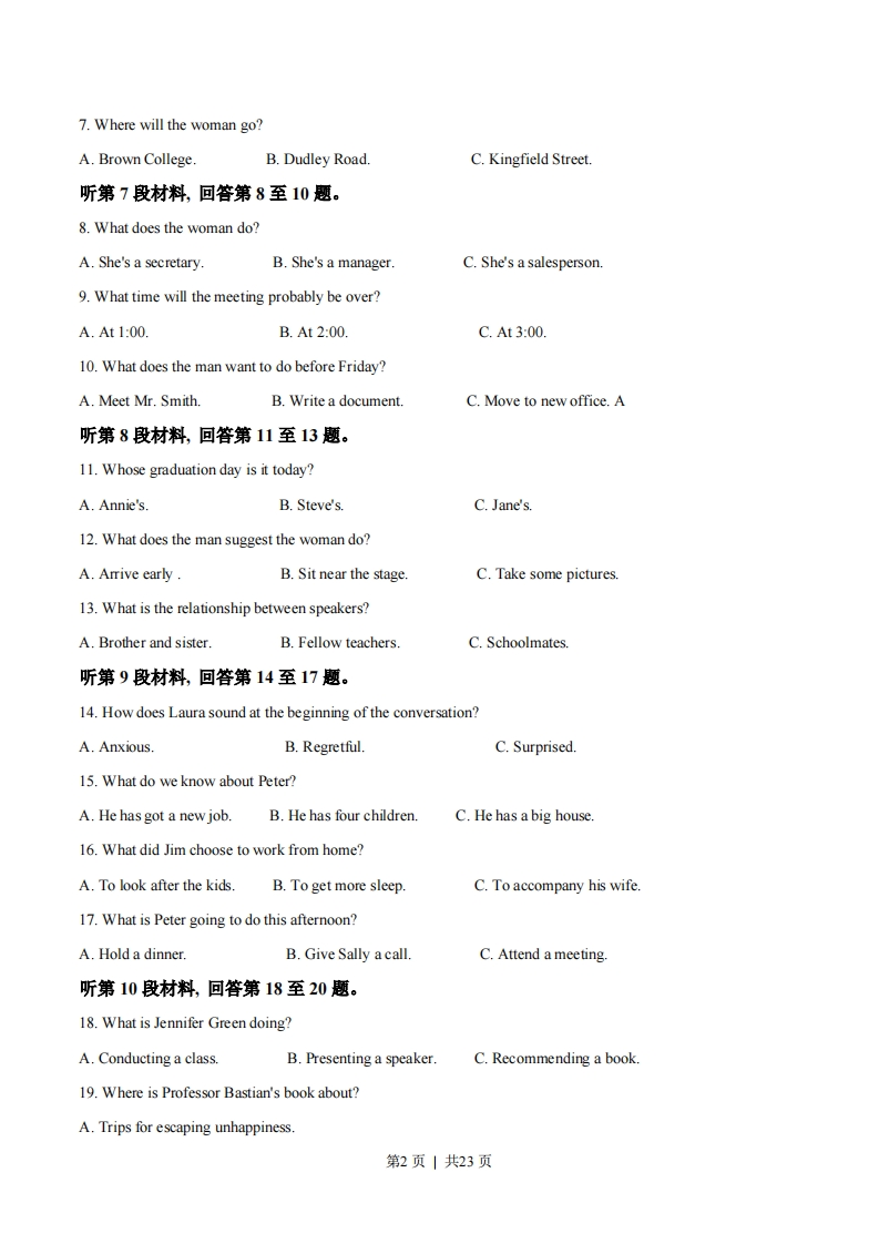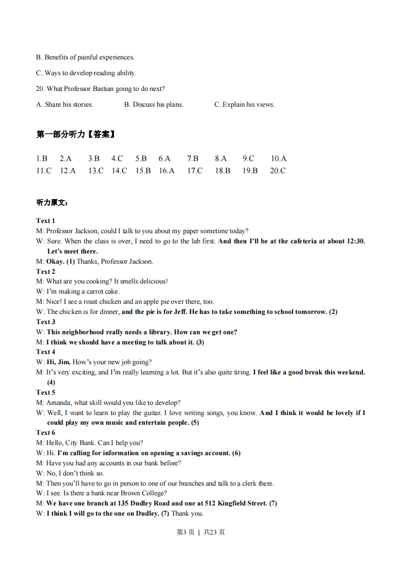 2022年1月普通高等学校招生全国统一考试(浙江卷)第一部分听力(共两节,满分30分)做题时,先将答案标在试卷上。录音内容结束后,你将有两分钟的时间将试卷上的答案转涂到答题纸上。第一节(共5小题:每小题1.5分,满分7.5分)听下面5段对话。每段对话后有一个小题,从题中所给的A、B、C三个选项中选出最佳选项,并标在试卷的相应位置。听完每段对话后,你都有10秒钟的时间来回答有关小题和阅读下一小题。每段对话仅读一遍。例:How much is the shirt?A.19.15B.9.18C.£9.45答案是C.1.Where are the speakers going to meet?A.In a labB.In a cafeteriaC.In a classroom2.What will Jeff take to school tomorrow?A.An apple pieB.A carrot cake.C.A roast chicken.3.What are the speakers talking about?A.Visiting a neighbor.B.Getting a libraryC.Attending a meeting.4.What will Jim probably do this weekend?A.Finish a project.B.Take a class.C.Have a rest5.Why does Amanda want to learn to play the guitar?A.To record popular songs B.To perform her own music.C.To become a guitar teacher第二节供15小题;每小题1.5分,满分22.5分)听下面5段对话或独白每段对话或独白后有几个小题,从题中所给的A、B、C三个选项中选出最佳选项,并标在试卷的相应位置。听每段对话或独白前,你将有时间阅读各个小题,每小题5秒钟;听完后,各小题将给出5秒钟的作答时间。每段对话或独白读两遍。听第6段材料,回答第6、7题。6.What does the woman want to do?A.Open a bank account.B.Cancel a credit card.C.Withdraw some money第1页|共23页7.Where will the woman go?A.Brown College.B.Dudley Road.C.Kingfield Street.听第7段材料,回答第8至10题。8.What does the woman do?A.She's a secretary.B.She's a manager.C.She's a salesperson.9.What time will the meeting probably be over?A.At1:00.B.At2:00.C.At3:00.10.What does the man want to do before Friday?A.Meet Mr.Smith.B.Write a documentC.Move to new office.A听第8段材料,回答第11至13题。11.Whose graduation day is it today?A.Annie'sB.Steve's.C.Jane's.12.What does the man suggest the woman do?A.Arrive early.B.Sit near the stage.C.Take some pictures.13.What is the relationship between speakers?A.Brother and sister.B.Fellow teachers.C.Schoolmates.听第9段材料,回答第14至17题。14.How does Laura sound at the beginning of the conversation?A.Anxious.B.Regretful.C.Surprised.15.What do we know about Peter?A.He has got a new job.B.He has four children.C.He has a big house.16.What did Jim choose to work from home?A.To look after the kids.B.To get more sleep.C.To accompany his wife.17.What is Peter going to do this afternoon?A.Hold a dinner.B.Give Sally a call.C.Attend a meeting听第10段材料,回答第18至20题。18.What is Jennifer Green doing?A.Conducting a class.B.Presenting a speaker.C.Recommending a book.19.Where is Professor Bastian's book about?A.Trips for escaping unhappiness第2页|共23页B.Benefits of painful experiences.C.Ways to develop reading ability.20.What Professor Bastian going to do next?A.Share his stories.B.Discuss his plans.C.Explain his views.第一部分听力【答案】1B2.A3.B4.C5.B6.A7.B8.A9.C10.A11.C12.A13.C14.C15.B16.A17.C18.B19.B20.C听力原文:Text 1M:Professor Jackson,could I talk to you about my paper sometime today?W:Sure.When the class is over,I need to go to the lab first.And then I'll be at the cafeteria at about 12:30.Let's meet there.M:Okay.(1)Thanks,Professor Jackson.Text 2M:What are you cooking?It smells delicious!W:I'm making a carrot cake.M:Nice!I see a roast chicken and an apple pie over there,too.W:The chicken is for dinner,and the pie is for Jeff.He has to take something to school tomorrow.(2)Text3W:This n