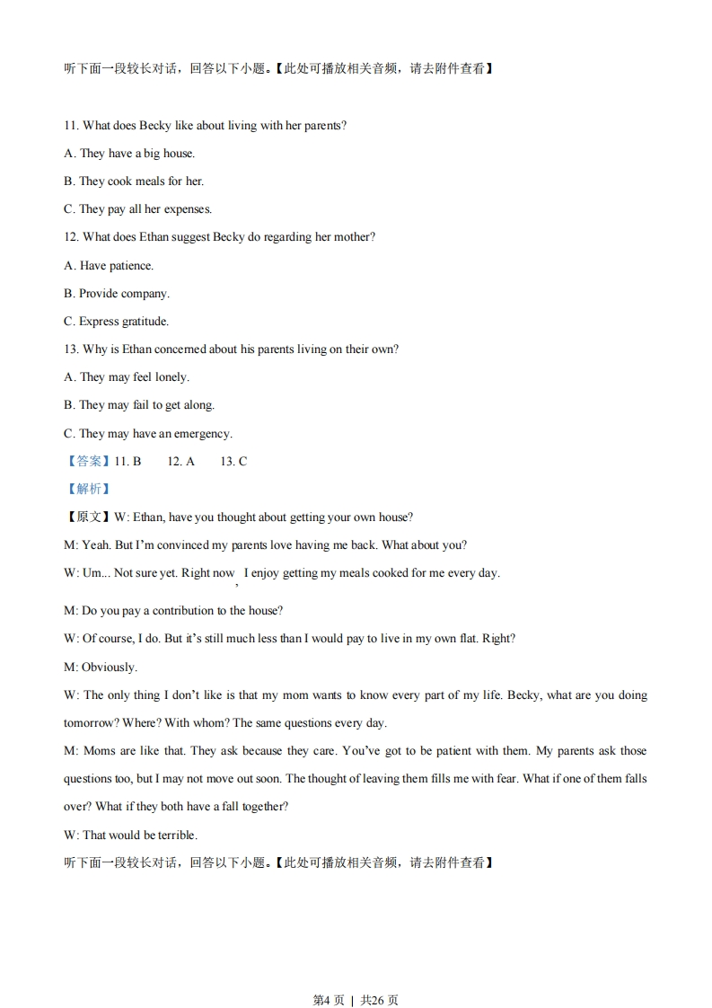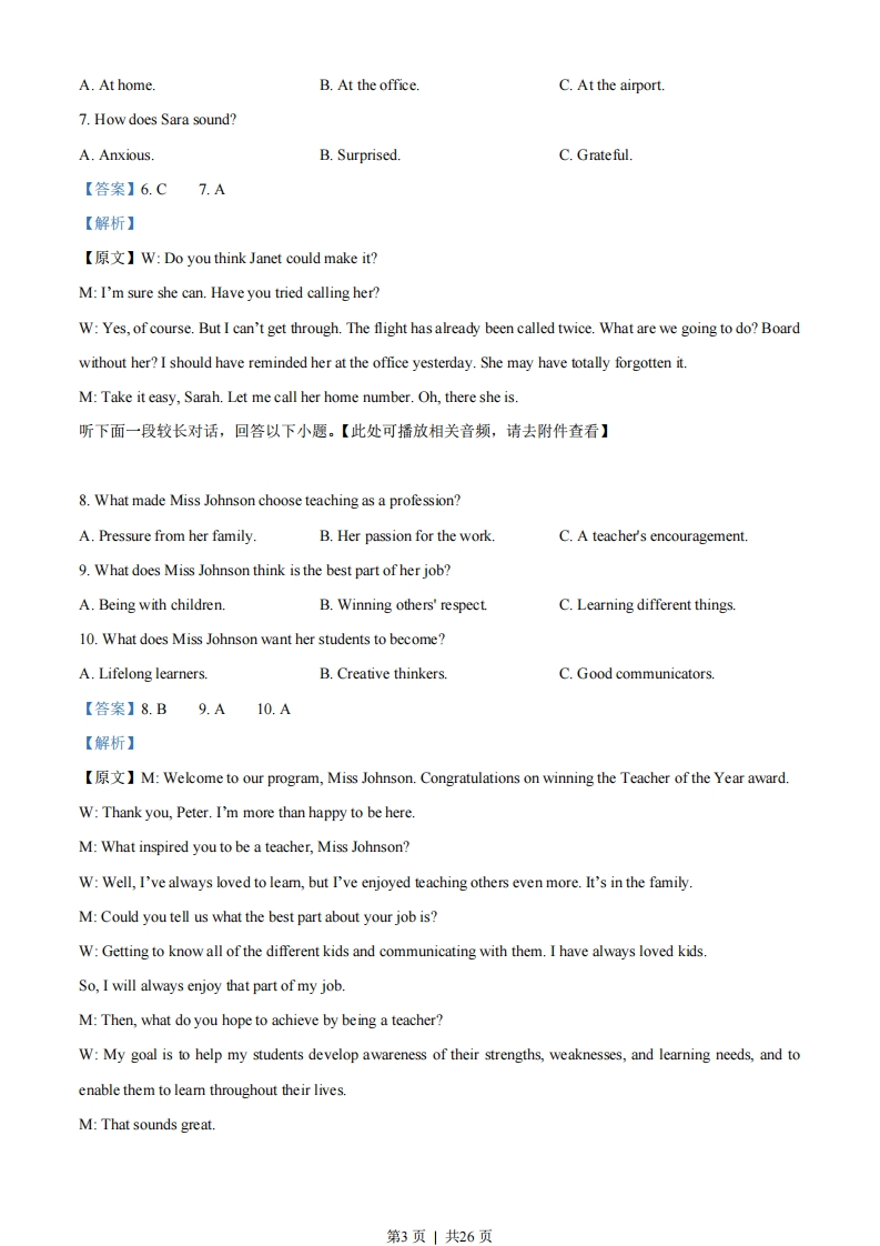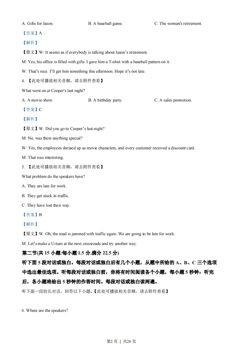 2023年1月普通高等学校招生全国统一考试英语选择题部分第一部分听力(共两节,满分30分)做题时,先将答案标在试卷上。录音内容结束后,你将有两分钟的时间将试卷上的答案转涂到答题纸上。第一节(共5小题;每小题1.5分,满分7.5分)听下面5段对话。每段对话后有一个小题,从题中所给的A、B、C三个选项中选出最佳选项。听完每段对话后,你都有10秒钟的时间来回答有关小题和阅读下一小题。每段对话仅读一遍。1.【此处可播放相关音频,请去附件查看】What will the speakers do next?A.Visit a friend.B.Pick up Billy.C.Buy some beans.【答案】C【解析】M:Billy needs some beans for his science project at school.Maybe we can stop by a store on our wayhomeW:Let's go to Greens.It's just around the comer.M:Okay.2.【此处可播放相关音频,请去附件查看】Who is Andy Clarks?A.A public librarian.B.A TV actor.C.A famous lawyer.【答案】B【解析】【原文】W:Hi,Stephen,,guess who I saw at the city library?Andy Clarkes一the leading actor in The GoodLawyer-the famous TV series.M:What was he doing there?His popularity has slipped since the final season of the show.3.【此处可播放相关音频,请去附件查看】What are the speakers talking about?第1页」共26页A.Gifts for Jason.B.A baseball game.C.The woman's retirement【答案】A【解析】【原文】W:It seems as if everybody is talking about Jason's retirement,.M:Yes,his office is filled with gifts.I gave him a T-shirt with a baseball pattern on it.W:That's nice.I'll get him something this afternoon.Hope it's not late.4.【此处可播放相关音频,请去附件查看】What went on at Cooper's last night?A.A movie show.B.A birthday party.C.A sales promotion.【答案】C【解析】【原文】W:Did you go to Cooper's last night?M:No,was there anything special?W:Yes,the employees dressed up as movie characters,and every customer received a discount card.M:That was interesting.5.【此处可播放相关音频,请去附件查看】What problem do the speakers have?A.They are late for work.B.They get stuck in traffic.C.They have lost their way【答案】B【解析】【原文】W:Oh,the road is jammed with traffic again.We are going to be late for work.M:Let's make a U-turn at the next crossroads and try another way.第二节(共15小题:每小题1.5分,满分22.5分)听下面5段对话或独白。每段对话或独白后有几个小题,从题中所给的A、B、C三个选项中选出最佳选项。听每段对话或独白前,你将有时间阅读各个小题,每小题5秒钟:听完后,各小题将给出5秒钟的作答时间。每段对话或独白读两遍。听下面一段较长对话,回答以下小题。【此处可播放相关音频,请去附件查看】6.Where are the speakers?第2页|共26页A.At home.B.At the office.C.At the airport.7.How does Sara sound?A.Anxious.B.Surprised.C.Grateful.【答案】6.C7.A【解析】【原文】W:Do you think Janet could make it?M:I'm sure she can.Have you tried calling her?W:Yes,of course.But I can't get through.The flight has already been called twice.What are we going to do?Boardwithout her?I should have reminded her at the office yesterday.She may have totally forgotten it.M:Take it easy,Sarah.Let me call her home number.Oh,there she is.听下面一段较长对话,回答以下小题。【此处可播放相关音频,请去附件查看】8.What made Miss Johnson choose teaching as a profession?A.Pressure from her familyB.Her passion for the work.C.A teacher's encouragement.9.What does Miss Johnson think is the best part of her job?A.Being with children.B.Winning others'respect.C.Learning different things.10.What does Miss Johnson want her students to become?A.Lifelong learners.B.Creative thinkers.C.Good communicators.【答案】8.B9.A10.A【解析】[M:Welcome to our program,Miss Johnson.Congratulations on winning the Teacher of the Year award.W:Thank you,Peter.I'm more than happy to be here.M:What ins
