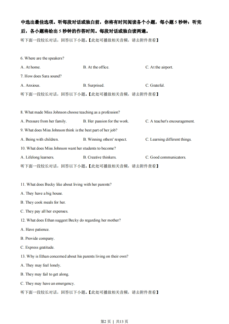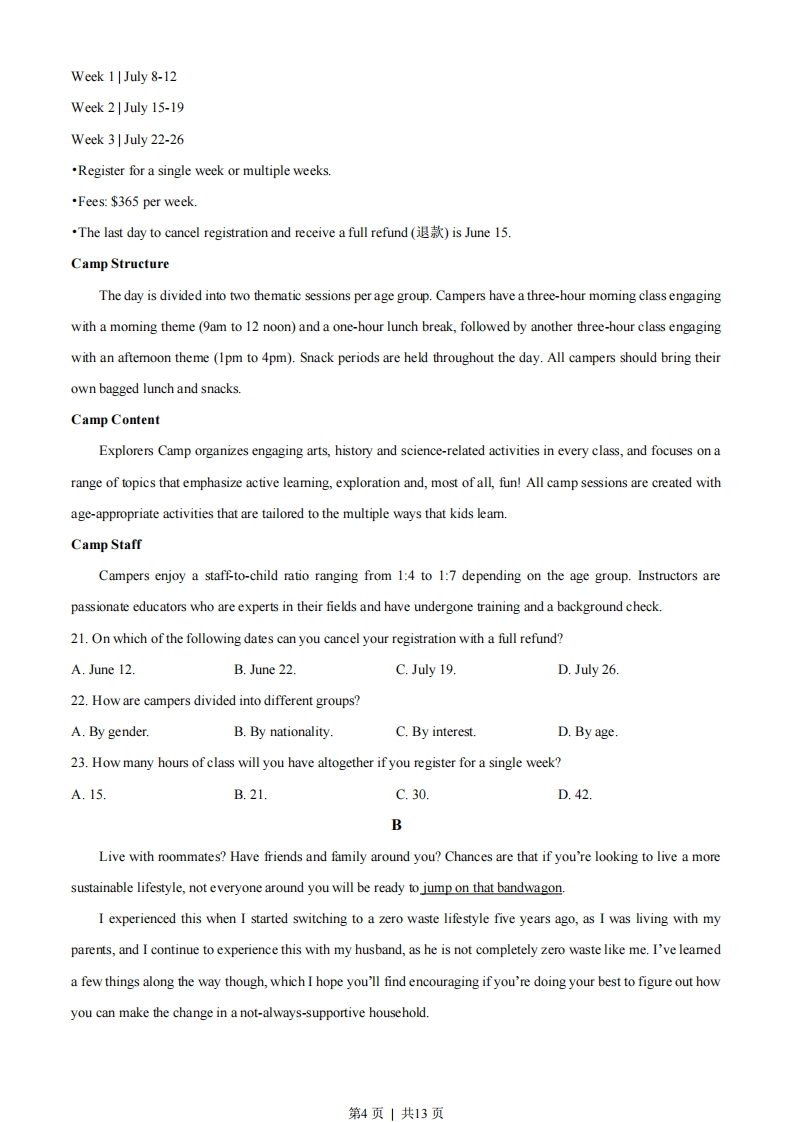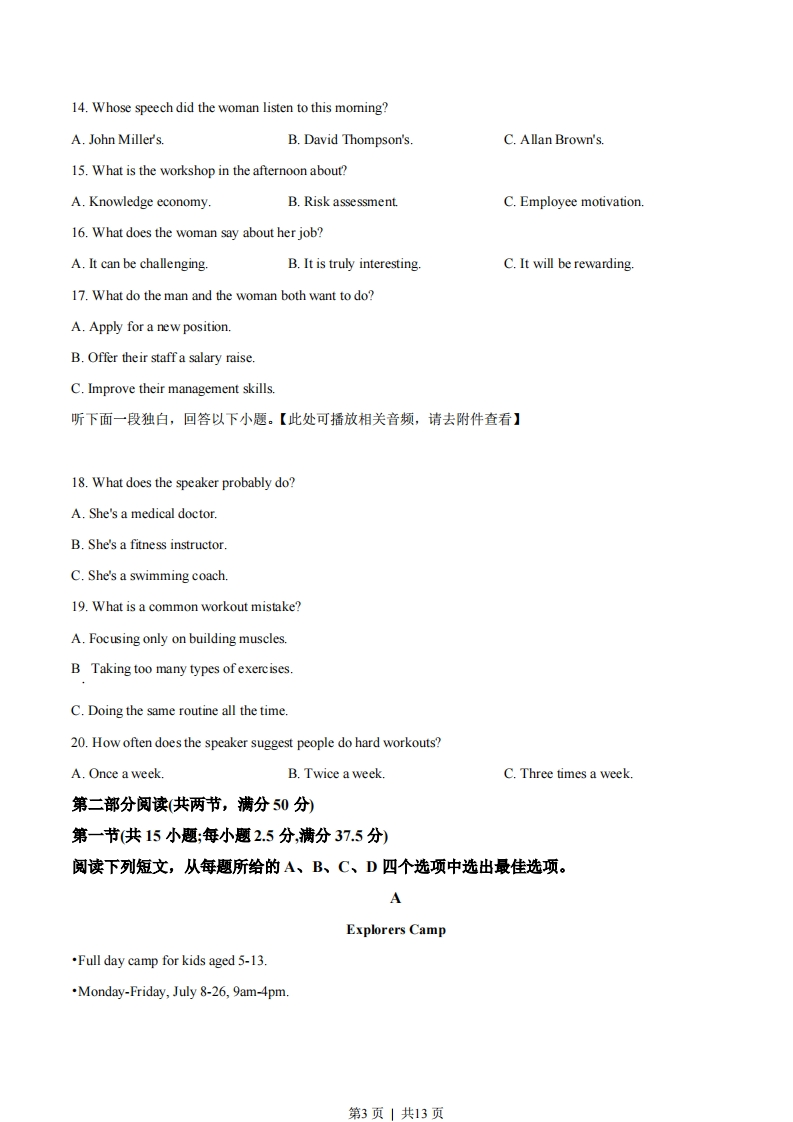 2023年1月普通高等学校招生全国统一考试英语选择题部分第一部分听力(共两节,满分30分)做题时,先将答案标在试卷上。录音内容结束后,你将有两分钟的时间将试卷上的答案转涂到答题纸上。第一节(共5小题;每小题1.5分,满分7.5分)听下面5段对话。每段对话后有一个小题,从题中所给的A、B、C三个选项中选出最佳选项。听完每段对话后,你都有10秒钟的时间来回答有关小题和阅读下一小题。每段对话仅读一遍。1.【此处可播放相关音频,请去附件查看】What will the speakers do next?A.Visit a friend.B.Pick up Billy.C.Buy some beans.2.【此处可播放相关音频,请去附件查看】Who is Andy Clarks?A.A public librarian.B.A TV actor.C.A famous lawyer.3.【此处可播放相关音频,请去附件查看】What are the speakers talking about?A.Gifts for Jason.B.A baseball game.C.The woman's retirement.4.【此处可播放相关音频,请去附件查看】What went on at Cooper's last night?A.A movie show.B.A birthday party.C.A sales promotion.5.【此处可播放相关音频,请去附件查看】What problem do the speakers have?A.They are late for work.B.They get stuck in traffic.C.They have lost their way.第二节(共15小题:每小题1.5分,满分22.5分)听下面5段对话或独白。每段对话或独白后有几个小题,从题中所给的A、B、C三个选项第1页」共13页中选出最佳选项。听每段对话或独白前,你将有时间阅读各个小题,每小题5秒钟:听完后,各小题将给出5秒钟的作答时间。每段对话或独白读两遍。听下面一段较长对话,回答以下小题。【此处可播放相关音频,请去附件查看】6.Where are the speakers?A.At home.B.At the office.C.At the airport.7.How does Sara sound?A.AnxiousB.Surprised.C.Grateful.听下面一段较长对话,回答以下小题。【此处可播放相关音频,请去附件查看】8.What made Miss Johnson choose teaching as a profession?A.Pressure from her family.B.Her passion for the work.C.A teacher's encouragement.9.What does Miss Johnson think is the best part of her job?A.Being with children.B.Winning others'respect.C.Learning different things.10.What does Miss Johnson want her students to become?A.Lifelong learners.B.Creative thinkers.C.Good communicators.听下面一段较长对话,回答以下小题。【此处可播放相关音频,请去附件查看】11.What does Becky like about living with her parents?A.They have a big house.B.They cook meals for her.C.They pay all her expenses.12.What does Ethan suggest Becky do regarding her mother?A.Have patience.B.Provide company.C.Express gratitude13.Why is Ethan concemed about his parents living on their own?A.They may feel lonely.B.They may fail to get alongC.They may have an emergency听下面一段较长对话,回答以下小题。【此处可播放相关音频,请去附件查看】第2页|共13页14.Whose speech did the woman listen to this moming?A.John Miller's.B.David Thompson'sC.Allan Brown's.15.What is the workshop in the afternoon about?A.Knowledge economyB.Risk assessment.C.Employee motivation.16.What does the woman say about her job?A.It can be challenging.B.It is truly interesting.C.It will be rewarding.17.What do the man and the woman both want to do?A.Apply for a new position.B.Offer their staff a salary raise.C.Improve their management skills.听下面一段独白,回答以下小题。【此处可播放相关音频,请去附件查看】18.What does the speaker probably do?A.She's a medical doctor.B.She's a fitness instructor.C.She's a swimming coach.19.What is a common workout mistake?A.Focusing only on building muscles.B Taking too many types ofexercises.C.Doing the same routine all the time.20.How often does the speaker suggest people do hard workouts?A.Once a weekB.Twice a weekC.Three times a week.第二部分阅读(共两节,满分50分)第一节(共15小题;每小题2.5分,满分37.5分)阅读下列短文,从每题所给的A、B、C、D四个选项中选出最佳选项。AExplorers Camp.Full day camp for kids aged 5-13..Monday-Friday,July 8-26,9am-4pm.第3页」共13页
