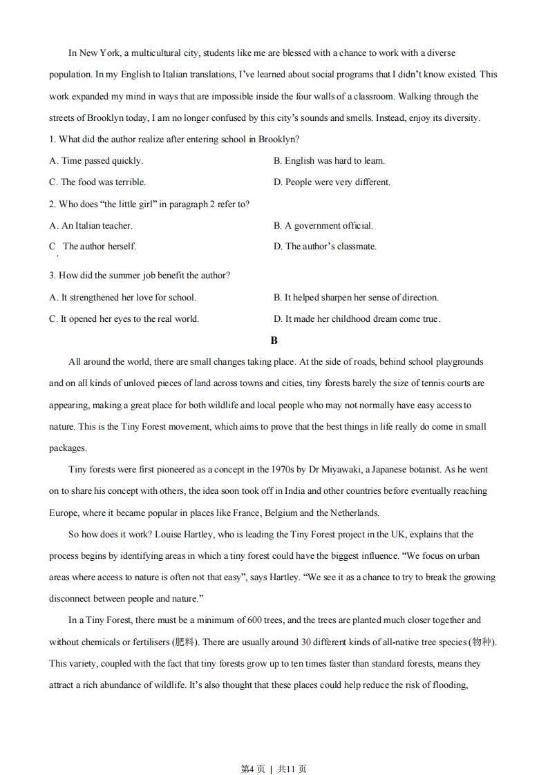 2022年普通高等学校招生全国统一考试(浙江卷)英语选择题部分(共95分)第一部分听力(共两节满分30分)做题时,先将答案标在试卷上。录音内容结束后,你将有两分钟的时间将试卷上的答案转涂到答题纸上。第一节(共5小题;每小题1.5分,满分7.5分)听下面5段对话。每段对话后有一个小题,从题中所给的A、B、C三个选项中选出最佳选项,并标在试卷的相应位置。听完每段对话后,你都有10秒钟的时间来回答有关小题和阅读下一小题。每段对话仅读一遍。例:How much is the shirt?A.c19.15.B.f9.18.C.9.15.答案是C.1.What will the speakers do next?A.Check the map.B.Leave the restaurant.C.Park the car.2.Where are the speakers?A.At a bus stop.B.At home.C.At the airport.3.What did the speakers do last week?A.They had a celebration dinner.B.They went to see a newborn baby.C.They sent a mail to their neighbors4.Why does the man make the phone call?A.To cancel a weekend trip.B.To make an appointment.C.To get some information.5.What does the man probably want to do?A.Do some exercise.B.Get an extra keyC.Order room service第二节(共15小题;每小题1.5分,满分22.5分)听下面5段对话或独白。每段对话或独白后有几个小题,从题中所给的A、B、C三个选项中选出最佳选项。听每段对话或独白前,你将有时间阅读各个小题,每小题5秒钟:听完后,第1页」共11页各小题将给出5秒钟的作答时间。每段对话或独自读两遍。听第6段材料,回答第6、7题。6.Why does the woman come to the man?A.To ask for permission.B.To extend an invitation.C.To express thanks.7.When are the students going to the museum?A.On Friday.B.On Saturday.C.On Sunday.听第7段材料,回答第8至10题。8.What are the speakers talking about?A.Buying groceries.B.Choosing gifts.C.Seeing friends.9.Who is Clara?A.The man's wife.B.The man's sister.C.The man's daughter.10.How much did the man spend on the city passes?A.$36.B.$50.C.$150.听第8段材料,回答第11至13题。11.Why did Tracy bring dogs to the Children?A.To teach them to love animals.B.To help them gain confidence.C.To protect them from dangers.12.What is Kevin's concern about the dog?A.They may misbehave.B.They may get hurt.C.They may carry diseases.13.What will Helen do tomorrow morning?A.Give a talk.B.Meet the children.C.Take some photos听第9段材料,回答第14至17题。14.What is the man doing?A.Attending a lecture.B.Hosting a workshop.C.Conducting an interview.15.Why is Emily doing unpaid work in the new season of the show?A.To follow the latest trend.B.To help raise the crew's pay.C To support the post-production.16.What enables Emily to try different things in her field?第2页」共11页A.Her college education.B.Her teaching experienceC.Her family tradition.17.What does Emily think of her work at the Film Centre?A.Boring.B.Rewarding.C.Demanding.听第10段材料,回答第18至20题。18.Who is the speaker talking to?A.Sports club members.B.Intemational tourists.C.University students.19.Where did Emma work for a rugby team?A.In Manchester.B.In Dublin.C.In Vancouver.20.What can be a challenge to Emma's work?A.Competition in the health care industry.B.Discrimination against female scientists.C.Influence of misinformation on the public.第二部分阅读理解(共两节,满分35分)第一节(共10小题;每小题2.5分,满分25分)阅读下列短文,从每题所给的A、B、C和D四个选项中,选出最佳选项,并在答题卡上将该项涂黑。APasta and pizza were on everyone's lunch menu in my native land of Italy.Everyone who had such a lunchwas fair-skinned and spoke Italian.A few years later,as I stood in the lunch line with my kindergarten class in aschool in Brooklyn,I realized things were no longer that simple.My classmates ranged from those kids