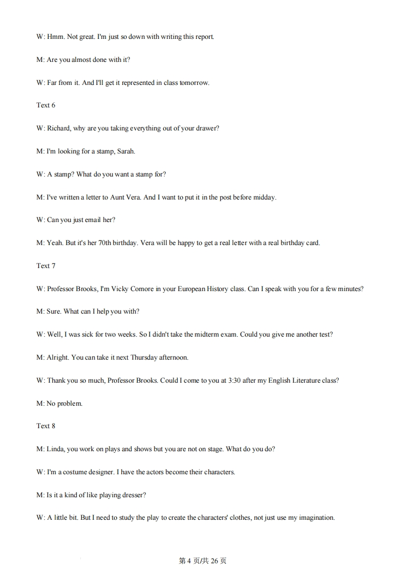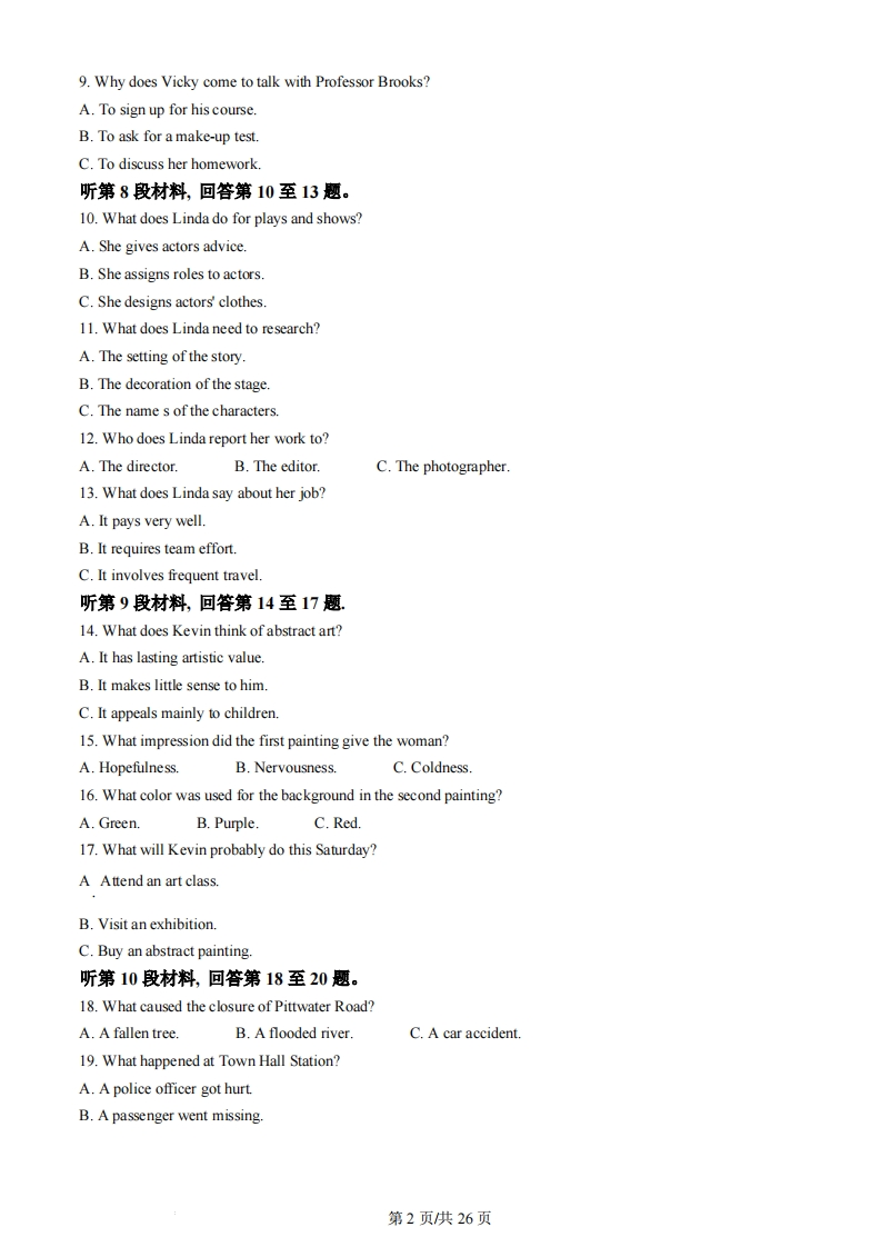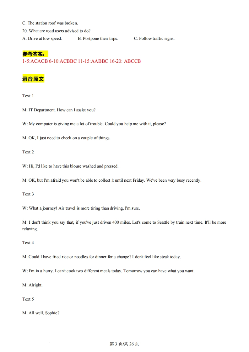 2024年1月普通高等学校招生全国统一考试英语注意事项:1.答卷前,考生务必将自己的姓名、准考证号填写在答题卡上。2.回答选择题时,选出每小题答案后,用铅笔把答题卡上对应题目的答案标号涂黑。如需改动,用橡皮擦干净后,再选涂其他答案标号。回答非选择题时,将答案写在答题卡上,写在本试卷上无效。3.考试结束后,将本试卷和答题卡一并交回。第一部分听力(共两节,满分30分)做题时,先将答案标在试卷上。录音内容结束后,你将有两分钟的时间将试卷上的答案转涂到答题卡上。第一节(共5小题;每小题1.5分,满分7.5分)听下面5段对话。每段对话后有一个小题,从题中所给的A、B、C三个选项中选出最佳选项,并标在试卷的相应位置。听完每段对话后,你都有10秒钟的时间来回答有关小题和阅读下一小题。每段对话仅读一遍。1.What does the man do?A.A computer technician.B.A hotel receptionist.C.A shop assistant.2.Where does the conversation take place?A.At the grocer's.B.At the tailor's.C.At the cleaner's.3.How did the speakers come to Seattle?A.By plane.B.By car.C.By train.4.What will the speakers have for dinner today?A.Fried riceB.NoodlesC.Steak.5.How is Sophie feeling now?A.Confused.B.Worried.C.Tired.第二节(共15小题:每小题1.5分,满分22.5分)听下面5段对话或独白。每段对话或独白后有几个小题,从题中所给的A、B、C三个选项中选出最佳选项,并标在试卷的相应位置。听每段对话或独白前,你将有时间阅读各个小题,每小题5秒钟;听完后,各小题将给出5秒钟的作答时间。每段对话或独白读两遍。听第6段材料,回答第6、7题。6.What does the man want to do before noon?A.Post a letter.B.Make a card.C.Write an email.7 Whose birthday is it?A.Richard's.B.Sarah's.C.Vera's.听第7段材料,回答第8、9题。8.What course does Professor Brooks teach?A.Public Speaking.B.European History.C.English Literature.第1页供26页9.Why does Vicky come to talk with Professor Brooks?A.To sign up for his course.B.To ask for a make-up test.C.To discuss her homework.听第8段材料,回答第10至13题。10.What does Linda do for plays and shows?A.She gives actors advice.B.She assigns roles to actors.C.She designs actors'clothes.11.What does Linda need to research?A.The setting of the story.B.The decoration of the stage.C.The name s of the characters.12.Who does Linda report her work to?A.The director.B.The editor.C.The photographer.13.What does Linda say about her job?A.It pays very well.B.It requires team effort.C.It involves frequent travel.听第9段材料,回答第14至17题,14.What does Kevin think of abstract art?A.It has lasting artistic value.B.It makes little sense to him.C.It appeals mainly to children.15.What impression did the first painting give the woman?A.Hopefulness.B.Nervousness.C.Coldness16.What color was used for the background in the second painting?A.Green.B.Purple.C.Red17.What will Kevin probably do this Saturday?A Attend an art class.B.Visit an exhibition.C.Buy an abstract painting.听第10段材料,回答第18至20题。18.What caused the closure of Pittwater Road?A.A fallen tree.B.A flooded river.C.A car accident.19.What happened at Town Hall Station?A.A police officer got hurt.B.A passenger went missing.第2页供26页C.The station roof was broken.20.What are road users advised to do?A.Drive at low speed.B.Postpone their tripsC.Follow traffic signs.参考答案:1-5:ACACB 6-10:ACBBC 11-15:AABBC 16-20:ABCCB录音原文Text 1M:IT Department.How can I assist you?W:My computer is giving me a lot of trouble.Could you help me with it,please?M:OK,I just need to check on a couple of things.Text 2W:Hi,I'd like to have this blouse washed and pressed.M:OK,but I'm afraid you won't be able to collect it until next Friday.We've been very busy recently.Text 3W:What a journey!Air travel is more tiring than driving,