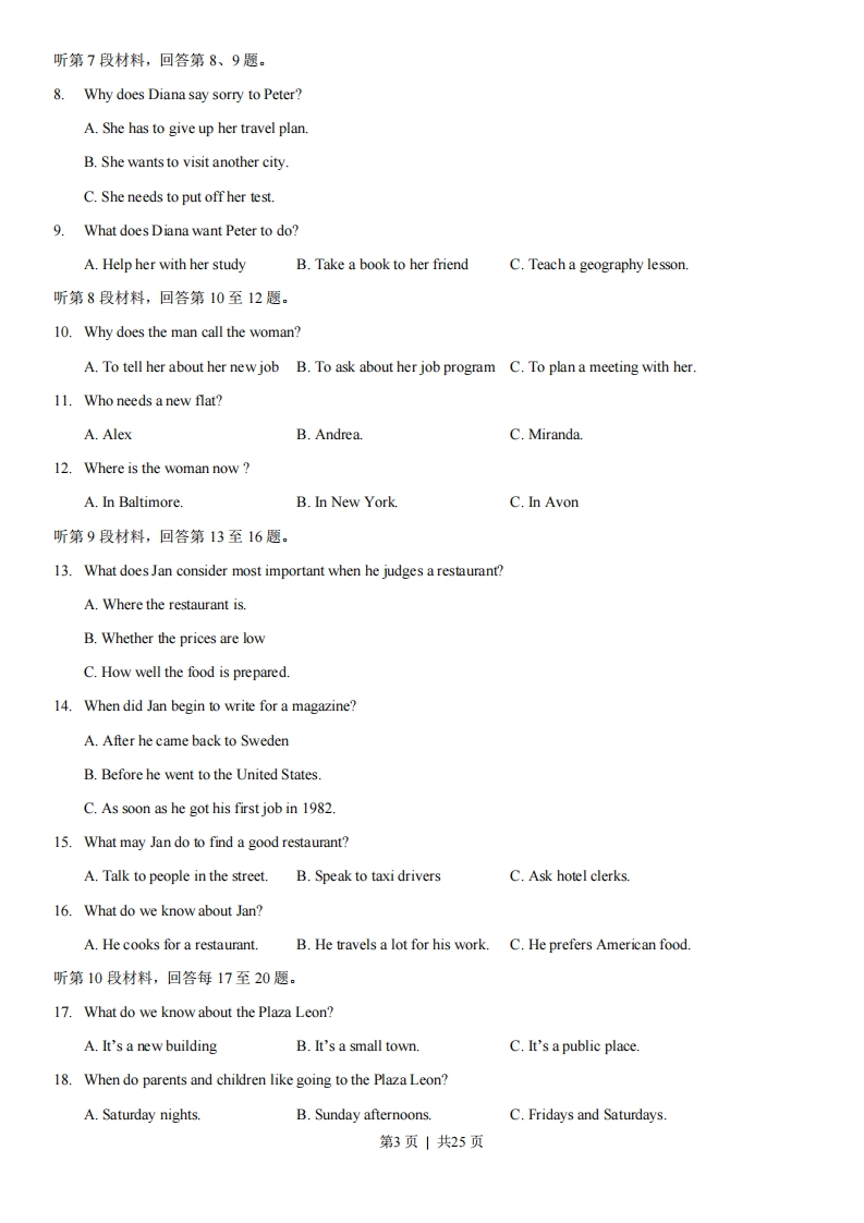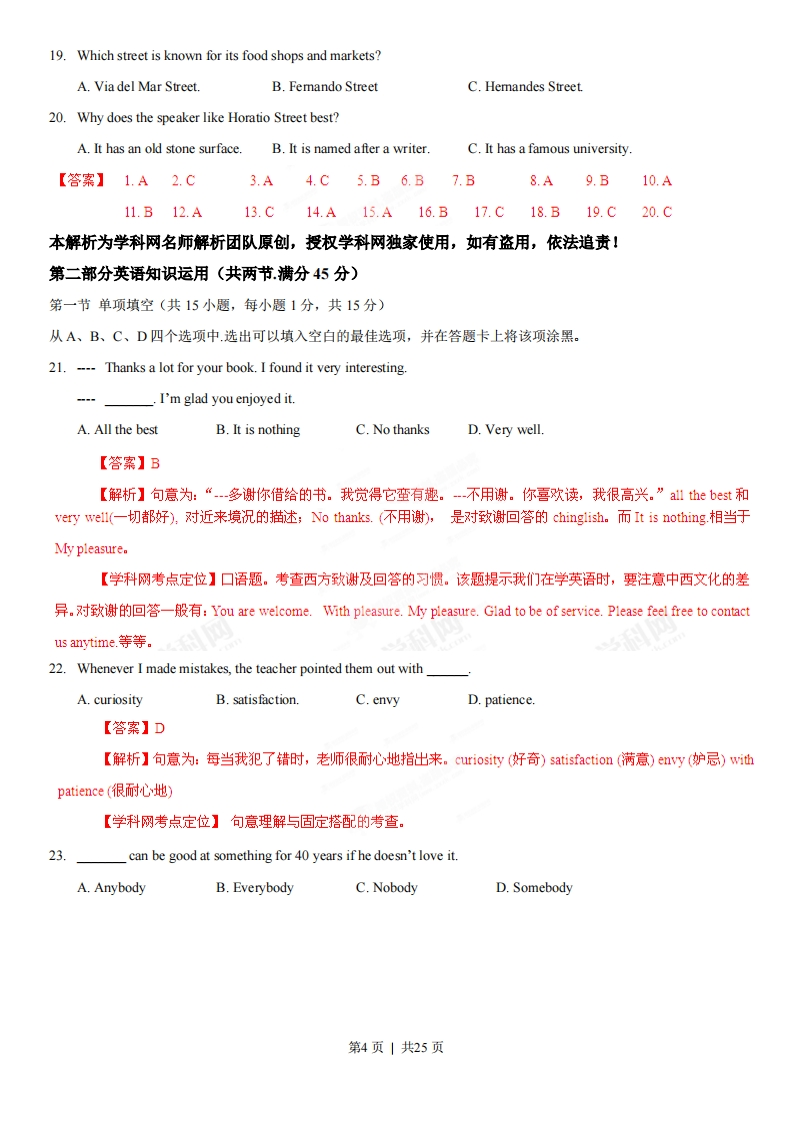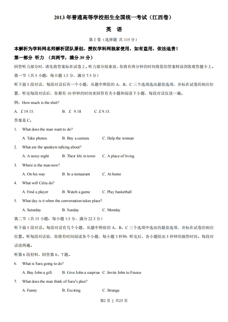 2013年高考江西卷英语解析(精编版)【试卷总评】2013年江西省高考英语试卷在保持去年的考查词汇量和语篇长度的基础上,出现了三个亮点:①.加强了语法在语境中的理解和运用中的考查。②.夯实了篇章宏观理解和推理能力的考查。③增加了语言文化知识的测试。其宗旨是进一步考察考生综合语言运用的能力。当然也参透了对考生情感态度、学习策略和文化意识的考查。1单项选择题:突出了语言的交际功能,强调对语言内容的理解。没有偏题、怪题,没有刻意追求语言结构的繁杂。多数题目突显了语法在语境中的理解和运用中的考查。特别是22题,23题,26题,27题,31题等。其中27题,考生有似曾相识之感,其实体现高考命题“点在纲内,考在纲外”的特点。命题者用意在于考查学生的语言学习可持续性能力。当然,21题考查了中西方致谢与答语的风俗。提醒语言学习者加强文化知识的了解与掌握。2.完形填空题:设空科学合理,整篇难度与去年相比,有所降低。除考查了词汇辨析与运用外,侧重考查了根据故事情节发展合理想象和推测的能力,这是是今年完形填空题的一个好方向。如:37题,42题,44题,47题,48题,51题,54题等。另外46题考了个纲外的短语mind one's business(管自己的事语)。提醒考生平时多积累高频词的活用。3.阅读理解题:所选用的材料体裁和题材很丰富,有故事、料普、旅游等。话题具有时代性和教育性(如:B篇国际救援:C篇学会倾听)。总词汇量比往年略有增加,难度与去年持平。阅读理解题中出现了两个亮点:⊙夯实了篇章宏观理解和推理能力的考查。(如:64题:65题:67题:71题:73题等)②增加了语言文化知识的测试。(如60题,62题,66题,英/汉语名言谚语与文章综合理解相结合的能力考查。体现了语言与文化学习的兼顾。另外,出现了一些新的考查方向。如:63题,考查文章组织结构理解:70题,考查文章出处推断:75题,作者态度领悟。4.阅读表达题:题型与去年相差不大,难度比去年稍低。话题是户外钓鱼的不同观点。指代题综合考查了篇章内容理解与语法句式分析能力。这是较去年的一个大突破。5.书面表达属文字命题式作文。写作要求简洁,题材与学生日常生活密切相关,使学生有话可说。并且学生想象空间很大,利于学生发挥。本人认为,本套题不足之处可能是,选拔功能体现不强。大多题着重基础性考查。有些题显得过分容易。如:阅读表达题。另试题创新性体现不够。如单选24,29题,有从资料上照搬之嫌。阅读A篇与D篇,好像都与环境话题相关。第1页共25页2013年普通高等学校招生全国统一考试(江西卷)英语第I卷(选择题共115分)本解析为学科网名师解析团队原创,授权学科网独家使用,如有盗用,依法追责!第一部分听力(共两节,满分30分)回答听力部分时,请先将答案标在试卷上。听力部分结束前,你将有两分钟的时间将您的答案转涂到客观答题卡上。第一节(共5小题:每小题1.5分,满分7.5分)听下面5段对话,每段对话后有一个小题,从题中所给的A、B、C三个选项选出最佳选项,并标在试卷的相应位置,听完每段对话后,你都有10秒钟的时间来回答有关小题和阅读下小题,每段对话仅读一遍。例:How much is the shirt?A.£19.15.B.£9.18C.£9.15.答案是C。1.What does the man want to do?A.Take photos.B.Buy a cameraC.Help the woman2.What are the speakers talking about?A.A noisy nightB.Their life in townC.A place of living3.Where is the man now?A.On his wayB.In a restaurantC.At home4.What will Celia do?A.Find a playerB.Watch a gameC.Play basketball5.What day is it when the conversation takes place?A.SaturdayB.SundayC.Monday第二节(共15小题:每小题1.5分,满分22.5分)听下面5段对话。每段对话有几个小题,从题中所给的A、B、C三个选项中选出的最佳选项,并标在试卷的相应位置。听每段对话前,你将有时间阅读各个小题,每小题5秒钟:听完后,各小题给出5秒钟的做答时间。每段对话读两遍。听第6段材料,回答第6、7题。6.What is Sara going to do?A.Buy John a gift.B.Give John a surprise C.Invite John to France7.What does the man think of Sara's plan?A.FunnyB.ExcitingC.Strange.第2页|共25页听第7段材料,回答第8、9题。8.Why does Diana say sorry to Peter?A.She has to give up her travel plan.B.She wants to visit another city.C.She needs to put offher test.9.What does Diana want Peter to do?A.Help her with her studyB.Take a book to her friendC.Teach a geography lesson.听第8段材料,回答第10至12题。10.Why does the man call the woman?A.To tell her about her new job B.To ask about her job program C.To plan a meeting with her.11.Who needs a new flat?A.AlexB.Andrea.C.Miranda.12.Where is the woman nowA.In Baltimore.B.In New York.C.In Avon听第9段材料,回答第13至16题。13.What does Jan consider most important when he judges a restaurant?A.Where the restaurant is.B.Whether the prices are lowC.How well the food is prepared.14.When did Jan begin to write for a magazine?A.After he came back to SwedenB.Before he went to the United States.C.As soon as he got his first job in 1982.15.What may Jan do to find a good restaurant?A.Talk to people in the street.B.Speak to taxi dri