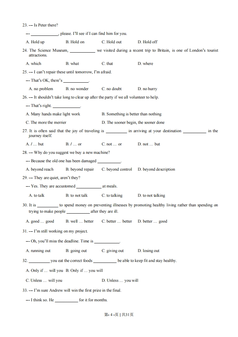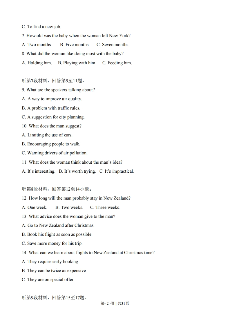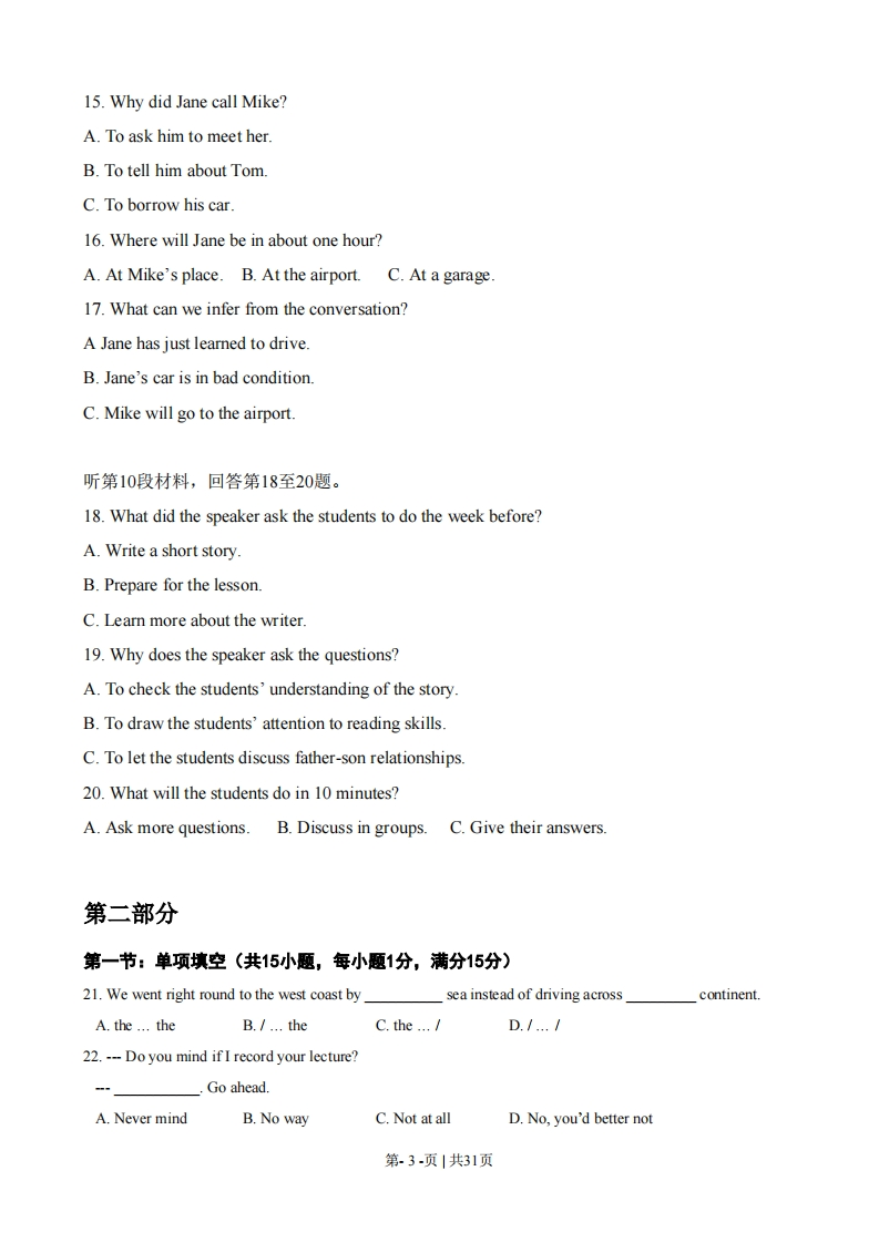 2008年普通高等学校招生全国统一考试(江苏卷)第一部分听力(共两节,满分30分)做题时,先将答案标在试卷上,录音结束后,你将有两分钟的时间将试卷上的答案转涂到答题卡上。第一节(共5小题,每小题1.5分,满分7.5分)听下面5段对话。每段对话后有一个小题,从题中所给的A、B、C三个选项中选出最佳答案。听完每段对话后,你都有10秒钟的时间来回答有关小题和阅读下一小题。每段对话仅读一遍。例:How much is the shirt?A.£19.15.B.f9.18C.9.15.答案是C1.What is the weather like?A.It's raining.B.It's cloudy.C.It's sunny.2.Who will go to China next month?A.Lucy.B.Alice.C.Richard.3.What are the speakers talking about?A.The man's sister.B.A film.C.An actor.4.Where will the speakers meet?A.In Room 340.B.In Room 314.C.In Room 223.5.Where does the conversation most probably take place?A.In a restaurant.B.In an office.C.At home.第二节(共15小题:年小题1.5分,满分22.5分)听下面5段对话或独白,每段对话或独白后面有几个小题,从题中所给的A、B、C三个选项中选出最佳选项,并标在试卷的相应位置。听每段对话或独白前,你将有时间阅读各小题,每小题5秒钟:听完后,各小题将给出5秒钟的作答时间。每段对话或独白读两遍。听第6段材料,回答第6至8题。6.Why did the woman go to New York?A.To spend some time with the babyB.To look after her sister.第.1-页|共31页C.To find a new job.7.How old was the baby when the woman left New York?A.Two months.B.Five months.C.Seven months.8.What did the woman like doing most with the baby?A.Holding him.B.Playing with him.C.Feeding him.听第7段材料,回答第9至11题。9.What are the speakers talking about?A.A way to improve air quality.B.A problem with traffic rules.C.A suggestion for city planning.10.What does the man suggest?A.Limiting the use of cars.B.Encouraging people to walkC.Warning drivers of air pollution.11.What does the woman think about the man's idea?A.It's interesting.B.It's worth trying.C.It's impractical.听第8段材料,回答第12至14小题。12.How long will the man probably stay in New Zealand?A.One week.B.Two weeks.C.Three weeks.13.What advice does the woman give to the man?A.Go to New Zealand after Christmas.B.Book his flight as soon as possible.C.Save more money for his trip.14.What can we learn about flights to New Zealand at Christmas time?A.They require early bookingB.They can be twice as expensive.C.They are on special offer听第9段材料,回答第15至17题。第2-页|共31页15.Why did Jane call Mike?A.To ask him to meet her.B.To tell him about Tom.C.To borrow his car.16.Where will Jane be in about one hour?A.At Mike's place.B.At the airport.C.At a garage.17.What can we infer from the conversation?A Jane has just learned to drive.B.Jane's car is in bad condition.C.Mike will go to the airport.听第10段材料,回答第18至20题。18.What did the speaker ask the students to do the week before?A.Write a short story.B.Prepare for the lesson.C.Learn more about the writer.19.Why does the speaker ask the questions?A.To check the students'understanding of the storyB.To draw the students'attention to reading skills.C.To let the students discuss father-son relationships.20.What will the students do in 10 minutes?A.Ask more questions.B.Discuss in groups.C.Give their answers.第二部分第一节:单项填空(共15小题,每小题1分,满分15分)21.We went right round to the west coast bysea instead of driving acrosscontinent.A.the...theB./...theC.the.../D.1.…122.---Do you mind if I record your lecture?Go ahead.A.Never mindB.No wayC.Not at allD.No,you'd better not第3-页|共31页