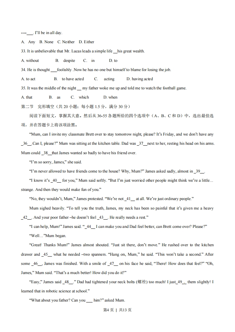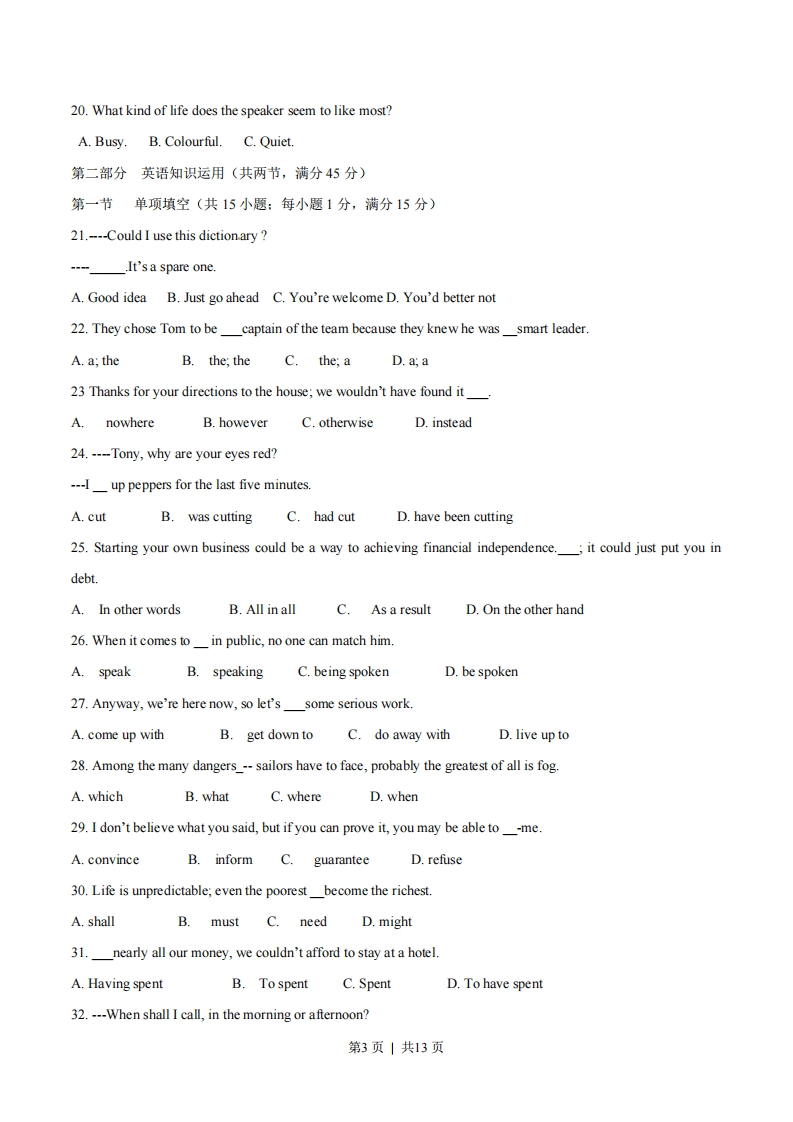 2014年高考英语江西卷第一节(共5小题,每小题1.5分,满分7.5分)听下面5段对话。每段对话后有一个小题,从题中所给的A、B、C三个选项中选出最佳选项,并标在试卷的相应位置。听完每段对话后,你都有10秒种的时间来回答有关小题和阅读下一小题,每段对话仅读一遍。例:How much is the shirt?A.£19.15B.£9.18C.£9.15答案是C。1.What does the woman want to do?A.Find a place.B.Buy a map.C.Get an address2.What does the man do for the woman?A.Repair her car B.Give her a ride C.Pick up her aunt.3.Who might Mr.Peterson be?A.A new professor B.A department head C.A company director.4.What does the man think of the book?A.Quite difficult.B.Very interesting.C.Too simple.5.What are the speakers talking about?A.Weather B.Clothes C.News.第二节(共15小题,每小题1.5分,满分22.5分)听下面5段对话或独白,每段对话或独白后有几个小题,从题中所给的A、B、C三个选项中选出最佳选项,并标在试卷的相应位置。听每段对话或独白前,你将有时间阅读各个小题,每小题5秒钟:听完后,各小题给出5秒钟的作答时间。每段对话或独白读两遍。听第6段材料,回答6、7小题。6.Why is Harry unwilling to join the woman?A.He has a pain in his knee.B.He wants to watch TV.C.he is too lazy.7.What will the woman probably do next?A.Stay at home.第1页|共13页B.Take Harry to hospital.C.Do some exercise.听第7段对话,回答8、9小题。8.When will the man be home from work?A.At5:45B.At6:15C.At6:509.Where will the speakers go?A.The Green House Cinema.B.The New State Cinema.C.The UME Cinema.听第8段对话,回答第10至12题。10.How will the speakers go to New York?A.By air.B.By taxi.C.By bus.11.Why are the speakers making the trip?A.For business.B.For shopping.C.For holiday.12.What is the probable relationship between the speakers?A.Driver and passenger B.Husband and wife C.Fellow workers.听第9段对话,回答第13至16题。13.Where does this conversation probably take place?A.In a restaurant.B.In an office.C.In a classroom.14.What does John do now?A.He's a trainer.B.He.'s atour guide.C.He's a college student.15.How much can a new person earn for the first year?A.$10,500.B.$12,000.C.$15,000.16.How many people will the woman hire?A.Four B.Three C.Two听第10段材料,回答第17至20题。17.How long has the speaker lived in a big city?A.One year.B.Ten years.C.Eighteen years18.What is the speaker's opinion on public transport?A.It's comfortable B.It's time-saving C.It's cheap.19.What is good about living in a small town?A.It's safer.B.It's healthier.C.It's more convenient.第2页|共13页20.What kind of life does the speaker seem to like most?A.Busy.B.Colourful.C.Quiet第二部分英语知识运用(共两节,满分45分)第一节单项填空(共15小题:每小题1分,满分15分)21.---Could I use this dictionary?---It's a spare one.A.Good idea B.Just go ahead C.You're welcome D.You'd better not22.They chose Tom to be captain of the team because they knew he was smart leader.A.a;theB.the;the C.the;a D.a;a23 Thanks for your directions to the house;we wouldn't have found itA.nowhereB.howeverC.otherwiseD.instead24.----Tony,why are your eyes red?---Iup peppers for the last five minutes.A.cutB.was cuttingC.had cutD.have been cutting25.Starting your own business could be a way to achieving financial independence.;it could just put you indebt.A.In other wordsB.All in allC.As a resultD.On the other hand26.When it comes to in public,no one can match him.A.speakB.speakingC.being spokenD.be spoken27.Anyway,we're here now,so let'ssome serious work.A.come up withB.g