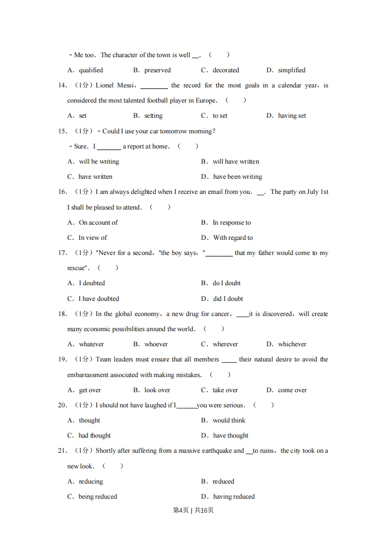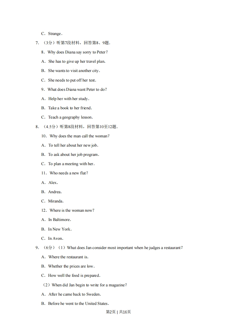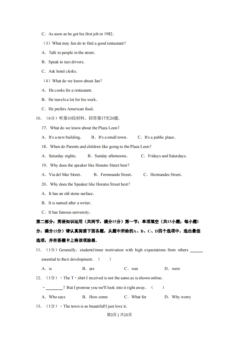 2013年江苏省高考英语试卷第一部分:听力(共两节,满分30分)做题时,先将答案标在试卷上。录音内容结束后,你将有两分钟的时间将试卷上的答案转涂到答题卡上。1.(1.5分)What does the man want to do?A.Take photosB.Buy a cameraC.Help the woman.2.(1.5)What are the speakers talking about?A.A noisy night.B.Their life in townC.A place of living.3.(1.5)Where is the man now?A.on his wayB.In a restaurantC.At home.4.(1.5)What will Celia do?A.Find a player.B.Watch a game.C.Play basketball.5.(1.5)What day is it when the conversation takes place?A.Saturday.B.Sunday.C.Monday.6.(3分)听第6段材料,回答第6、7题,6.What is Sara going to do?A.Buy John a gift.B.Give John a surprise.C.Invite John to France.7.What does the man think of Sara's plan?A.Funny.B.Exciting.第1页1共16页C.Strange.7.(3分)听第7段材料,回答第8、9题。8.Why does Diana say sorry to Peter?A.She has to give up her travel plan.B.She wants to visit another city.C.She needs to put off her test.9.What does Diana want Peter to do?A.Help her with her study.B.Take a book to her friend.C.Teach a geography lesson.8.(4.5分)听第8段材料,回答第10至12题10.Why does the man call the woman?A.To tell her about her new job.B.To ask about her job program.C.To plan a meeting with her.11.Who needs a new flat?A.Alex.B.Andrea.C.Miranda.12.Where is the woman now?A.In BaltimoreB.In New York.C.In Avon.9.(6)(1)What does Jan consider most important when he judges a restaurant?A.Where the restaurant is.B.Whether the prices are low.C.How well the food is prepared.(2)When did Jan begin to write for a magazine?A.After he came back to Sweden.B.Before he went to the United States第2页|共16页C.As soon as he got his first job in 1982.(3)What may Jan do to find a good restaurant?A.Talk to people in the street.B.Speak to taxi drivers.C.Ask hotel clerks.(4)What do we know about Jan?A.He cooks for a restaurant.B.He travels a lot for his work.C.He prefers American food.10.(6分)听第10段材料,回答第17至20题,17.What do we know about the Plaza Leon?A.It's a new building.B.It's a small town.C.It's a public place.18.When do Parents and children like going to the Plaza Leon?A.Saturday nights.B.Sunday aftemoons.C.Fridays and Saturdays.19.Why does the speaker like Horatio Street best?A.Via del Mar Street.B.Fernmando Street.C.Hermandes Street.20.Why does the Speaker like Horatio Street best?A.It has an old stone surface.B.It is named after a writer.C.It has famous university.第二部分:英语知识运用(共两节,满分15分)第一节:单项填空(共15小愿:每小题1分,满分15分)请认真阅读下面各题,从题中所给的A、B、C、D四个选项中,选出最佳选项,并在答题卡上将该项涂黑。11.(Generally,students'inner motivation with high expectations from othersessential to their development.(A.isB.areC.wasD.were12.()The T-shirt I received is not the same as is shown online.But I promise you we'll look into it right away.(A.Who saysB.How comeC.What forD.Why worry13.()The town is so beautiful!I just love it.第3页|共16页