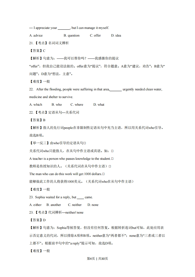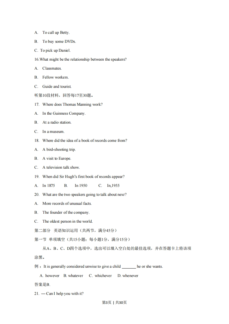 2012年普通高等学校招生全国统一考试(江苏卷)英语第I卷(选择题共50分)第一部分听力(共两节,满分30分)回答听力部分时,请先将答案标在试卷上。听力部分结束前,你将有两分钟的时间将您的答案转涂到客观答题卡上。第一节(共5小题:每小题1.5分,满分7.5分)听下面5段对话,每段对话后有一个小题,从题中所给的A、B、C三个选项选出最佳选项,并标在试卷的相应位置,听完每段对话后,你都有10秒钟的时间来回答有关小题和阅读下小题,每段对话仅读一遍。例:How much is the shirt?A.19.15B.9.15.C.9.18答案是B。1.Where does this conversation probably take place?A.In a bookstore.B.In a classroomC.In alibrary2.At what time will the film begin?A.7:20B.715C.7:003.What are the two speakers mainly talking about?A.Their friend Jane.B.A weekend tripC.A radio programme4.What will the woman probably do?A.Catch a trainB.See the man offC.Go shopping5.Why did the woman apologize?A.She made a late delivery B.She went to the wrong placeC.She couldn't take the cake back第二节(共15小题:每小题1.5分,满分22.5分)听下面5段对话。每段对话有几个小题,从题中所给的A、B、C三个选项中选出的最佳选项,并标在试卷的相应位置。听每段对话前,你将有时间阅读各个小题,每小题5秒钟:听完后,各小题给出5秒钟的做答时间。每段对话读两遍。听第6段材料,回答第6、7题。第1页|共30页6.Whose CD is broken?A.Kathy'sB.Mun'sC.Jack's7.What dose the boy promise to do for the girl?A.Buy her new CD.B.Do some cleaningC.Give her 10 dollars.听第7段材料,回答第8、9题。8.What did the man think of the meal?A.Just so-so.B.Quite satisfactoryC.A bit disappointing.9.What was the 15%on the bill paid forA.The foodB.The drinksC.The service听第8段材料,回答第10至12题。10.Why is the man at the shop?A.To order a camera for his wife.B.To have a camera repaired.C.To get camera changed.11.What colour does the man want?A.Pink.B.BlackC Orange.12.What will the man do afterwards?A.Make a phone callB.Wait until further notice.C.Come again the next day.听第9段材料,回答第13至16题。13.What would Joe probably do during the Thanksgiving holiday?A.Go to a play.B.Stay at home.C.Visit Kingston.14.What is Ariel going to do in TorontoA.Attend a partyB.Meet her auntCSee a car show.15.Why is ariel in a hurry to leave?第2页|共30页A.To call up Betty.B.To buy some DVDs.C.To pick up Daniel16.What might be the relationship between the speakers?A.Classmates.B.Fellow workers.C.Guide and tourist.听第10段材料,回答每17至30题。17.Where does Thomas Manning work?A.In the Guinness Company.B.At a radio station.C.In a museum.18.Where did the idea of a book of records come from?A.A bird-shooting trip.B.A visit to EuropeC.A television talk show.19.When did Sir Hugh's first book of records appear?A.In1875B.In1950C.In,195520.What are the two speakers going to talk about nexr?A.More records of unusual facts.B.The founder of the company.C.The oldest person in the world.第二部分英语知识运用(共两节,满分45分)第一节单项填空(共15小题:每小题1分,满分15分)从A、B、C、D四个选项中,选出可以填入空白处的最佳选项,并在答题卡上将该项涂黑。It is generally considered unwise to give a childhe or she wantsA.however B.whatever C.whichever D.whenever答案是B】21.-Can I help you with it?第3页|共30页