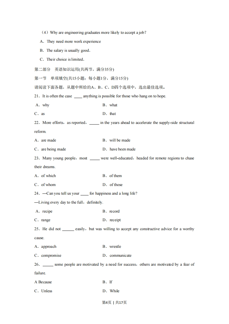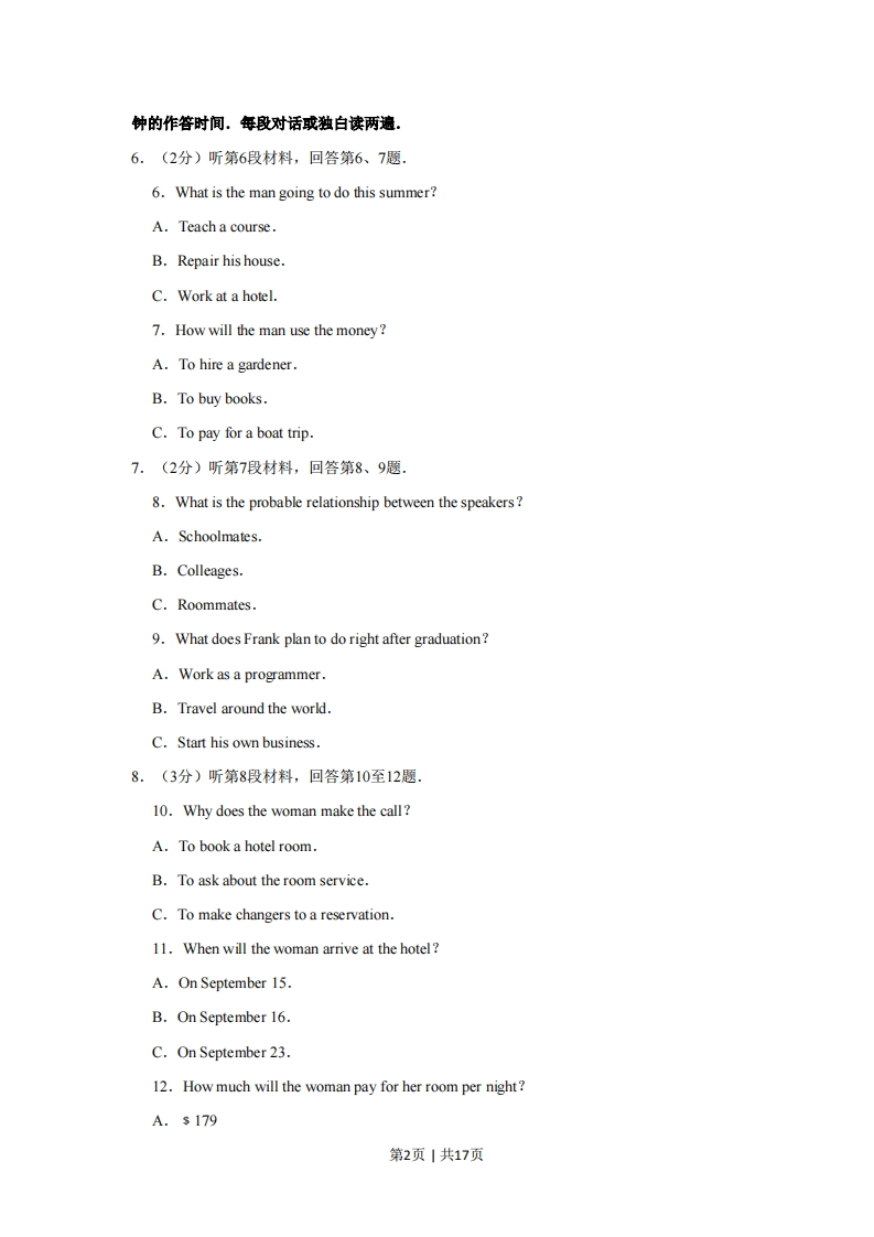 2016年江苏省高考英语试卷第一部分听力(共两节,满分5分)做题时,现将答案标在试卷上,录音内容结束后,你将有两分钟的时间将试卷上的答案转涂到答题卡上.第一节(共5小题:每小题1分,满分5分)(略)听下面5段对话,每段对话后有一个小题.从题中所给的A,B,C三个选项中选出最佳选项,并标在试卷的相应位置。听完每段对话后,你都有10秒钟的时间来回答有关小题和阅读下一小题.每段对话仅读一遗,1.(What are the speakers talking about?A.Having a birthday party.B.Doing some exercise.C.Getting Lydia a gift.2.(What is the woman going to do?A.Help the man.B.Take a bus.C.Get a camera.3.(What does the woman suggest the man do?A.Tell Kate's to stop.B.Call Kate's friends.C.Stay away from Kate.4.(Where does the conversation probably take place?A.In a wine shop.B.In a supermarket.C.In a restaurant.5.(What does the woman mean?A.Keep the window closed.B.Go out for fresh air.C.Turn on the fan.第二节(共5小题;每小题2分,满分15分)听下面5段对话或独白。每段对话或独白后有几个小题,从题中所给的A、B、C三个选项中选出最佳选项,并标在试卷的相应位置.听每段对话或独白前,你将有时间阅读各个小题,每小思5秒钟;听完后,各小题将给出5秒第1页1共17页钟的作答时间。年段对话或独白读两遗.6.(2分)听第6段材料,回答第6、7题。6.What is the man going to do this summer?A.Teach a course.B.Repair his house.C.Work at a hotel.7.How will the man use the money?A.To hire a gardener.B.To buy booksC.To pay for a boat trip.7.(2分)听第7段材料,回答第8、9题8.What is the probable relationship between the speakers?A.Schoolmates.B.Colleages.C.Roommates.9.What does Frank plan to do right after graduation?A.Work as a programmer.B.Travel around the world.C.Start his own business.8.(3分)听第8段材料,回答第10至12题.10.Why does the woman make the call?A.To book a hotel room.B.To ask about the room service.C.To make changers to a reservation.11.When will the woman arrive at the hotel?A.On September 15.B.On September 16.C.On September 23.12.How much will the woman pay for her room per night?A.s179第2页|共17页B.s199C.s219.9.(4)(1)What is the woman's plan for Saturday?A.Going shoppingB.Going camping.C.Going boating.(2)Where will the woman stay in Keswick?A.In a country inn.B.In a five-star hotel.C.In her aunt's home.(3)What will Gordon do over the weekend?A.Visit his friendsB.Watch DVDs.C.Join the woman.(4)What does the woman think of Gordon's coming weekend?A.Relaxed.B.Boring.C.Busy.10.(4)(1)Who is Wang Ming?A.A studentB.An employerC.An engineer(2)What does the speaker say about the college job market this year?A.It's unpredictableB.It's quite stableC.It's not optimistic(3)What percentage of student job seekers have found a job by now?A.20%B.22%C.50%第3页1共17页