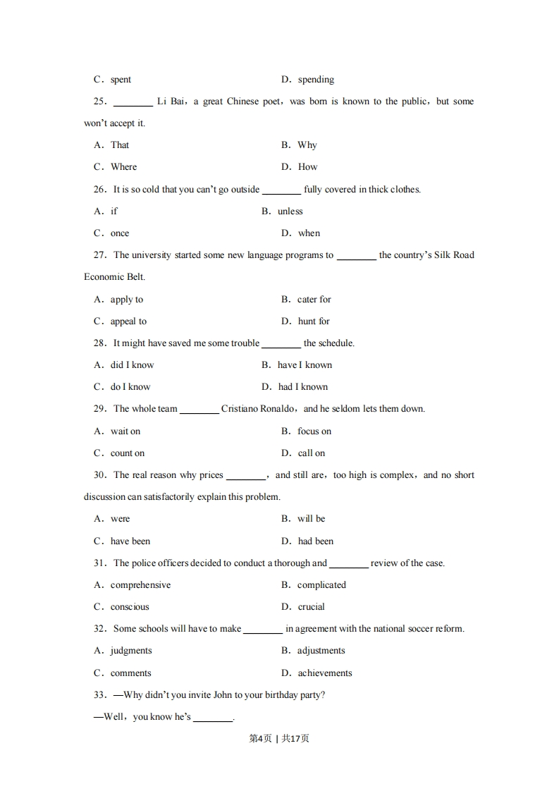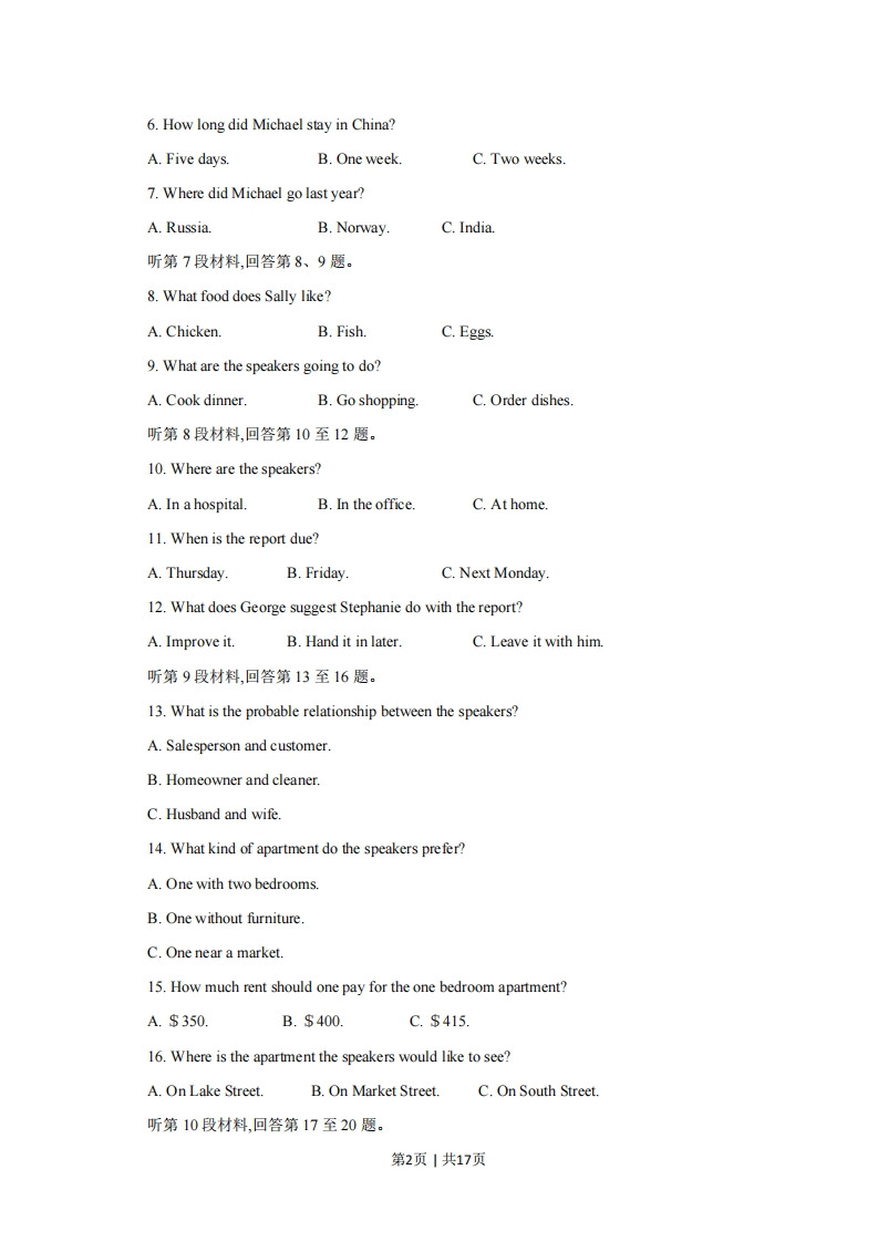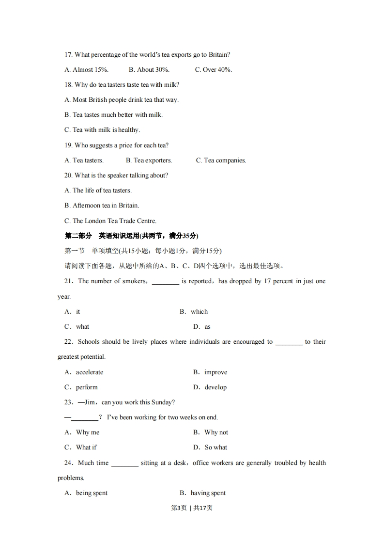 2015年普通高等学校招生全国统一考试(江苏)英语试题本试题卷共16页,81题。全卷满分150分。考试用时120分钟。第一部分听力(共两节,满分20分)做题时,先将答案标在试卷上。录音内容结束后,你将有两分钟的时间将试卷上的答案转涂到答题卡上。第一节(共5小题:每小题1分,满分5分)听下面5段对话。每段对话后有一个小题,从题中所给的A、B、C三个选项中选出最佳选项,并标在试卷的相应位置。听完每段对话后,你都有10秒钟的时间来回答有关小题和阅读下一小题。每段对话仅读一遍。例:How much is the shirt?A.19.15B.9.18C.9.15.答案是C。1.What time is it now?A.910.B.950.C.10002.What does the woman think of the weather?A.It's niceB.It's warm.C.It's cold.3.What will the man do?A.Attend a meeting.B.Give a lecture.C.Leave his office4.What is the woman's opinion about the course?A.Too hard.B.Worth taking.C.Very easy.5.What does the woman want the man to do?A.Speak louder.B.Apologize to her.C.Turn off the radio.第二节(共15小题:每小题1分,满分15分)听下面5段对话或独白。每段对话或独白后有几个小题,从题中所给的A、B、C三个选项中选出最佳选项,并标在试卷的相应位置。听每段对话或独白前,你将有时间阅读各个小题,每小题5秒钟;听完后,各小题将给出5秒钟的作答时间。每段对话或独白读两遍。听第6段材料,回答第6、7题。第1页1共17页6.How long did Michael stay in China?A.Five days.B.One weekC.Two weeks.7.Where did Michael go last year?A.Russia.B.NorwayC.India.听第7段材料,回答第8、9题。8.What food does Sally like?A.Chicken.B.Fish.C.Eggs.9.What are the speakers going to do?A.Cook dinnerB.Go shopping.C.Order dishes.听第8段材料,回答第10至12题。10.Where are the speakers?A.In a hospital.B.In the office.C.Athome.11.When is the report due?A.ThursdayB.Friday.C.Next Monday.12.What does George suggest Stephanie do with the report?A.Improve it.B.Hand it in later.C.Leave it with him.听第9段材料,回答第13至16题。13.What is the probable relationship between the speakers?A.Salesperson and customer.B.Homeowner and cleaner.C.Husband and wife14.What kind of apartment do the speakers prefer?A.One with two bedrooms.B.One without furniture.C.One near a market.15.How much rent should one pay for the one bedroom apartment?A.$350.B.$400C.$41516.Where is the apartment the speakers would like to see?A.On Lake Street.B.On Market Street.C.On South Street.听第10段材料,回答第17至20题。第2页|共17页17.What percentage of the world's tea exports go to Britain?A.Almost 15%.B.About 30%.C.Over 40%.18.Why do tea tasters taste tea with milk?A.Most British people drink tea that way.B.Tea tastes much better with milk.C.Tea with milk is healthy19.Who suggests a price for each tea?A.Tea tasters.B.Tea exporters.C.Tea companies.20.What is the speaker talking about?A.The life of tea tasters.B.Aftemoon tea in Britain.C.The London Tea Trade Centre.第二部分英语知识运用(共两节,满分35分)第一节单项填空(共15小题:每小题1分,满分15分)请阅读下面各题,从题中所给的A、B、C、D四个选项中,选出最佳选项。21.The number of smokers,is reported,has dropped by 17 percent in just oneyear.A.itB.whichC.whatD.as22.Schools should be lively places where individuals are encouraged toto theirgreatest potential.A.accelerateB.improveC.performD.develop23.-Jim,can you work this Sunday?一I've been working for two weeks on end.A.Why meB.Why notC.What ifD.So what24.Much timesitting at a desk,office workers are generally troubled by healthproblems.A.being spentB.having spent第3页|共17页