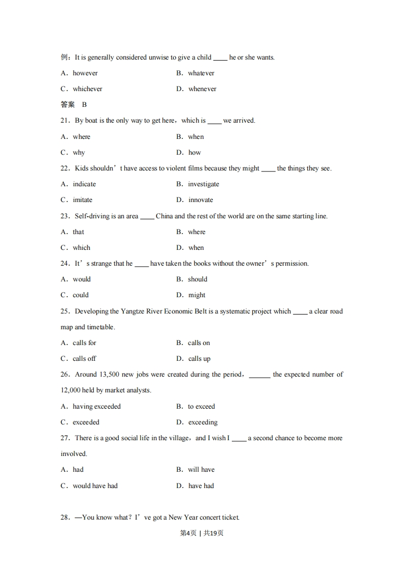 2018年普通高等学校招生全国统一考试(江苏卷)第一部分听力(共两节,满分20分)第一节(共5小题:每小题1分,满分5分)听下面5段对话。每段对话后有一个小题,从题中所给的A、B、C三个选项中选出最佳选项。听完每段对话后,你都有10秒钟的时间来回答有关小题和阅读下一小题。每段对话仅读一遍。1.What will James do tomorrow?A.Watch a TV program.B.Give a talk.C.Write a report.2.What can we say about the woman?A.She's generous.B.She's curious.C.She's helpful.3.When does the train leave?A.At6:30B.At8:30C.At10:30.4.How does the woman go to work?A.By car.B.On footC.By bike5.What is the probable relationship between the speakers?A.Classmates.B.Teacher and student.C.Doctor and patient.第二节(共15小题:每小题1分,满分15分)听下面5段对话或独白。每段对话或独白后有几个小题,从题中所给的A、B、C三个选项中选出最佳选项。听每段对话或独白前,你将有时间阅读各个小题,每小题5秒钟:听完后,各小题将给出5秒钟的作答时间。每段对话或独白读两遍。听第6段材料,回答第6、7题。6.What does the woman regret?第1页1共19页A.Giving up her research.B.Dropping out of college.C.Changing her major7.What is the woman interested in studying now?A.Ecology.B.Education.C.Chemistry.听第7段材料,回答第8、9题。8.What is the man?A.A hotel manager.B.A tour guide.C.A taxi driver.9.What is the man doing for the woman?A.Looking for some local foods.B.Showing her around the seaside.C.Offering information about a hotel.听第8段材料,回答第10至12题。10.Where does the conversation probably take place?A.In an office.B.At home.C.At a restaurant.11.What will the speakers do tomorrow evening?A.Go to a concert.B.Visit a friend.C.Work extra hours12.Who is Alice going to call?A.Mike.B.Joan.C.Catherine.听第9段材料,回答第13至16题。13.Why does the woman meet the man?A.To look at an apartment.B.To deliver some fumiture.C.To have a meal together.第2页|共19页14.What does the woman like about the carpet?A.Its colorB.Its designC.Its quality15.What does the man say about the kitchen?A.It's a good size.B.It's newly painted.C.It's adequately equipped.16.What will the woman probably do next?A.Go downtown.B.Talk with her friend.C.Make payment.听第10段材料,回答第17至20题。17.Who is the speaker probably talking to?A.Movie fans.B.News reporters.C.College students.18.When did the speaker take English classes?A.Before he left his hometownB.After he came to AmericaC.When he was 15 years old.19.How does the speaker feel about his teacher?A.He's proud.B.He's sympathetic.C.He's grateful.20.What does the speaker mainly talk about?A.How education shaped his life.B.How his language skills improved.C.How he managed his business well.第二部分:英语知识运用(共两节,满分35分)第一节:单项填空(共15小题:每小题1分,满分15分)请认真阅读下面各题,从题中所给的A、B、C、D四个选项中,选出最佳选项,并在答题卡上将该项涂黑。第3页1共19页