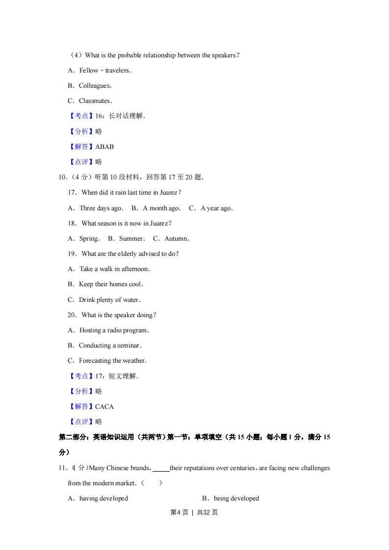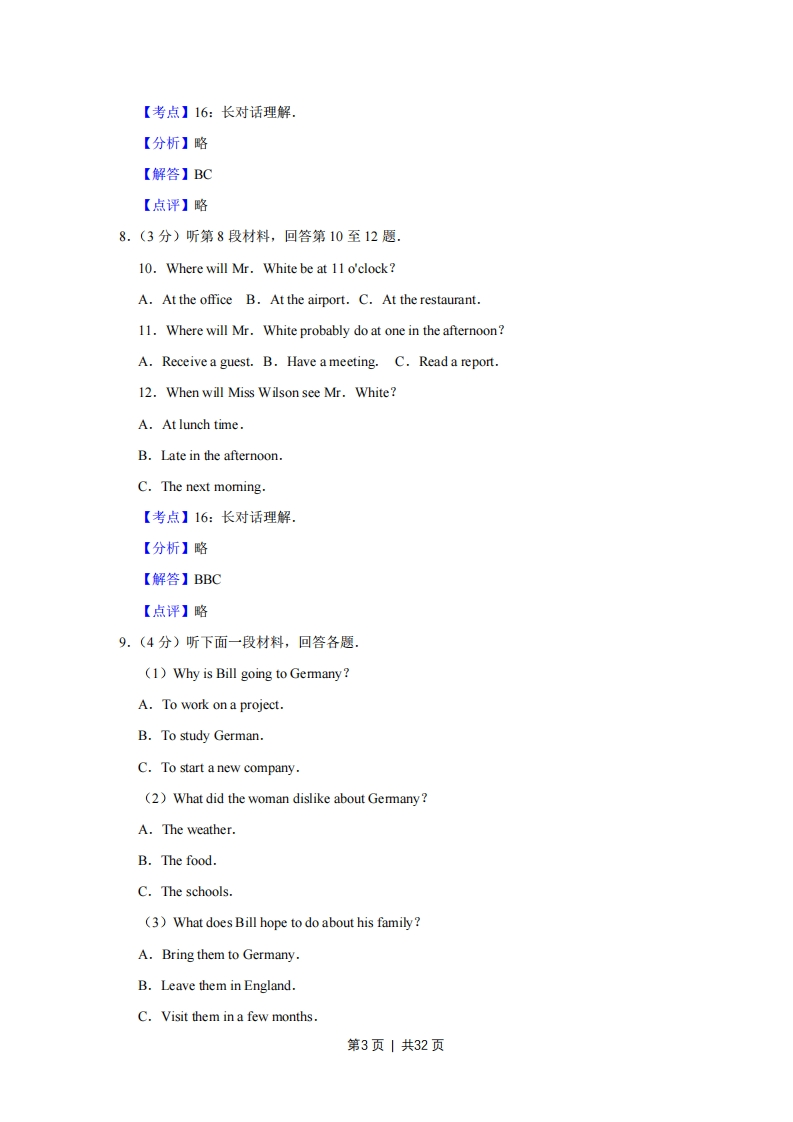 2017年江苏省高考英语试卷解析版事考答案与试题佩折第一部分听力(共两节,满分20分)1.(1)What does the woman think of the movie?A.It's amusing.B.It's exciting.C.It's disappointing.【考点】15:短对话理解.【分析】略【解答】C【点评】略2.(How will Susan spend most of her time in France?AA.Traveling around.B.Studying at a school.C.Looking after her aunt.【考点】15:短对话理解.【分析】M:Susan,I heard you are going to France.How long will you be staying there?W:A whole year.My aunt lives there.I'm going to do a one-month course at a languageschool and spend the rest of the time traveling.【解答】A【点评】略3.(1)What are the speakers talking about?A.Going out.B.Ordering drinks.C.Preparing for a party.【考点】15:短对话理解.【分析】略【解答】C【点评】略第1页|共32页4.(1)Where are the speakers?A.In a classroom.B.In a library.C.In a bookstore.【考点】15:短对话理解.【分析】略【解答】B【点评】略5.(1分)What is the man going to do?A.Go on Internet.B.Make a phone call.C.Take a train trip.【考点】15:短对话理解.【分析】略【解答】A【点评】略6.(2分)听第6段材料,回答第6、7题.6.What is the woman looking for?A.An information office.B.A police stationC.A shoe repair shop.7.What is the Town Guide according to the man?A.A brochure.B.A newspaper.C.A map.【考点】16:长对话理解.【分析】略【解答】CA【点评】略7.(2分)听第7段材料,回答第8、9题,8.What does the man say about the restaurant?A.It's the biggest one around.B.It offers many tasty dishes.C.It's famous for its seafood.9.What will the woman probably order?A.Fried fish B.Roast chicken.C.Beef steak.第2页1共32页【考点】16:长对话理解.【分析】略【解答】BC【点评】略8.(3分)听第8段材料,回答第10至12题.10.Where will Mr.White be at 11 o'clock?A.At the office B.At the airport.C.At the restaurant.11.Where will Mr.White probably do at one in the afternoon?A.Receive a guest.B.Have a meeting.C.Read a report.12.When will Miss Wilson see Mr.White?A.At lunch time.B.Late in the afternoonC.The next moming.【考点】16:长对话理解.【分析】略【解答】BBC【点评】略9.(4分)听下面一段材料,回答各题.(1)Why is Bill going to Germany?A.To work on a project.B.To study GermanC.To start a new company.(2)What did the woman dislike about Germany?A.The weather.B.The food.C.The schools.(3)What does Bill hope to do about his family?A.Bring them to Germany.B.Leave them in England.C.Visit them in a few months.第3页1共32页