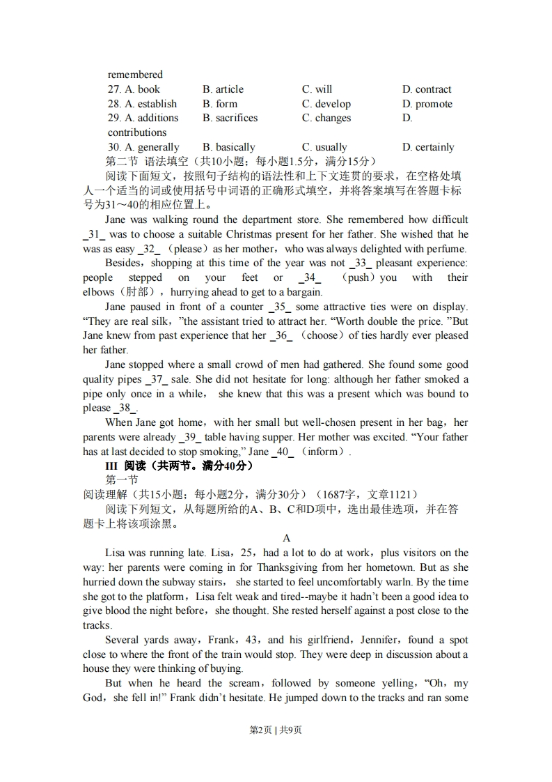 密★启用前试卷类型:A2009年普通高等学校招生全国统一考试(广东卷)英语本试卷共12页,四大题,满分150分。考试用时120分钟。注意事项:1.答卷前,考生务必用黑色字迹的钢笔或签字笔将自己的姓名和考生号、试室号、座位号填写在答题卡上。用2B铅笔将试卷类型(A)填涂在答题卡相应位置上。将条形码横贴在答题卡右上角“条形码粘贴处”。2.选择题每小题选出答案后,用2B铅笔把答题卡上对应题目选项的答案信息点涂黑,如需改动,用橡皮擦千净后,再选涂其他答案,答案不能答在试卷上。3.非选择题必须用黑色字迹钢笔或签字笔作答,答案必须写在答题卡各题目指定区域内相应位置上:如需改动,先划掉原来的答案,然后再写上新的答案:不准使用铅笔和涂改液。不按以上要求作答的答案无效。4.考生必须保持答题卡的整洁。考试结束后,将试卷和答题卡一并交回。I听力(共两节。满分35分)第一节听力理解(5段共15小题:每小题2分,满分30分)Ⅱ语言知识及应用(共两节。满分35分)第一节完形填空(共10小题:每小题2分,满分20分)阅读下面短文,掌握其大意,然后从21~30各题所给的A、B、C和D项中,选出最佳选项,并在答题卡上将该项涂黑。Alfred Nobel became a millionaire and changed the ways ofmining,construction,and warfare as the inventor of dynamite ()On April12,1888,Alfred's brother Ludwig died of heart attack.A major French newspaper21 his brother for him and carried an article 22 the death of Alfred Nobel."Themerchant of death is dead."the article read."Dr.AlfredNobel,who became 23 by finding ways to kill more people faster than everbefore,died yesterday."Nobel was 24 to find out not that he had died,butthat,when his time was up,he would be thought of only as one who profited from_25_and destruction.To make sure that he was 26 with love and respect.Nobel arranged in his 27to give the largest part of his money to 28 the Nobel prizes,which would beawarded to people who made great 29 to the causes of peace,literature,and thesciences.So 30,Nobel had to die before he realized what his life was reallyabout.21.A.foundB.misunderstoodC.mistookD.judged22.A.introducingB.announcingC.implyingD.advertising23.A.famousB.sickC.richD.popular24.A.upsetB.anxiousC.excitedD.pleased25.A.deathB.diseaseC.troubleD.attack26.A.repaidB.describedC.supportedD第1页|共9页remembered27.A.bookB.articleC.willD.contract28.A.establishB.formC.developD.promote29.A.additionsB.sacrificesC.changesDcontributions30.A.generallyB.basicallyC.usuallyD.certainly第二节语法填空(共10小题:每小题1.5分,满分15分)阅读下面短文,按照句子结构的语法性和上下文连贯的要求,在空格处填人一个适当的词或使用括号中词语的正确形式填空,并将答案填写在答题卡标号为31~40的相应位置上。Jane was walking round the department store.She remembered how difficult31 was to choose a suitable Christmas present for her father.She wished that hewas as easy 32(please)as her mother,who was always delighted with perfume.Besides,shopping at this time of the year was not 33 pleasant experience:people stepped on your feet or 34(push)you with theirelbows(肘部),hurrying ahead to get to a bargain.Jane paused in front of a counter 35 some attractive ties were on display."They are real silk,"the assistant tried to attract her."Worth double the price."ButJane knew from past experience that her 36(choose)of ties hardly ever pleasedher father.Jane stopped where a small crowd of men had gathered.She found some goodquality pipes 37 sale.She did not hesitate for long:although her father smoked apipe only once in a while,she knew that this was a present which was bound toplease 38When Jane got home,with her small but well-chosen present in her bag,herparents were already_39_table having supper.Her mother was excited."Your fatherhas at last decided to stop smoking,"Jane 40(inform).Ⅱ