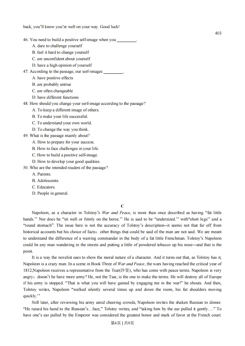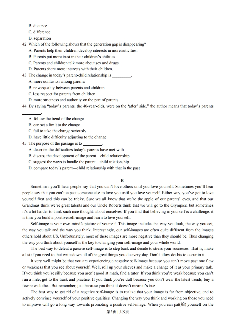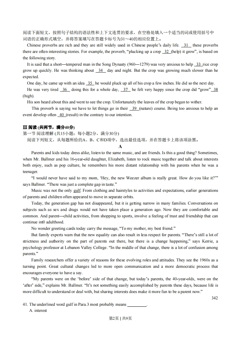 绝密★启用前试卷类型:B2008年普通高等学校招生全国统一考试(广东卷)英语本试卷共12页,四大题,满分150分。考试用时120分钟。Ⅱ语言知识及应用(共两节,满分35分)第一节完形填空(共10小题:每小题2分,满分20分)阅读下面短文,掌握其大意,然后从21一30各题所给的A、B、C和D项中,选出最佳选项,并在答题卡上将该项涂黑。Tales of the supernatural are common in all parts of Britain.In particular,there was (and perhaps still is)abelief in fairies().Not all of these 21 are the friendly,people-loving characters that appear in Disney films,and in some folktales they are 22 and cause much human suffering.This is true in the tales about theChangeling These tell the story of a mother whose baby grows 23 and pale and has changed so much that it isalmost 24 to the parents.It was then 25 that the fairies had come and stolen the baby away and 26 thehuman baby with a fairy Changeling.There were many ways to prevent this from happening:hanging a knife overthe baby's head while he slept or covering him with some of his father's clothes were just two of therecommended 27.However,hope was not lost even if the baby had been 28.In those cases there was often away to get the 29 baby back.You could 30the Changeling on the fire-then it would rise up the chimney,and you would hear the sound of fairies'laughterand soon after you would find your own child safe and sound nearby.21.A.babiesB.believersC.fairiesD.supermen22.A.powerful B.cruelC.frightenedD.extraordinary23.A.sickB.slimC.shortD.small24.A.uncomfortable B.unbelievable C.unacceptableD.unrecognizable25.A.fearedB.predictedC.heardD.reported26.A.coveredB.changedC.replacedD.terrified27.A.casesB.toolsC.stepsD.methods28.A.missedB.stolenC.foundD.lost29.A.littleB.paleC.sadD.real30.A.seizeB.burnC.placeD.hold第二节语法填空(共10小题,每小题1.5分,满分15分)第1页1共9页阅读下面短文,按照句子结构的语法性和上下文连贯的要求,在空格处填入一个适当的词或使用括号中词语的正确形式填空,并将答案填写在答题卡标号为31~40的相应位置上。Chinese proverbs are rich and they are still widely used in Chinese people's daily life.31 these proverbsthere are often interesting stories.For example,the proverb,"plucking up a crop 32 (help)it grow",is based onthe following story.It is said that a short-tempered man in the Song Dynasty (960-1279)was very anxious to help 33 rice cropgrow up quickly.He was thinking about 34 day and night.But the crop was growing much slower than heexpected.One day,he came up with an idea 35 he would pluck up all of his crop a few inches.He did so the next day.He was very tired 36 doing this for a whole day,37 he felt very happy since the crop did "grow"38(high).His son heard about this and went to see the crop.Unfortunately the leaves of the crop began to wither.This proverb is saying we have to let things go in their 39_(nature)course.Being too anxious to help anevent develop often 40 (result)in the contrary to our intention.Ⅲ阅读(共两节,满分40分)第一节阅读理解(共15小题:每小题2分,满分30分)阅读下列短文,从每题所给的A、B、C和D项中,选出最佳选项,并在答题卡上将该项涂黑。AParents and kids today dress alike,listen to the same music,and are friends.Is this a good thing?Sometimes,when Mr.Ballmer and his 16-year-old daughter,Elizabeth,listen to rock music together and talk about interestsboth enjoy,such as pop culture,he remembers his more dist