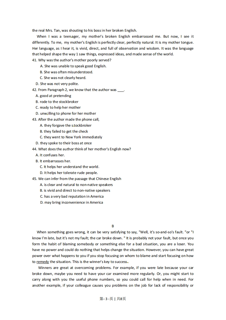 绝密★启用前试卷类型:A2010年普通高等学校招生全国统一考试(广东卷)英语本试卷共12页,四大题,满分150分。考试用时120分钟。注意事项:1答卷前,考生务必用黑色字迹的钢笔或签字笔将自己的姓名和考生号、试室号、座位号填写在答题卡上。用2B铅笔将试卷类型(A)填涂在答题卡相应位置上。将条形码横贴在答题卡右上角“条形码粘贴处”。2选择题每小题选出答案后,用2B铅笔把答题卡上对应题目选项的答案信息点涂黑,如需改动,用橡皮擦干净后,再选涂其他答案,答案不能答在试卷上。3非选择题必须用黑色字迹钢笔或签字笔作答,答案必须写在答题卡各题目指定区域内相应位置上:如需改动先划掉原来的答案,然后再写上新的答案:不准使用铅笔和涂改液。不按以上要求作答的答案无效。4考生必须保持答题卡的整洁。考试结束后,将试卷和答题卡一井交回.。Ⅱ语言知识及应用【共两节,满分35分)第一节完形填空(共10小题:每小题2分.满分20分)阅读下面短文,掌握其大意.然后从2130各题所给的A、B、C和D项中,选出最佳选项,并在答题卡上将该项涂黑。Every country has its own culture.Even though each country uses doors,doors may have 21 functions and purposes which leadto 22 differences.When I first to came to America,I noticed that a public building had two different 23 and theyhad distinct functions.You have to push the door with the word "PUSH"to go out of the buildingand to pull the door with the word "PULL"to 24 the building.This was new to me,because weuse the 25 door in South Korea.For quite a few times I failed to go out of a shopping centre andwas embarrassed.The way of using school bus doors was also 26 to me.I used to take the school bus to closes.The school decided that when the driver opened both the front and back doom,27who were getting off the bus should get off first,and students who were getting on should get on28.in South Korea,we do not need to wait for people to get off.One morning I hurried to thebus,and when the bus doors opened,I 29 tried to get on the school bus through the front door.All the students around looked at me.I was totally 30,and my face went red.21.A.differentB.importantC.practicalD.unusual22.A.nationalB.embarrassingC.culturalD.amazing23.A.exitsB.entrancesC.signsD.doors24.A.enterB.leaveC.openD.close25.A.mainB.sameC.frontD.back26.A.annoyingB.hardC.satisfyingD.strange27.A.parentsB.studentsC.teachersD.driven28.A.soonerB.laterC.fasterD.earlier29.A.politelyB.patientlyC.unconsciouslyD.slowly第-1-页1共8页30.A.embarrassed B.annoyedC.unsatisfiedD.Excited第二节语法填空(共10小题:每小题5分.满分5分)阅读下面短文.按照句子结构的语法性和上下文连贯的要求,在空格处填入一个适当的词或使用括号中词语的正确形式填空,并将答案填写在答题卡标号为31一40的相应位置上。A young man,while traveling through a desert,came across a spring of clear water.31water was sweet.He filled his leather container so that he could bring some back to an elder 32had been his teacher.After a four-day journey,the young man 33(present the water to theold man.His teacher took a deep drink,smiled34(warm )and thanked his student very muchfor the sweet water.The young man went home 35a happy heart.After the student left,the teacher let 36 student taste the water.He spit it out,37(say)it was awful.Apparently,it was no longer fresh because of the old leather container.He askedhis teacher,"Sir,the water was awful.Why did you pretend to like 38 ?The teacher replied,"You tasted the water.Itasted the girl.The water was simply thecontainer for an act of kindness and love.Nothing could be 39(sweet)."We understand this lesson best 40 we receive gifts of love from children.Whether it is a cheappipe or a diamond necklace,the proper response is appreciation.We love th
