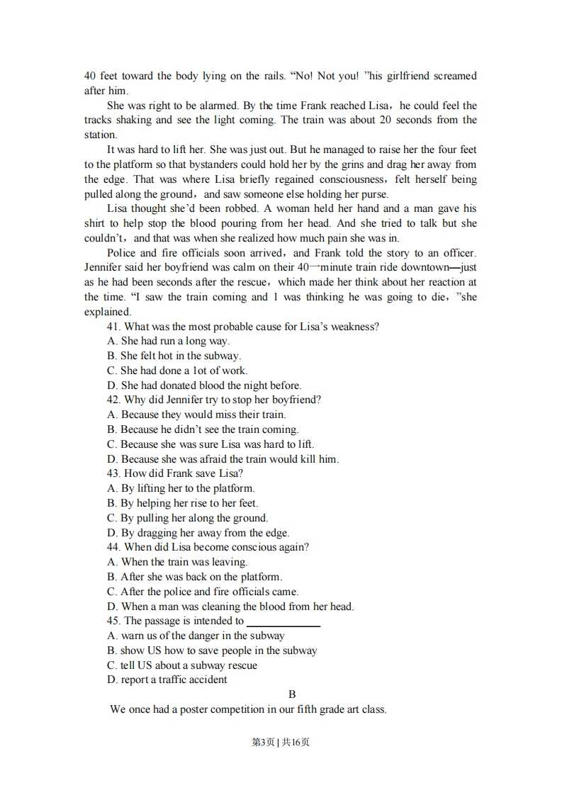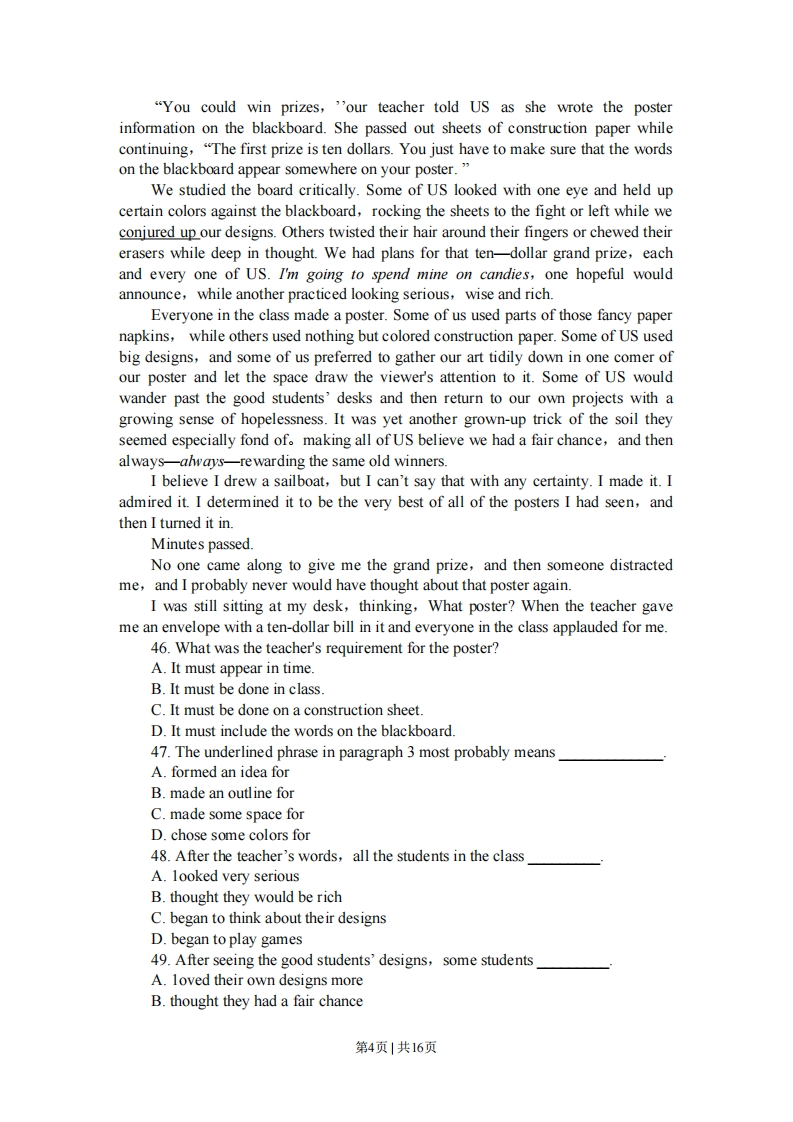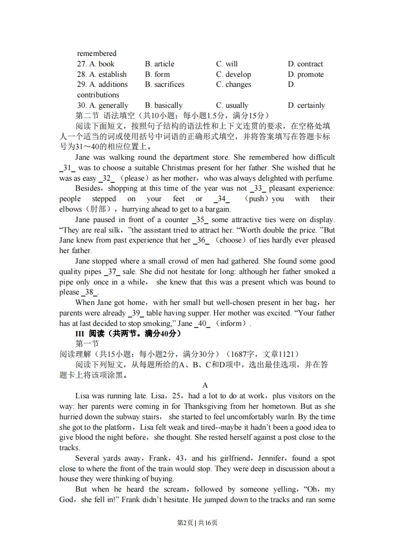 密★启用前试卷类型:A2009年普通高等学校招生全国统一考试(广东卷)英语本试卷共12页,四大题,满分150分。考试用时120分钟。注意事项:1.答卷前,考生务必用黑色字迹的钢笔或签字笔将自己的姓名和考生号、试室号、座位号填写在答题卡上。用2B铅笔将试卷类型(A)填涂在答题卡相应位置上。将条形码横贴在答题卡右上角“条形码粘贴处”。2.选择题每小题选出答案后,用2B铅笔把答题卡上对应题目选项的答案信息点涂黑,如需改动,用橡皮擦千净后,再选涂其他答案,答案不能答在试卷上。3.非选择题必须用黑色字迹钢笔或签字笔作答,答案必须写在答题卡各题目指定区域内相应位置上:如需改动,先划掉原来的答案,然后再写上新的答案:不准使用铅笔和涂改液。不按以上要求作答的答案无效。4.考生必须保持答题卡的整洁。考试结束后,将试卷和答题卡一并交回。I听力(共两节。满分35分)第一节听力理解(5段共15小题:每小题2分,满分30分)Ⅱ语言知识及应用(共两节。满分35分)第一节完形填空(共10小题:每小题2分,满分20分)阅读下面短文,掌握其大意,然后从21~30各题所给的A、B、C和D项中,选出最佳选项,并在答题卡上将该项涂黑。Alfred Nobel became a millionaire and changed the ways ofmining,construction,and warfare as the inventor of dynamite ()On April12,1888,Alfred's brother Ludwig died of heart attack.A major French newspaper21 his brother for him and carried an article 22 the death of Alfred Nobel."Themerchant of death is dead."the article read."Dr.AlfredNobel,who became 23 by finding ways to kill more people faster than everbefore,died yesterday."Nobel was 24 to find out not that he had died,butthat,when his time was up,he would be thought of only as one who profited from_25_and destruction.To make sure that he was 26 with love and respect.Nobel arranged in his 27to give the largest part of his money to 28 the Nobel prizes,which would beawarded to people who made great 29 to the causes of peace,literature,and thesciences.So 30,Nobel had to die before he realized what his life was reallyabout.21.A.foundB.misunderstoodC.mistookD.judged22.A.introducingB.announcingC.implyingD.advertising23.A.famousB.sickC.richD.popular24.A.upsetB.anxiousC.excitedD.pleased25.A.deathB.diseaseC.troubleD.attack26.A.repaidB.describedC.supportedD第1页1共16页remembered27.A.bookB.articleC.willD.contract28.A.establishB.formC.developD.promote29.A.additionsB.sacrificesC.changesDcontributions30.A.generallyB.basicallyC.usuallyD.certainly第二节语法填空(共10小题:每小题1.5分,满分15分)阅读下面短文,按照句子结构的语法性和上下文连贯的要求,在空格处填人一个适当的词或使用括号中词语的正确形式填空,并将答案填写在答题卡标号为31~40的相应位置上。Jane was walking round the department store.She remembered how difficult31 was to choose a suitable Christmas present for her father.She wished that hewas as easy 32(please)as her mother,who was always delighted with perfume.Besides,shopping at this time of the year was not 33 pleasant experience:people stepped on your feet or 34(push)you with theirelbows(肘部),hurrying ahead to get to a bargain.Jane paused in front of a counter 35 some attractive ties were on display."They are real silk,"the assistant tried to attract her."Worth double the price."ButJane knew from past experience that her 36(choose)of ties hardly ever pleasedher father.Jane stopped where a small crowd of men had gathered.She found some goodquality pipes 37 sale.She did not hesitate for long:although her father smoked apipe only once in a while,she knew that this was a present which was bound toplease 38When Jane got home,with her small but well-chosen present in her bag,herparents were already_39_table having supper.Her mother was excited."Your fatherhas at last decided to stop smoking,"Jane 40(inform).