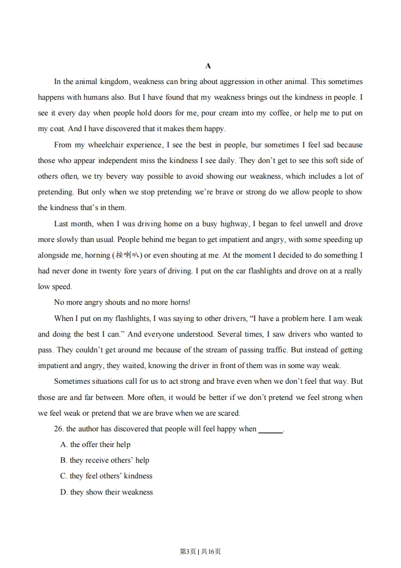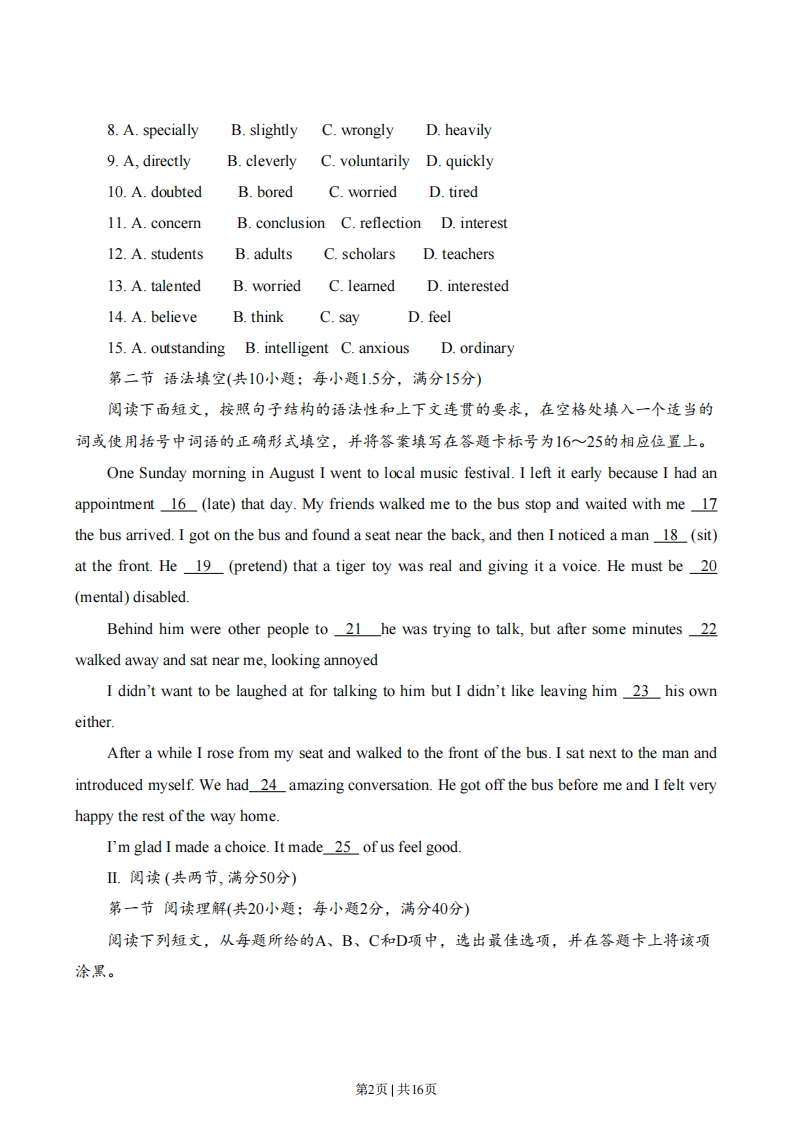 2011年普通高等学校招生全国统一考试(广东A卷)英语I.语言知识及应用(共两节。满分35分)第一节完形填空(共15小题:每小题2分,满分30分)阅读下面短文,掌握其大意,然后从115各题所给的A、B、C和D项中,选出最佳选项,并在答题卡上将该项涂黑。It has been argued by some that gifted children should be grouped in special classes,The 1has been on the belief that in regular classes these children are held back in their intellectual(智力的)growth by2 situation that has designed for the_3 children..There can be little doubt that 4 classes can help the gifted children to graduate earlier andtake their place in life sooner.However,to take these 5 out of the regular classes may createserious problems.I observed a number of 6 children who were taken out of a special class and placed in a 7class.In the special class,they showed little ability to use their own judgment,relying 8 on theirteachers'directions.In the regular class,having no worry about keeping up,they began to reflect 9on many problems,some of which were not on the school program.Many are concerned that gifted children become 10 and lose interest in learning.Howeverthis 11 is more often from parents and teachers than from students,and some of these12simply conclude that special classes should be set up for those who are13.Some top students dofeel bored in class,but why they 14 so goes far beyond the work they have in school.Studieshave shown that to be bored is to be anxious.The gifted child whop is bored is an 15 child.1.A.principle B.theory C.arguments D.classification2.A.designing B.grouping C.learningD.living3.A.smartB.curiousC.matureD.average4.A.regularB.specialC.smallD.creative5.A.childrenB.programs C.graduatesD.designs6.A.intelligentB.competent C.ordinaryD.independent7.A.separateB.regularC.newD.boring第1页1共16页8.A.speciallyB.slightlyC.wronglyD.heavily9.A,directlyB.cleverlyC.voluntarily D.quickly10.A.doubtedB.boredC.worriedD.tired11.A.concernB.conclusion C.reflection D.interest12.A.studentsB.adultsC.scholarsD.teachers13.A.talentedB.worriedC.learnedD.interested14.A.believeB.thinkC.sayD.feel15.A.outstanding B.intelligent C.anxiousD.ordinary第二节语法填空(共10小题:每小题1.5分,满分15分)阅读下面短文,按照句子结构的语法性和上下文连贯的要求,在空格处填入一个适当的词或使用括号中词语的正确形式填空,并将答案填写在答题卡标号为16~25的相应位置上。One Sunday morning in August I went to local music festival.I left it early because I had anappointment 16 (late)that day.My friends walked me to the bus stop and waited with me 17the bus arrived.I got on the bus and found a seat near the back,and then I noticed a man 18 (sit)at the front.He 19 (pretend)that a tiger toy was real and giving it a voice.He must be 20(mental)disabled.Behind him were other people to 21 he was trying to talk,but after some minutes 22walked away and sat near me,looking annoyedI didn't want to be laughed at for talking to him but I didn't like leaving him 23 his owneither.After a while I rose from my seat and walked to the front of the bus.I sat next to the man andintroduced myself.We had 24 amazing conversation.He got off the bus before me and I felt veryhappy the rest of the way home.I'm glad I made a choice.It made 25 of us feel good.Ⅱ.阅读(共两节