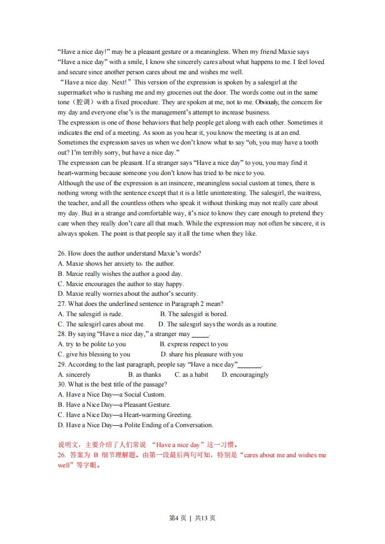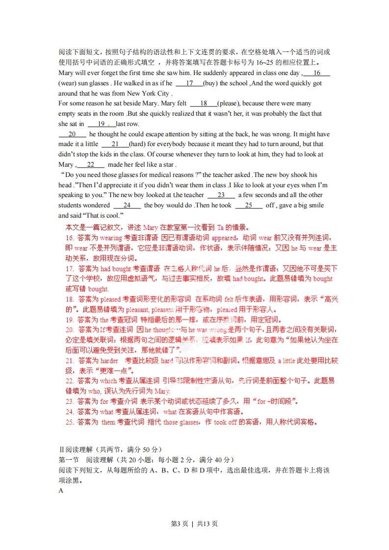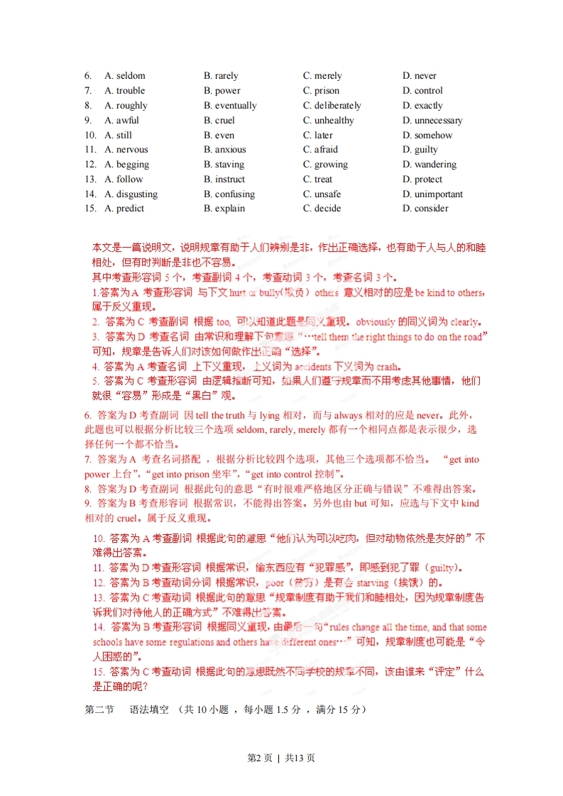 2012年普通高等学校招生全国统一考试(广东卷)A英语本试卷共12页,三大题,满分135分。考试用时120分钟.注意事项:1.答卷前,考生务必用黑色字迹的钢笔或签字笔将自己的姓名和考生号、试室号、座位号填写在答题卡上。用2B铅笔将试卷类型(A)填涂在答题卡相应位置上。将条形码横贴在答题卡右上角“条形码粘贴处”。2.选择题每小题选出答案后,用2B铅笔把答题卡上对应题目选项的答案信息点涂黑,如需改动,用橡皮擦干净后,再选涂其他答案,答案不能答在试卷上。3.非选择题必须用黑色字迹钢笔或签字笔作答,答案必须写在答题卡各题目指定区域相应位置上:如需改动,先划掉原来的答案,然后再写上新的答案:不准使用铅笔和涂改液。不按以上要求作答的答案无效。4.考生必须保持答题卡的整洁。考试结束后,将试卷和答题卡一并交回。I语言知识及应用(共两节,满分45分)第一节完形填空(共15小题:每小题2分,满分30分)阅读下面短文,掌握其大意,然后从1~15各题所给的A、B、C和D项中,选出最佳选项,并在答题卡上将该项涂黑。We all know that some things are obviously right.For example,it is right to be 1 to otherpeople.It is also right to look after the environment.Some things are 2 wrong,too.Forinstance,we should not hurt or bully()others,nor should we litter.Rules often tell us what isright or wrong.Rules can help the public make the right 3,and remain safe.Car drivers have to obeytraffic regulations that tell them the right things to do on the road to avoid crashes.Cyclists whogive signals before turning or stopping help prevent4If people follow rules without taking other matters into consideration,it will be 5 for themto form what is sometimes called a "black and white"view For example,they may believe thatpeople should always tell the truth,and that lying is6 acceptable.Such people always stickto their views,even if it means that they may get into 7.Sometimes it may not be so easy to know 8 what is right or wrong.Some people choose notto eat meat because they believe that it is 9 to eat animals,but others argue that they caneat meat and 10 be kind to animals;some insist that stealing is always wrong,but othersthink that one does not need to feel to 11 when stealing some food to eat.iflives in a reallypoor area and he is 12.Rules help us live together in harmony,because they show us theright way to 13 other.However,some people argue that rules may be 14 havingobserved that rules change all the time,and that some schools have some regulations and otherhave different ones----so who is to 15 what is right?1.A.kindB.sensitiveC.fairD.generous2.A.equallyB.slightlyC.clearlyD.increasingly3.A.suggestionB.conclusionsC.turnsD.choices4.A.accidentsB.mistakesC.fallsD.deaths5.A.interestingB.vitalC.easyD.valuable第1页|共13页6.A.seldomB.rarelyC.merelyD.never7.A.troubleB.powerC.prisonD.control8.A.roughlyB.eventuallyC.deliberatelyD.exactly9.A.awfulB.cruelC.unhealthyD.unnecessary10.A.stillB.evenC.laterD.somehow11.A.nervousB.anxiousC.afraidD.guilty12.A.beggingB.stavingC.growingD.wandering13.A.followB.instructC.treatD.protect14.A.disgustingB.confusingC.unsafeD.unimportant15.A.predictB.explainC.decideD.consider本文是一篇说明文,说明规章有助于人们辨别是非,作出正确选择,也有助于人与人的和睦相处,但有时判断是非也不容易。其中考查形容词5个,考查副词4个,考查动词3个,考查名词3个。1.答案为A考查形容词与下文hurt or bully(负)others意义相对的应是be kind to others,属于反义重现。2.答案为C考查副词根据too,可以知道此题同以重现.obviously的同义词为clearly.3.答案为D考查名词由常识和理解下句意思“'tell them the right things to do on the road”可知,规章是告诉人们对该如何做作出正确“选择”。4.答案为A考查名词上下义重现,上义词为accidents下义词为crash。5.答案为C考查形容问由逻辑推断可知,如果人们遵于规章而不用考虑其他事情,他们就很“容易”形成是“黑白”观。6.答案为D考查副词因tell the truth与ying相对,而与always相对的应是never。此外,此题也