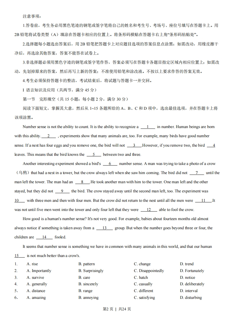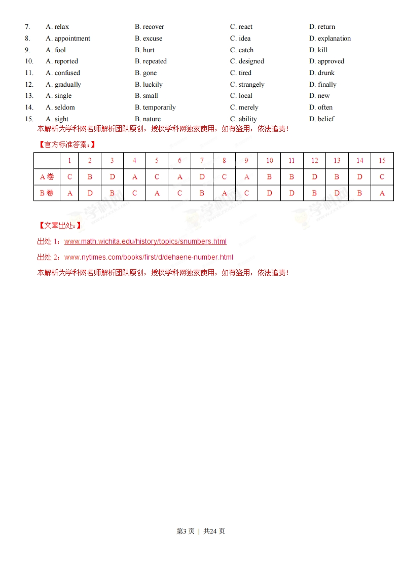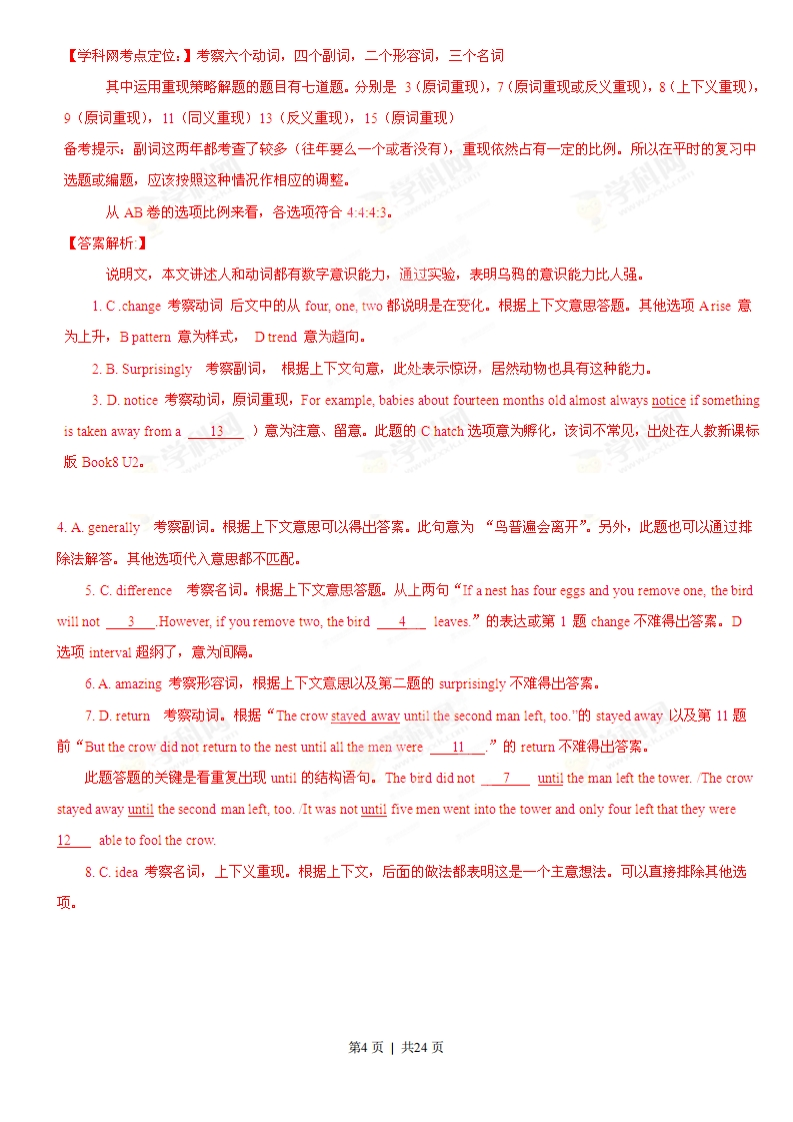 2013年高考广东卷英语解析(精编版)难度偏易。与去年相当,考点全面,覆盖全部高考考纲考点。很好的兼顾了试题的公平性、作答的可操作性以及对考生区分度的试题。我们可以看到整卷各个篇章的内容,基本上都是同学在平常学习生活在各种媒体报道上会看到听到了解到的内容,而这样的内容本身可以大大降低不同生活的环境对来自不同地方的考生在作答时候的影响,从而保证了它的一个公平性。第二方面,各个题型的题目设置都很到位地考察了考生在各个方面的英语学科的能力。全卷的文本信息和知识都是在高三学生的认知能力范围内,体现了国家英语课程标准(新课标)的理念与目标要求。与往年相比,有规律可循,但也有所不同。如完形填空的重现考察较少。副词和去年一年都是较多。出现了两个超纲选项的词hatch和interval.语法填空考点分布与往年有所不同,考察了两个词性变化,没有考察代词。阅读理解方面,考察直接从文章中找答案的情况较少,干扰出现的情况较多,增加了试题的难度。写作命题的出处来自于新闻时事,这是和往年非常不同的地方,几乎无法想象会考这样的题目。往年考察的都会和学校生活相关。尽管如此,学生还是有东西写。给2014届备考的启示:这给到我们的启示是,基础依然是王道,不能依靠猜题押题来备考。应该从高三第一轮的备考开始就做好每一个阶段的复习内容,考点一定要分布均匀,高频考点还是要特别关注。从细节上,策略上,大局上把备考做好。当前的完形填空,语法填空都可以在网络上找到出处,第三篇阅读理解之前有某地的完形填空都是这份材料。但都是有所改编或者换一种考法。所以我们自己命题时一定要对材料进行一些修改,换一种表达等。另外,也不能因为平时做过类似的题目就认为学生会考得很好。更不能认为题目简单好做,学生就一定会考得好。本解析为学科网名师解析团队原创,授权学科网独家使用,如有盗用,依法追责!绝密★启用前试卷类型:A2013年普通高等学校招生全国统一考试(广东卷)英语本试卷共12页,三大题,满分135分.考试用时120分钟第1页|共24页注意事项:1答卷前,考生务必用黑色笔迹的钢笔或签字笔将自己的姓名和考生号、考场号、座位号填写在答题卡上。用2B铅笔将试卷类型(A)填涂在答题卡相应的位置上。将条形码横贴在答题卡右上角“条形码粘贴处”。2选择题每小题选出答案后,用2B铅笔把答题卡上对应题目选项的答案信息点涂黑:如需改动,用橡皮擦干净后,再选涂其他答案,答案不能答在试卷上。3.非选择题必须用黑色字迹的钢笔或签字笔作答,答案必须写在答题卡各题目指定区域内相应位置上:如需改动,先划掉原来的答案,然后再写上新的答案:不准使用铅笔和涂改液。不按以上要求作答的答案无效。4考生必须保持答题卡的整洁,考试结束后,将试题与答题卡一并交回。I语言知识及应用(共两节,满分45分)第一节完形填空(共15小题:每小题2分,满分30分)阅读下面短文,掌握其大意,然后从1~15各题所给的A、B、C和D项中,选出最佳选项,并在答题卡上将该项涂黑。Number sense is not the ability to count.It is the ability to recognize a 1 in number.Human beings are bomwith this ability.2,experiments show that many animals are,too.For example,many birds have good numbersense.If a nest has four eggs and you remove one,the bird will not 3However,if you remove two,the bird 4leaves.This means that the bird knows the5 between two and three.Another interesting experiment showed a bird's 6 number sense.A man was trying to take a photo of a crow(that had a nest in a tower,but the crow always left when she saw him coming.The bird did not 7 until theman left the tower.The man had an 8.He took another man with him to the tower.One man left and the otherstayed,but they did not 9 the bird.The crow stayed away until the second man left,too.The experiment was10with three men and then with four men.But the crow did not retum to the nest until all the men were 11.Itwas not until five men went into the tower and only four left that they were 12 able to fool the crow.How good is a human's number sense?It's not very good.For example,babies about fourteen months old almostalways notice if something is taken away from a 13 group.But when the number goes beyond three or four,thechildren are 14 fooled.It seems that number sense is something we have in common with many animals in this world,and that our human15is not much better than a crow's1.A.niseB.patternC.changeD.trend2.A.ImportantlyB.SurprisinglyC.DisappointedlyD.Fortunately3.A.surviveB.careC.hatchD.notice又A.generallyB.sincerelyC.casuallyD.deliberately5.A.distanceB.rangeC.differentD.interval6.A.amazingB.annoyingC.satisfyingD.disturbing第2页|共24页7.A.relaxB.recoverC.reactD.returnA.appointmentB.excuseC.ideaD.explanation9.A.foolB.hurtC.catchD.kill10.A.reportedB.r