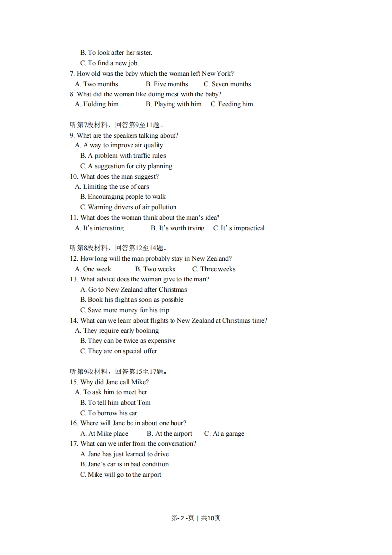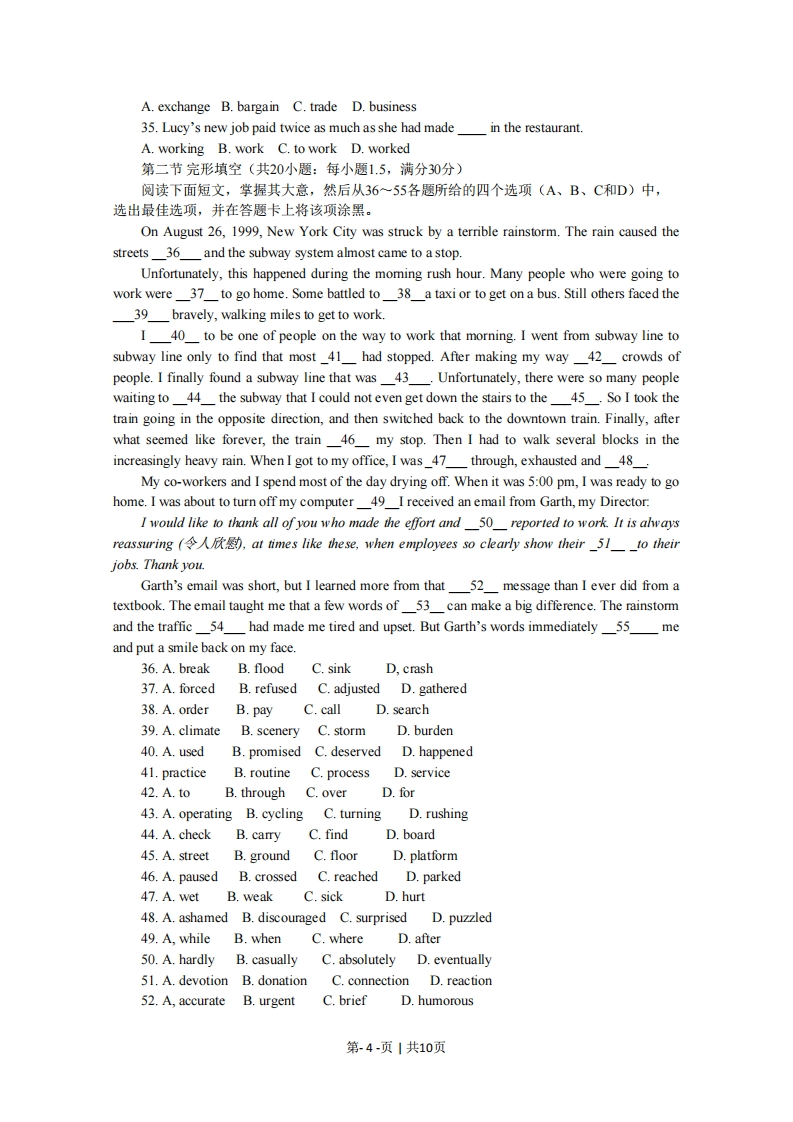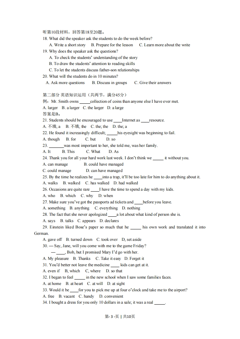 2008年普通高等学校招生全国统一考试(山东)英语本试卷分第一卷(选择题)和第二卷(非选择题)两部分。第一卷1至14页。第二卷1518页。考试结束,将本试卷和答题卡一并交回。第一卷注意事项。1.答题前,考生在答题卡上务必用直径0.5毫米黑色墨水签字笔将自己的姓名、准考证号填写清楚,并贴好条形码。请认真核准条形码上的准考证号、姓名和科目。2.每小题选出答案后,用2B铅笔把答题卡上对应题目的答案标号涂黑,如需改动,用橡皮擦干净后,再选涂其他答案示号,在试题卷上作答无效。第一部分听力(共两节,满分30分)做题时先将答案标在试卷上,录音内容结束后,你将有两分钟的时间将试卷上的答案转涂到答题卡上。第一节(共5小题:每小题1.5分,满分7.5分)听下面5段对话,每段对话后有一个小题,从题中所给的A、B、C三个选项中选出最佳选项,并标在试卷的相应位置。听完每段对话后,你都有10秒钟的时间来回答有关小题和阅读下一小题。每段对话仅读一遍。例:How much is the shirt?A.519.15B.59.15C.59.18案是B。1.What is the weather like?A.It's raining.B.It's cloudy.C.It's sunny.2.Who will go to China next month?A.Lucy.B.Alice.C.Richard.3.What are the speakers talking about?A.The men's sisterB.A filmC.An actor4.Where will the speakers meet?A.In Room 340B.In Room 314 C.In Room 2235.Where does the conversation most probably take place?A.In a restaurantB.In an officeC.At home第二节(共15小题:每小题1.5分,满分22.5分)听下面5段对话或独白,每段对话或独白后有几个小题,从题中所给的A、B、C三个选项中选出最佳选项,并标在试卷的相应位置。听每段对话或独白前,你将有时间阅读各个小题,每小题5秒钟:听完后,各小题将给出5秒钟的作答时间。每段对话独白读两遍。听第6段材料,回答第6至8题。6.Why did the woman go to New York?A.To spend some with the baby.第-1-页1共10页B.To look after her sister.C.To find a new job.7.How old was the baby which the woman left New York?A.Two monthsB.Five months C.Seven months8.What did the woman like doing most with the baby?A.Holding himB.Playing with him C.Feeding him听第7段材料,回答第9至11题。9.Whet are the speakers talking about?A.A way to improve air qualityB.A problem with traffic rulesC.A suggestion for city planning10.What does the man suggest?A.Limiting the use of carsB.Encouraging people to walkC.Warning drivers of air pollution11.What does the woman think about the man's idea?A.It's interestingB.It's worth trying C.It's impractical听第8段材料,回答第12至14题。12.How long will the man probably stay in New Zealand?A.One week B.Two weeks C.Three weeks13.What advice does the woman give to the man?A.Go to New Zealand after ChristmasB.Book his flight as soon as possibleC.Save more money for his trip14.What can we leam about flights to New Zealand at Christmas time?A.They require early bookingB.They can be twice as expensiveC.They are on special offer听第9段材料,回答第15至17题。15.Why did Jane call Mike?A.To ask him to meet herB.To tell him about TomC.To borrow his car16.Where will Jane be in about one hour?A.At Mike place B.At the airportC.At a garage17.What can we infer from the conversation?A.Jane has just learned to driveB.Jane's car is in bad conditionC.Mike will go to the airport第-2-页1共10页听第10段材料,回答第18至20题。18.What did the speaker ask the students to do the week before?A.Write a short story B.Prepare for the lesson C.Learn more about the write19.Why does the speaker ask the questions?A.To check the students'understanding of the storyB.To draw the students'attention to reading skillsC.To let the students discuss father-son relationships20.What will the students do in 10 minutes?A.Ask more questions B.Discuss in groups C.Give their answers第二部分英语知识运用(共两节,满分45分)Mr.Smith owns collection of coins than anyone else I have ever met.A.larger B.a larger C.the larger D.
