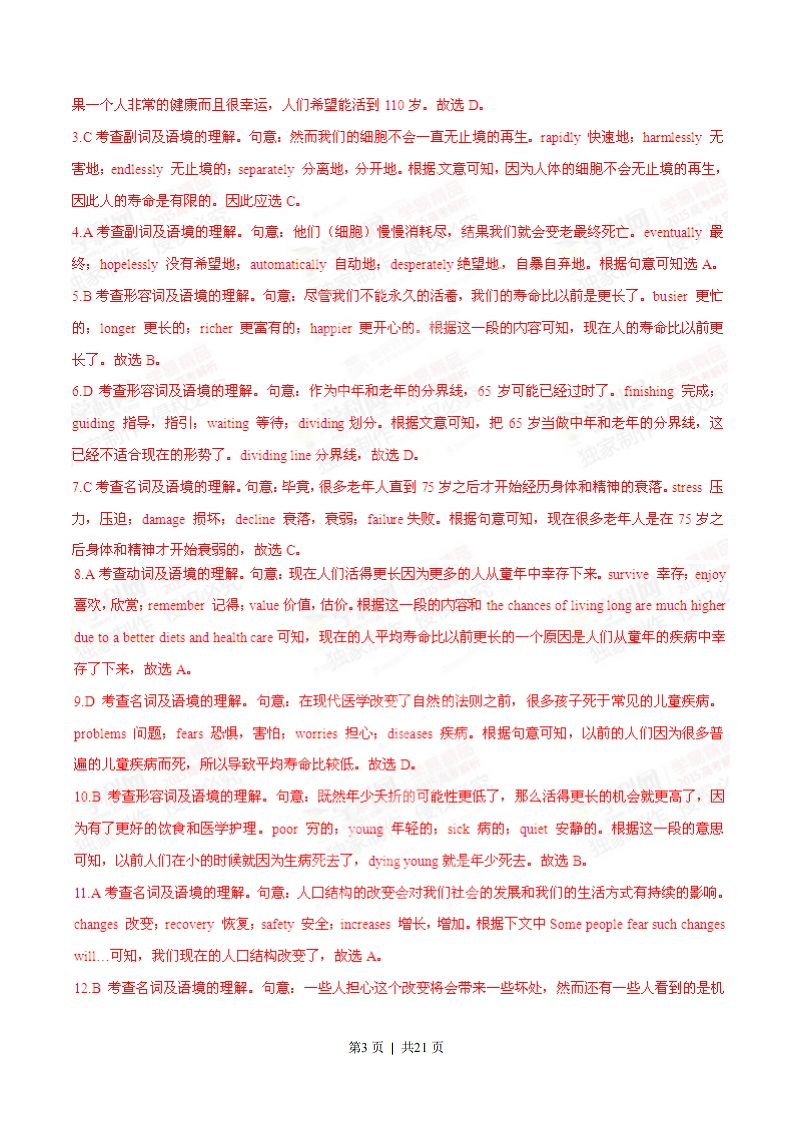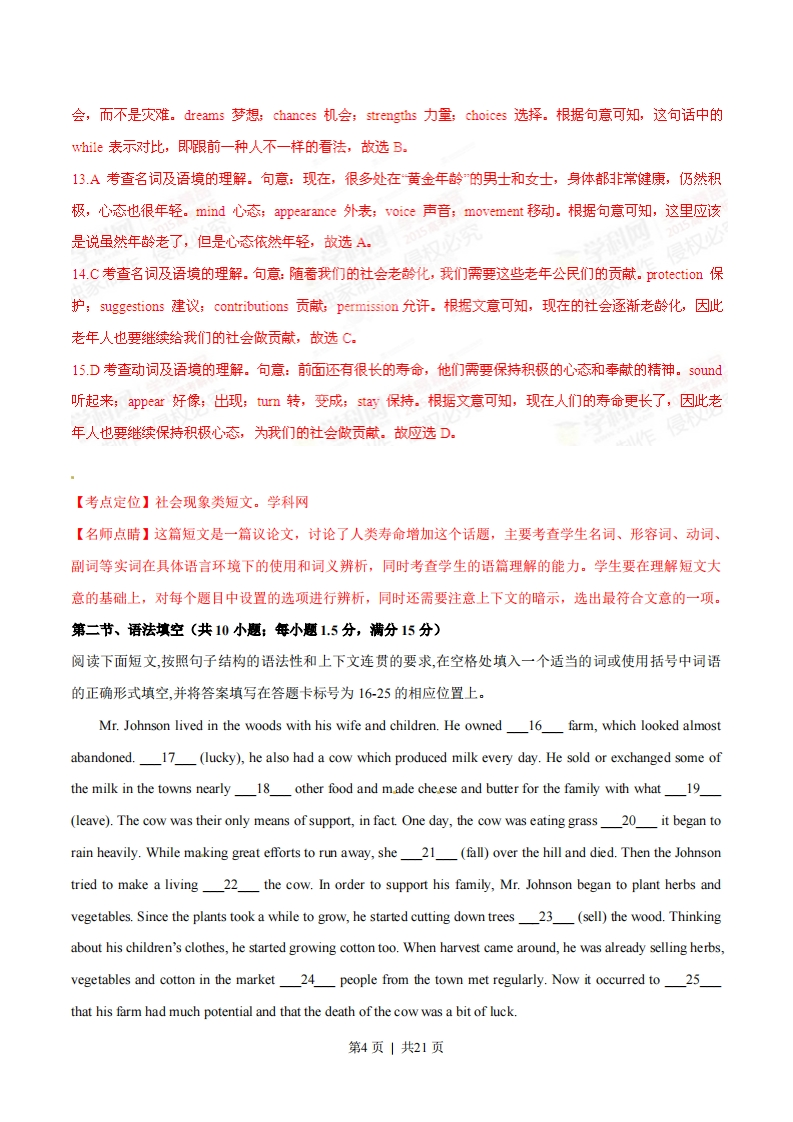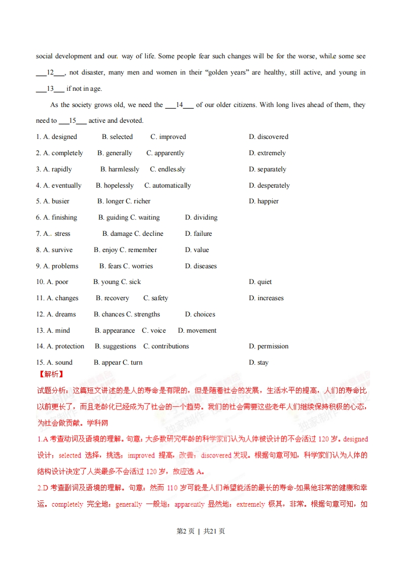 绝密★启用前试卷类型:B2015年普通高等学校招生全国统一考试(广东卷)英语试卷本试卷共12页,三大题,满分135分。考试用时120分钟。注意事项:1.答卷前,考生务必用黑色字迹的钢笔或签字笔将自己的姓名、考生号、试室号和座位号填写在答题卡上。用2B铅笔将试卷类型(B)填涂在答题卡相应位置上。将条形码横贴在答题卡右上角“条形码粘贴处”。2.选择题每小题选出答案后,用2B铅笔把答题卡上对应题目的答案信息点涂黑,如需改动,用橡皮擦干净后,再选涂其他答案,答案不能答在试卷上。3.非选择题必须用黑色字迹钢笔或签字笔作答,答案必须写在答题卡各题目指定区域内相应位置上:如需改动,先划掉原来的答案,然后再写上新的答案,不准使用铅笔和涂改液。不按以上要求作答的答案无效。4.考生必须保持答题卷和答题卡的整洁,考试结束后,将试卷、答题卷和答题卡一并交回。语言知识及应用(共两节,满分45分)语言知识及应用(共两节,满分45分)I.语言基础知识部分(共两节,满分45分)第一节、完形填空(共15小题:每小题2分,满分30分)阅读下面短文,掌握其大意,然后从1~15各题所给的A、B、C和D项中,选出最佳选项,并在答题卡上将该项涂黑。How long can human beings live?Most scientists who study old age think that the human body is1 tolive no longer than 120 years.However,110 years is probably the longest that anyone could hope to live-if heor she is 2 healthy and lucky.Some scientists even say we can live as long as 130 years!Yet,our cellssimply cannot continue to reproduce3.They wear out,and as a result,we get old and 4die.Even though we can't live forever,we are living a5 life than ever before.In 1900,the averageAmerican life span was only 47 years,but today it is 75 years!When does old age begin then?Sixty-five may be out-of-date as the6 line between middle age and old age.After all,many older people don't begin to experience physical and mental7 until after age 75.People are living longer because more people8childhood.Before modern medicine changed the lawsof nature,many children died of common childhood 9.Now that the chances of dying10 are muchlower,the chances of living long are much higher due to better diets and health care.On the whole,our population is getting older.The11 in our population will have lasting effects on our第1页|共21页social development and our,way of life.Some people fear such changes will be for the worse,while some see12,not disaster,many men and women in their "golden years"are healthy,still active,and young in13 if not in age.As the society grows old,we need the 14 of our older citizens.With long lives ahead of them,theyneed to 15 active and devoted.1.A.designedB.selectedC.improvedD.discovered2.A.completelyB.generallyC.apparentlyD.extremely3.A.rapidlyB.harmlesslyC.endles slyD.separately4.A.eventuallyB.hopelesslyC.automaticallyD.desperately5.A.busierB.longer C.richerD.happier6.A.finishingB.guiding C.waitingD.dividing7.A..stressB.damage C.declineD.failure8.A.surviveB.enjoy C.rememberD.value9.A.problemsB.fears C.worriesD.diseases10.A.poorB.young C.sickD.quiet11.A.changesB.recoveryC.safetyD.increases12.A.dreamsB.chances C.strengthsD.choices13.A.mindB.appearance C.voiceD.movement14.A.protectionB.suggestions C.contributionsD.permission15.A.soundB.appear C.turnD.stay【解析】试题分析:这篇短文讲述的是人的寿命是有限的,但是随着社会的发展,生活水平的提高,人们的寿命比以前更长了,而且老龄化已经成为了社会的一个趋势。我们的社会需要这些老年人们继续保持积极的心态,为社会做贡献。学科网1.A考查动词及语境的理解.句意:大多数研究年龄的科学家们认为人体被设计的不会活过120岁,designed设计,selected选择,挑选;improved提高,改善,discovered发现。根据句意可知,科学家们认为人体的结构设计决定了人类最多不会活过120岁,故应选A。2.D考查副词及语境的理解。句意:然而110岁可能是人们希望能活的最长的寿命如果他非常的健康和幸运。completely完全地;generally一般地;apparently显然地;extremely极其,非常。根据句意可知,如第2页|共21页果一个人非常的健康而且很幸运,人们希望能活到110岁。故选D.3.C