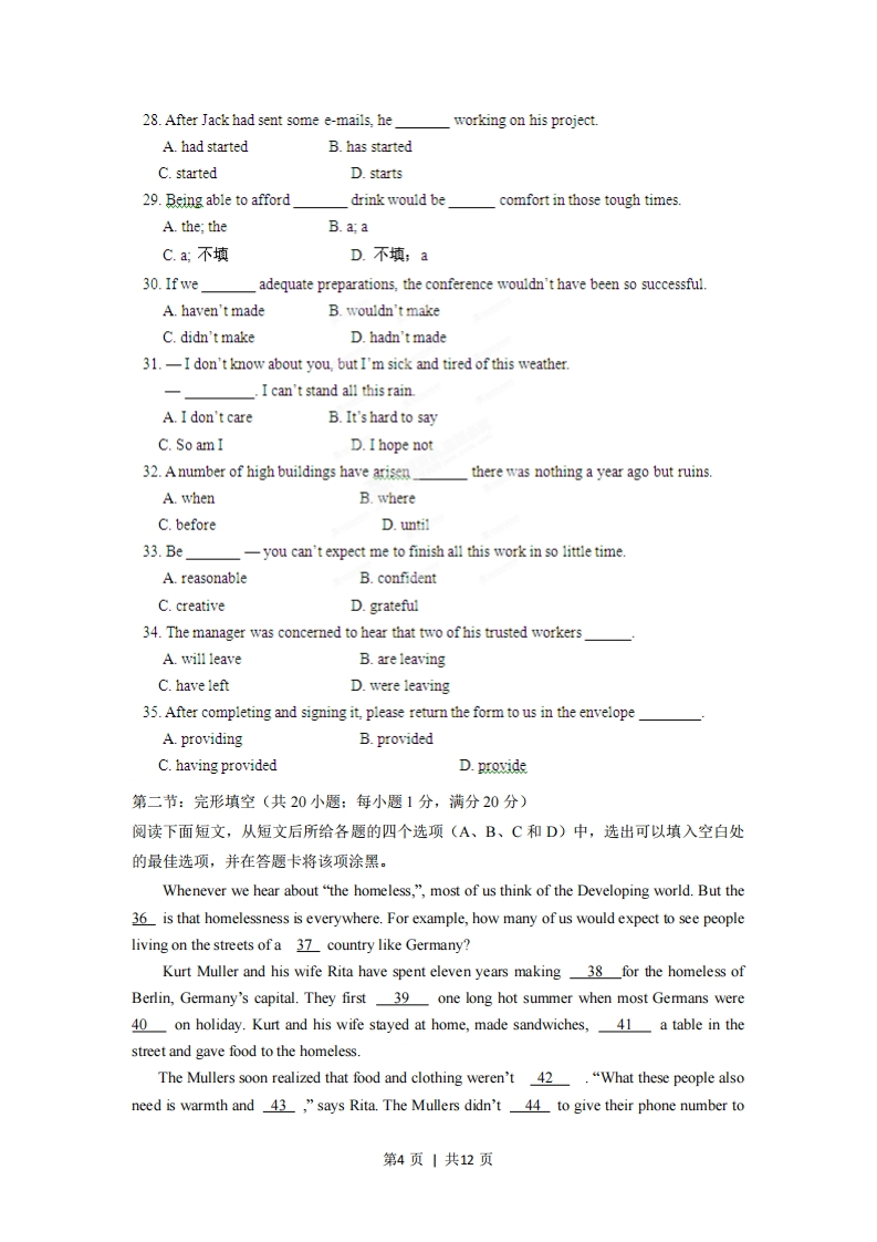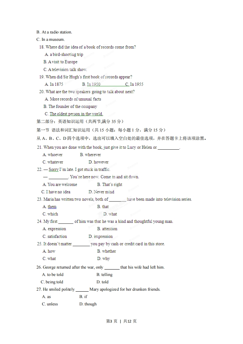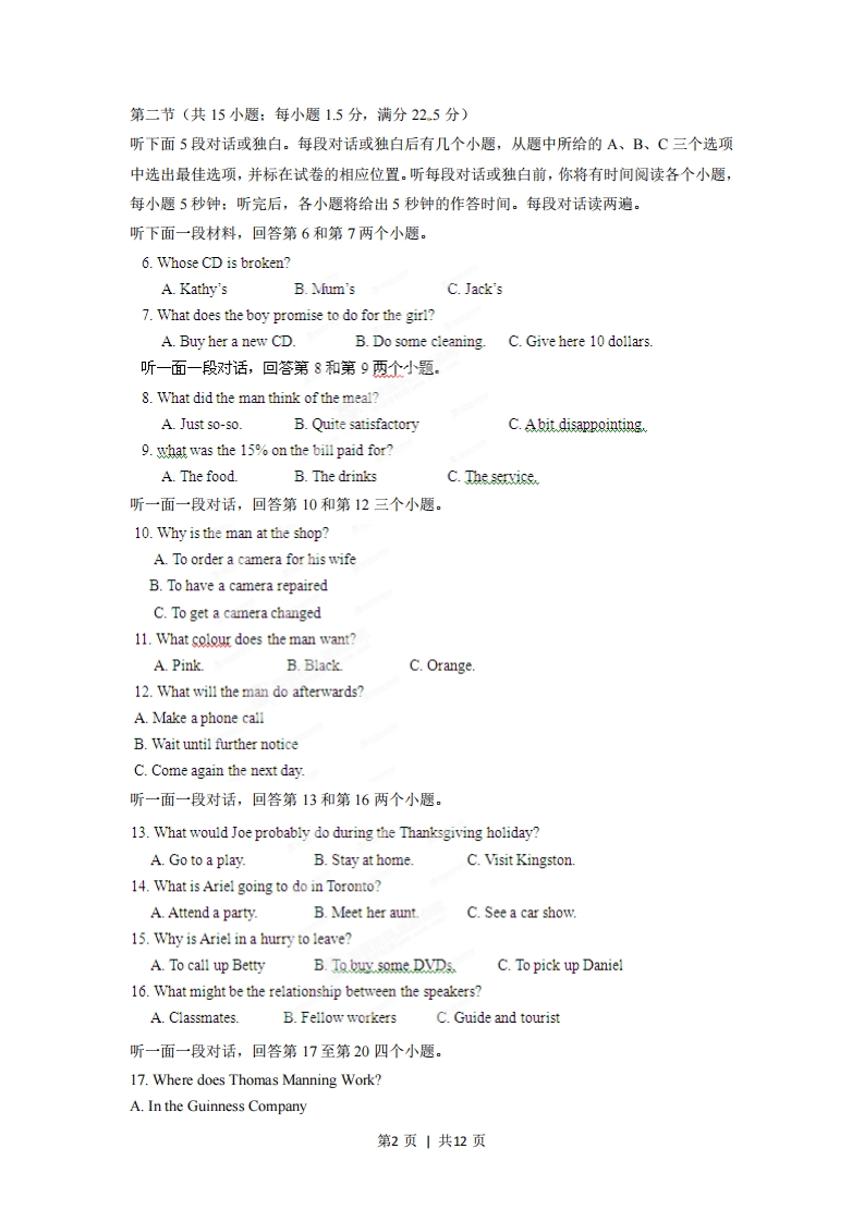 绝密★启用并使用完毕前2012年普通高等学校招生全国统一考试(山东卷)英语(学生版)本试卷分第I卷和第Ⅱ卷两部分,共12页,满分150分。考试用时120分钟。考试结束后,将本试卷和答题卡一并交回。注意事项:1.答题前,考生务必用0.5毫米黑色签字笔将自己的姓名、座号、考生号、县区和科类填写在答题卡和试卷规定的位置上。2.第I卷每小题选出答案后,用2B铅笔在答题卡上对应题目的答案标号涂黑,如需要改动,用橡皮擦干净后,再选涂其他答案标号。3.第Ⅱ卷必须用0.5毫米黑色签字笔作答,答案必须写在答题卡各题目指定区域内相应的位置,不能写在试卷上:如需改动,先划掉原来的答案然后再写上新的答案:不能使用涂改液、脐带纸、修正带。不按以上要求作答的答案无效。第I卷(共105分)第一部分:听力(共两节,满分30分)第一节(共5小题:每小题1.5分,满分7.5分)听下面5段对话。每段对话后有一个小题,从题中所给的A、B、C三个选项中选出最佳选项,并标在试卷的相应位置。听完每段对话后,你都有10秒钟的时间来回答有关小题和阅读下一小题。每段对话仅读一遍。例:How much is the shirt?A.£19.5B.£9.15C.£9.18答案是B。1.Where does this conversation probably take place?A.In a bookstore.B.In a classroom.C.In a library.2.At what time will the film begin?A.7:20B.7:15C.7:003.what are the two speakers mainly talking aobut?A.Their friend JaneB.Aweekend trip.C.Aradio programme.4.What will the woman probably do?A.Catch a trainB.See the man offGo shopping.5.why did the woman apologize?A.She made a late deliveryB.She went to the wrong placeC.She couldn'ttake the cake back第1页|共12页第二节(共15小题:每小题1.5分,满分225分)听下面5段对话或独白。每段对话或独白后有几个小题,从题中所给的A、B、C三个选项中选出最佳选项,并标在试卷的相应位置。听每段对话或独白前,你将有时间阅读各个小题,每小题5秒钟:听完后,各小题将给出5秒钟的作答时间。每段对话读两遍。听下面一段材料,回答第6和第7两个小题。6.Whose CD is broken?A.Kathy'sB.Mum'sC.Jack's7.What does the boy promise to do for the girl?A.Buy her a new CD.B.Do some cleaning.C Give here 10 dollars.听一面一段对话,回答第8和第9两个小题。8.What did the man think of the meal?A.Just so-so.B.Quite satisfactoryC.Abit disappointing.9.what was the 15%on the bill paid for?A.The food.B.The drinksC.The service听一面一段对话,回答第10和第12三个小题。10.Why is the man at the shop?A.To order a camera for his wifeB.To have a camera repairedC.To get a camera changed11.What colour does the man want?A.PinkB.BlackC.Orange.12.What will the man do afterwards?A.Make a phone callB.Wait until further noticeC.Come again the next day.听一面一段对话,回答第13和第16两个小题。13.What would Joe probably do during the Thanksgiving holiday?A.Go to a play.B.Stay at home.C.Visit Kingston.14.What is Ariel going to do in Toronto?A.Attend a party.B.Meet her auntC.See a car show.15.Why is Ariel in a hurry to leave?A.To call up BettyB.Tobuy some DVDs.C.To pick up Daniel16.What might be the relationship between the speakers?A.Classmates.B.Fellow workersC.Guide and tourist听一面一段对话,回答第17至第20四个小题。17.Where does Thomas Manning Work?A.In the Guinness Company第2页|共12页B.At a radio stationC.In a museum.18.Where did the idea of a book of records come from?A.a bird-shooting tripB.Avisit to EuropeC.A television talk show.19.When did Sir Hugh's first book of records appear?A.In1875B.In1950C.In 195520.What are the two speakers going to talk about next?A.More records of unusual factsB.The founder of the companyC.The oldest person in the world第二部分:英语知识运用(共两节,满分35分)第一节语法和词汇知识运用(共15小题:每小题1分,满分15分)从A、B、C、D四个选项中,选出可以填入空白处的最佳选项,并在答题卡上将该项涂黑。21.When you are done with the book,just give it to Lucy or Helen or.A.whoeverB.whereverC.whateverD.however22.-Sorry I'm late.I got stuck in traffic.You're here now.Come in and sit down.A.You are welcomeB.That's rightC.I have no ideaD.Never mind23.Maria