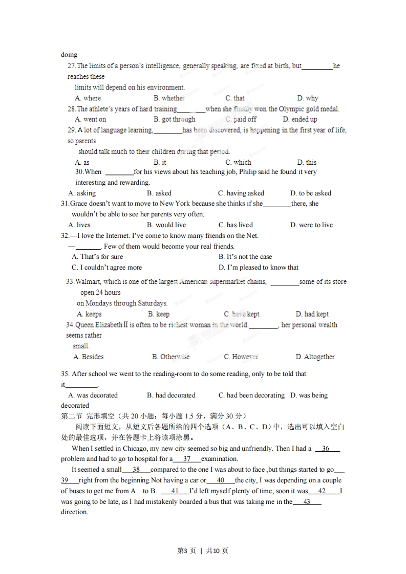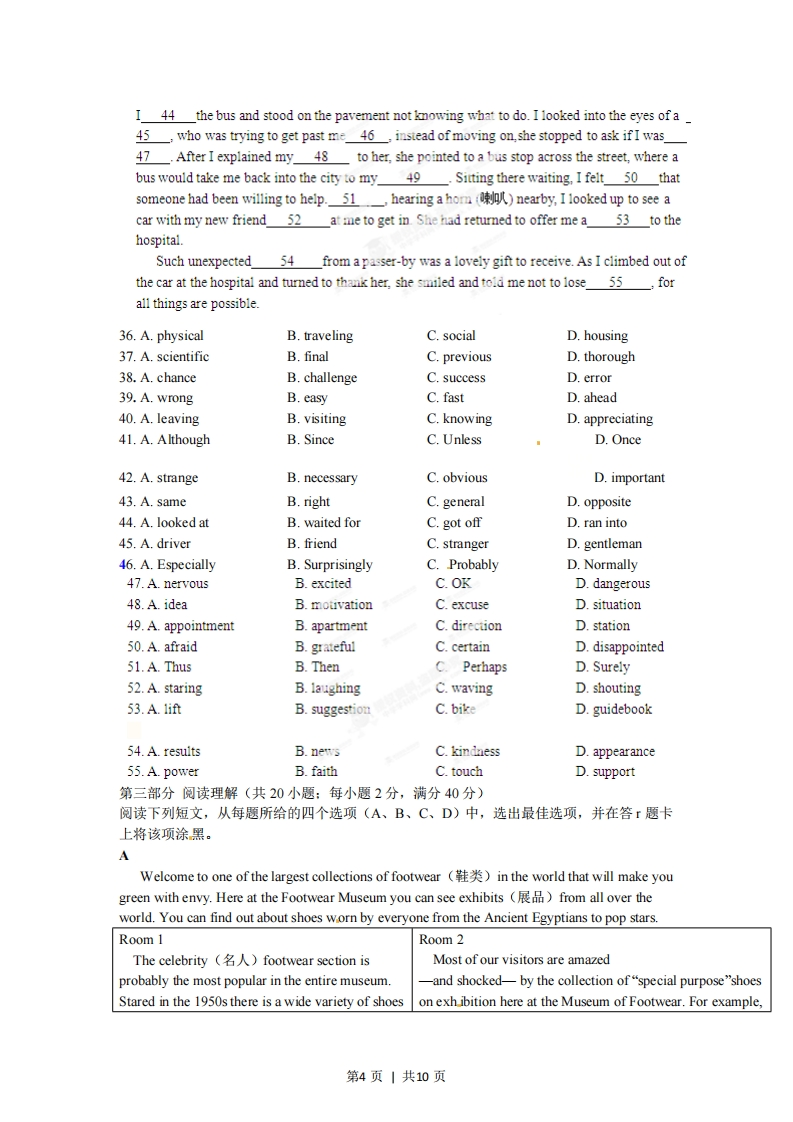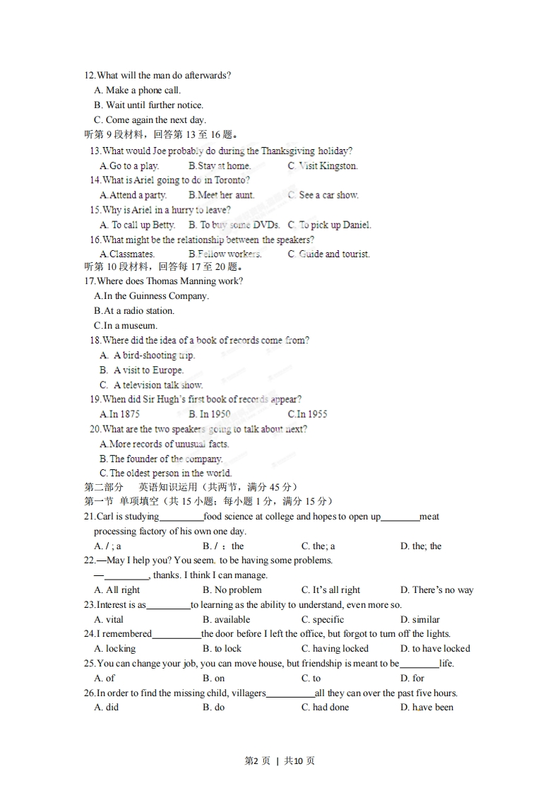 2012年普通高等学校招生全国统一考试英语(安徽卷)解析第I卷(选择题共50分)第一部分听力(共两节,满分30分)回答听力部分时,请先将答案标在试卷上。听力部分结束前,你将有两分钟的时间将您的答案转涂到客观答题卡上。第一节(共5小题:每小题1.5分,满分7.5分)听下面5段对话,每段对话后有一个小题,从题中所给的A、B、C三个选项选出最佳选项,并标在试卷的相应位置,听完每段对话后,你都有10秒钟的时间来回答有关小题和阅读下小题,每段对话仅读一遍。1.Where does this conversation probably take place?A.In a bookstore.B.In a classroomC.In a library2.At what time will the film begin?A.7:20B.7:15C.7:003.What are the two speakers mainly talking about?A.Their friend Jane.B.Aweekend tripC.Aradio programme4.What will the woman probably do?A.Catch a trainB.See血e man offC.Go shopping5.Why did the woman apologize?A.She made a late delivervB.She went to the wrong placeC.She couldn't take the cake back第二节(共15小题:每小题1.5分,满分22.5分)听下面5段对话。每段对话有几个小题,从题中所给的A、B、C三个选项中选出的最佳选项,并标在试卷的相应位置。听每段对话前,你将有时间阅读各个小题,每小题5秒钟听完后,各小题给出5秒钟的做答时间。每段对话读两遍。听第6段材料,回答第6、7题。6.Whose CD is broken?A.Kathy'sB.Mum'sC.Jack's7.What dose the boy promise to do for the girl?A.Buy her new CD.B.Do some cleaning.C.Give her 10 dollars.听第7段材料,回答第8、9题。8.What did the man think of the meal?A.Just so-so.B.Quite satisfactoryC.A bit disappointing.9.What was the 15%on the bill paid forA.The foodB.The drinksC.The service.听第8段材料,回答第10至12题.10.Why is the man at the shop?A.To order a camera for his wife.B.To have a camera repaired.C.To get camera changed.11.What colour does the man want?A.Pink.B.BlackC.Orange.第1页|共10页12.What will the man do afterwards?A.Make a phone call.B.Wait until further notice.C.Come again the next day听第9段材料,回答第13至16题。13.What would Joe probably do during the Thanksgiving holiday?A.Go to a play.B.Stay at homeC.Visit Kingston.14.What is Ariel going to do in Toronto?A.Attend a party.B.Meet her aunt.C.See a car show.15.Why is Ariel in a hurry to leave?A.To call up Betty.B.To buy some DVDs.C.To pick up Daniel.16.What might be the relationship between the speakers?A.Classmates.B.Fellow workers.C.Guide and tourist.听第10段材料,回答每17至20题。17.Where does Thomas Manning work?A.In the Guinness Company.B.At a radio station.C.In a museum.18.Where did the idea of a book of records come from?A.A bird-shooting trip.B.A visit to Europe.C.A television talk show.19.When did Sir Hugh's first book of records appear?A.In1875B.In1950C.n195520.What are the two speakers going to talk about next?A.More records of unusuai facts.B.The founder of the company.C.The oldest person in the world第二部分英语知识运用(共两节,满分45分)第一节单项填空(共15小题:每小题1分,满分15分)21.Carl is studying.food science at college and hopes to open up.meatprocessing factory of his own one day.A./;aB./:theC.the;aD.the;the22.-May I help you?You seem.to be having some problems.thanks.I think I can manage.A.All rightB.No problemC.It's all rightD.There's no way23.Interest is as.to learning as the ability to understand,even more so.A.vitalB.availableC.specificD.similar24.I rememberedthe door before I left the office,but forgot to tum off the lights.A.lockingB.to lockC.having lockedD.to have locked25.You can change your job,you can move house,but friendship is meant to be_life.A.ofB.onC.toD.for26.In order to find