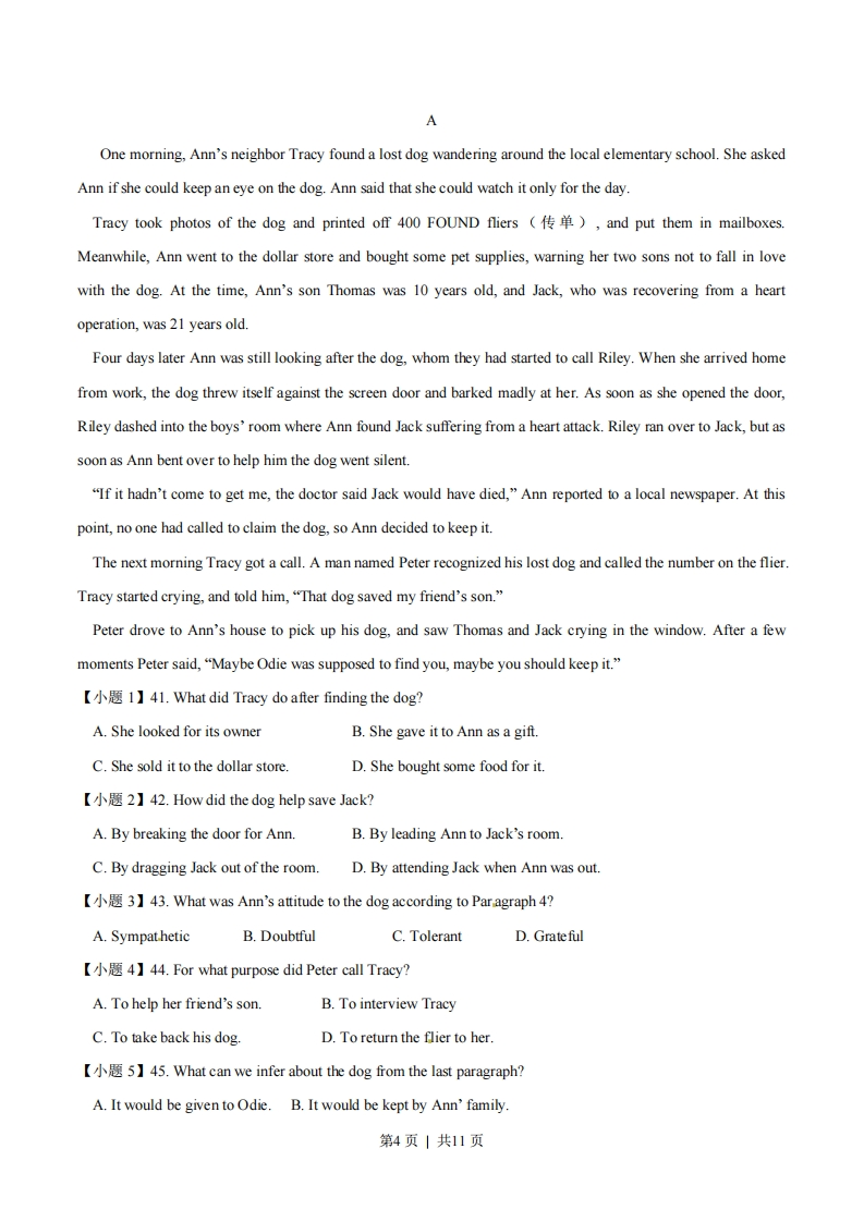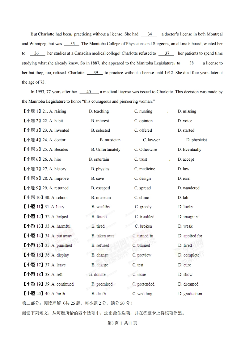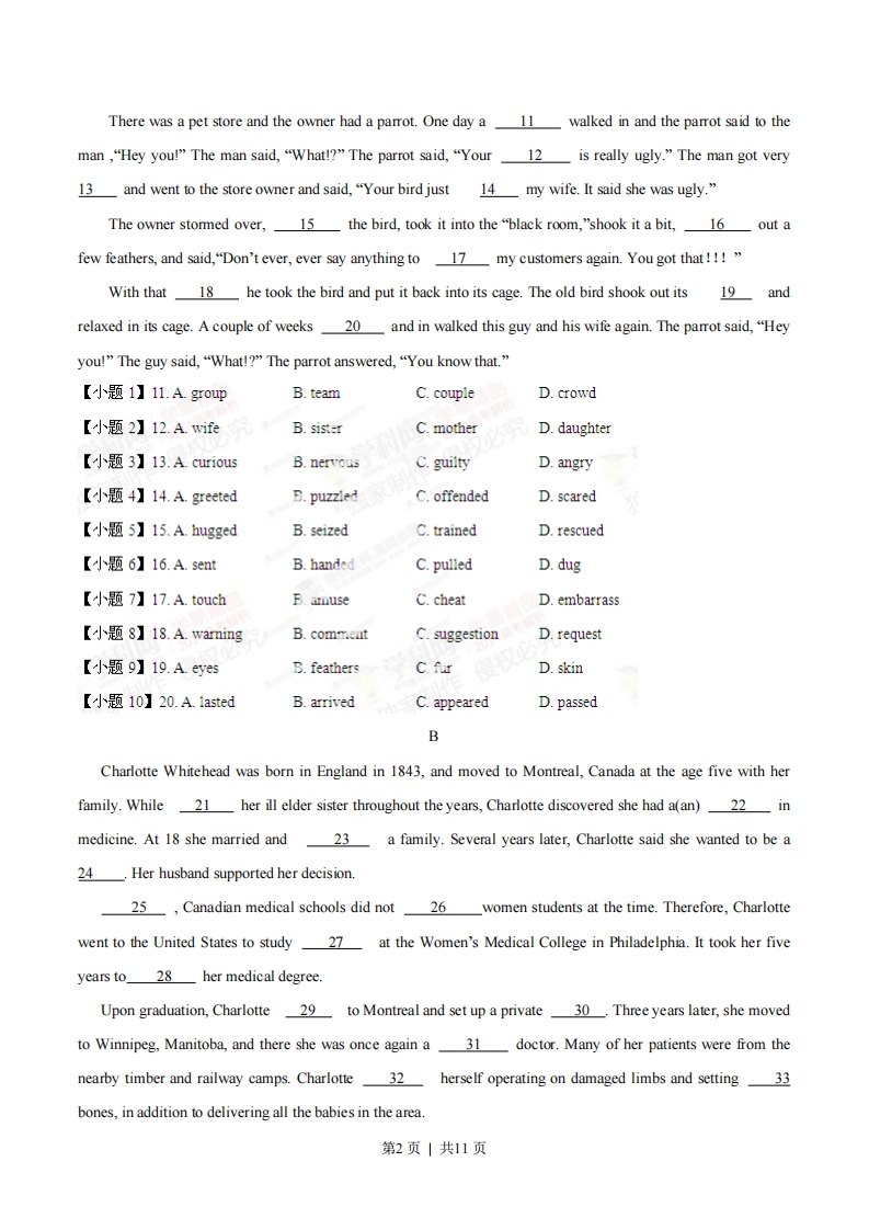 2014年普通高等学校招生全国统一考试(山东卷)】英语第一部分英语知识运用(共两节,满分55分)第一节单项选择(共10小题:每小题1.5分,满分15分)1.Writing out all the invitations by hand was more time-consuming than weA.will expect B.are expecting C.expect D.had expected2.I don't really like the author,I have to admit his books are very exciting.A.althoughB.unlessC.untilD.once3.-This apple pie is too sweet,don't you think so?-..I think it's just right,actually.A.Not reallyB.I hope soC.Sounds good D .No wonder4.Susan madeclear.to me that she wished to make a new life for herself.A.thatB.thisC.it D.her5.They made up their mind that theya new house once Larry changed jobs.A.bought B.would buy C.have bought D.had bought6.There is a note pinned to the door when the shop will open again.A.saying B.saysC.saidD.having said7.It is difficult for us to imagine life was like for slaves in the ancient world.A.where B.whatC.which D.why8.-Is Anne coming tomorrow?-.If she were to come,she would have called me.A.Go aheadB.CertainlyC.That's rightD.I don't think so9.It's standard practice for a company like this onea security officer.A.employed B.being employed C.to employ D.employs10.A company profits from home markets are declining may seek opportunities abroad.A.whichB.whose C.whoD.why第二节完型填空(共两篇:第一篇短文10小题,每小题1分:第二篇短文20小题,每小题1.5分:满分40分)A第1页|共11页There was a pet store and the owner had a parrot.One day a 11 walked in and the parrot said to theman,“Hey you!”The man said,.What!?”The parrot said,“Your_12_is really ugly.”The man got very13 and went to the store owner and said,"Your bird just 14 my wife.It said she was ugly."The owner stormed over,15 the bird,took it into the "black room,"shook it a bit,16 out afew feathers,and said,"Don't ever,ever say anything to 17 my customers again.You got that!!!"With that 18 he took the bird and put it back into its cage.The old bird shook out its19 andrelaxed in its cage.A couple of weeks 20 and in walked this guy and his wife again.The parrot said,"Heyyoul"The guy said,“What!?”The parrot answered,,“You know that.”【小题1】11.A.groupB.teamC.coupleD.crowd【小题2】12.A.wifeB.sisterC.motherD.daughter【小题3】13.A.curiousB.nervousC.guiltyD.angry【小题4】14.A.greetedB.puzzledC.offendedD.scared【小题5】15.A.huggedB.seizedC.trainedD.rescued【小题6】16.A.sentB.handedC.pulledD.dug【小题7】17.A.touchB.amuseC.cheatD.embarrass【小题8】18.A.warningB.commeatC.suggestionD.request【小题9】19.A.eyesB.feathersC.furD.skin【小题10】20.A1 astedB.arrivedC.appearedD.passedBCharlotte Whitehead was born in England in 1843,and moved to Montreal,Canada at the age five with herfamily.While 21 her ill elder sister throughout the years,Charlotte discovered she had a(an)22 inmedicine.At 18 she married and 23 a family.Several years later,Charlotte said she wanted to be a24.Her husband supported her decision.25,Canadian medical schools did not 26 women students at the time.Therefore,Charlottewent to the United States to study 27 at the Women's Medical College in Philadelphia.It took her fiveyears to28 her medical degree.Upon graduation,Charlotte 29 to Montreal and se