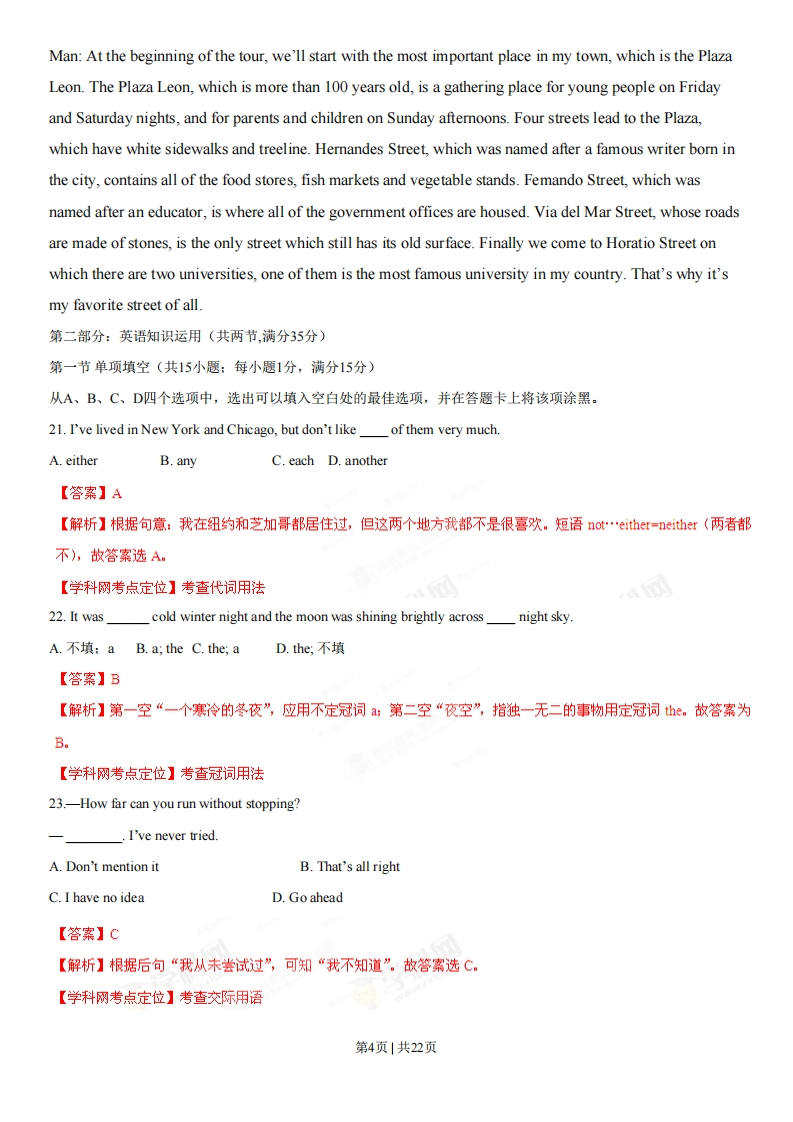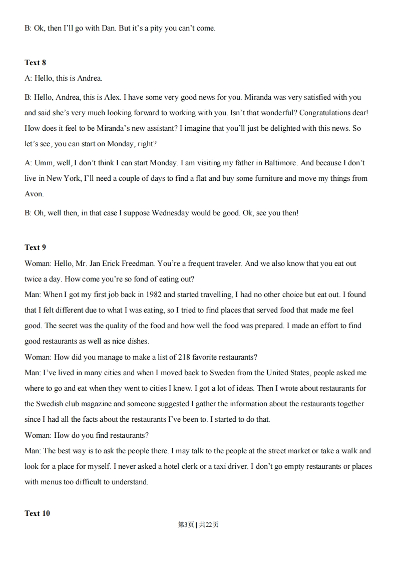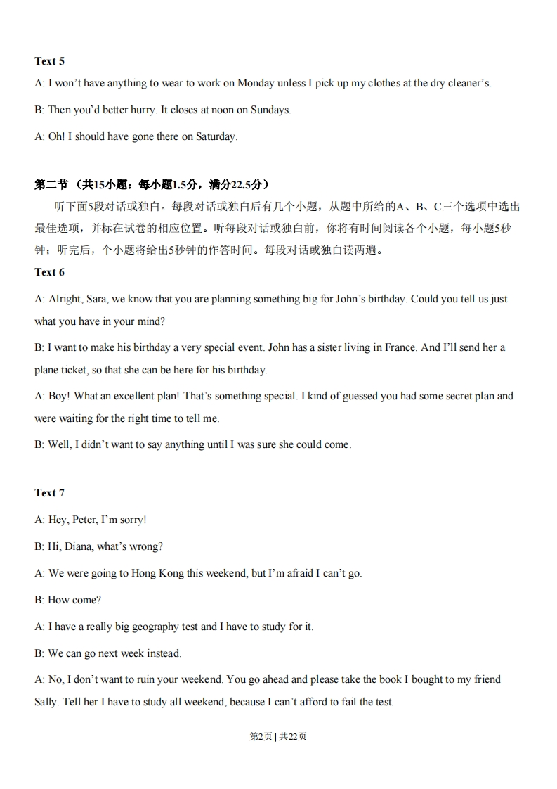 2013年高考山东英语解析(精编版)英语第一部分听力试题答案及原文【参考答案】1-5 ACACB6-10 BBABA11-15 BACAA16-20 BCBCC听力原文:第一节(共5小题,每小题1.5分,满分7.5分)听下面5段对话。每段对话后有一个小题,从题中所给的A、B、C三个选项中选出最佳答案。听完每段对话后,你都有10秒钟的时间来回答有关小题和阅读下一小题。每段对话仅读一遍。Text 1Man:I've got my camera with me.Am I allowed to take photos here?Woman:I think so.It doesn't say you can't.Text 2A:I really like living here in this flat,because it's so near the center of town.B:That's true.But it gets really noisy at night.Text 3A:Hi,Maggie.I'm coming,but it's snowing and the traffic is moving slowly.B:Ok,David.Take your time.We'll wait for you,so we can have dinner together.Text 4A:Celia,you see those girls over there?They need another player for a basketball game.Would you like tojoin them?B:Seems like it's a game for fun.Sure,I'll be there in a minute.第1页1共22页Text 5A:I won't have anything to wear to work on Monday unless I pick up my clothes at the dry cleaner's.B:Then you'd better hurry.It closes at noon on Sundays.A:Oh!I should have gone there on Saturday.第二节(共15小题:每小题1.5分,满分22.5分)听下面5段对话或独白。每段对话或独白后有几个小题,从题中所给的A、B、C三个选项中选出最佳选项,并标在试卷的相应位置。听每段对话或独白前,你将有时间阅读各个小题,每小题5秒钟:听完后,个小题将给出5秒钟的作答时间。每段对话或独白读两遍。Text 6A:Alright,Sara,we know that you are planning something big for John's birthday.Could you tell us justwhat you have in your mind?B:I want to make his birthday a very special event.John has a sister living in France.And I'll send her aplane ticket,so that she can be here for his birthday.A:Boy!What an excellent plan!That's something special.I kind of guessed you had some secret plan andwere waiting for the right time to tell me.B:Well,I didn't want to say anything until I was sure she could come.Text 7A:Hey,Peter,I'm sorry!B:Hi,Diana,what's wrong?A:We were going to Hong Kong this weekend,but I'm afraid I can't go.B:How come?A:I have a really big geography test and I have to study for it.B:We can go next week instead.A:No,I don't want to ruin your weekend.You go ahead and please take the book I bought to my friendSally.Tell her I have to study all weekend,because I can't afford to fail the test.第2页1共22页B:Ok,then I'll go with Dan.But it's a pity you can't come.Text 8A:Hello,this is Andrea.B:Hello,Andrea,this is Alex.I have some very good news for you.Miranda was very satisfied with youand said she's very much looking forward to working with you.Isn't that wonderful?Congratulations dear!How does it feel to be Miranda's new assistant?I imagine that you'll just be delighted with this news.Solet's see,you can start on Monday,right?A:Umm,well,I don't think I can start Monday.I am visiting my father in Baltimore.And because I don'tlive in New York,I'll need a couple of days to find a flat and buy some furniture and move my things fromAvon.B:Oh,well then,in that case I suppose Wednesday would be good.Ok,see you then!Text 9Woman:Hello,Mr.Jan Erick Freedman.You're a frequent traveler.And we also know that you eat outtwice a day.How come you're so fond of eating out?Man:When I got my first job back in 1982 and started travelling,I had no other