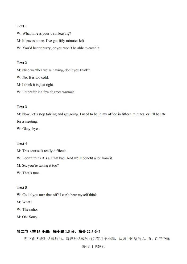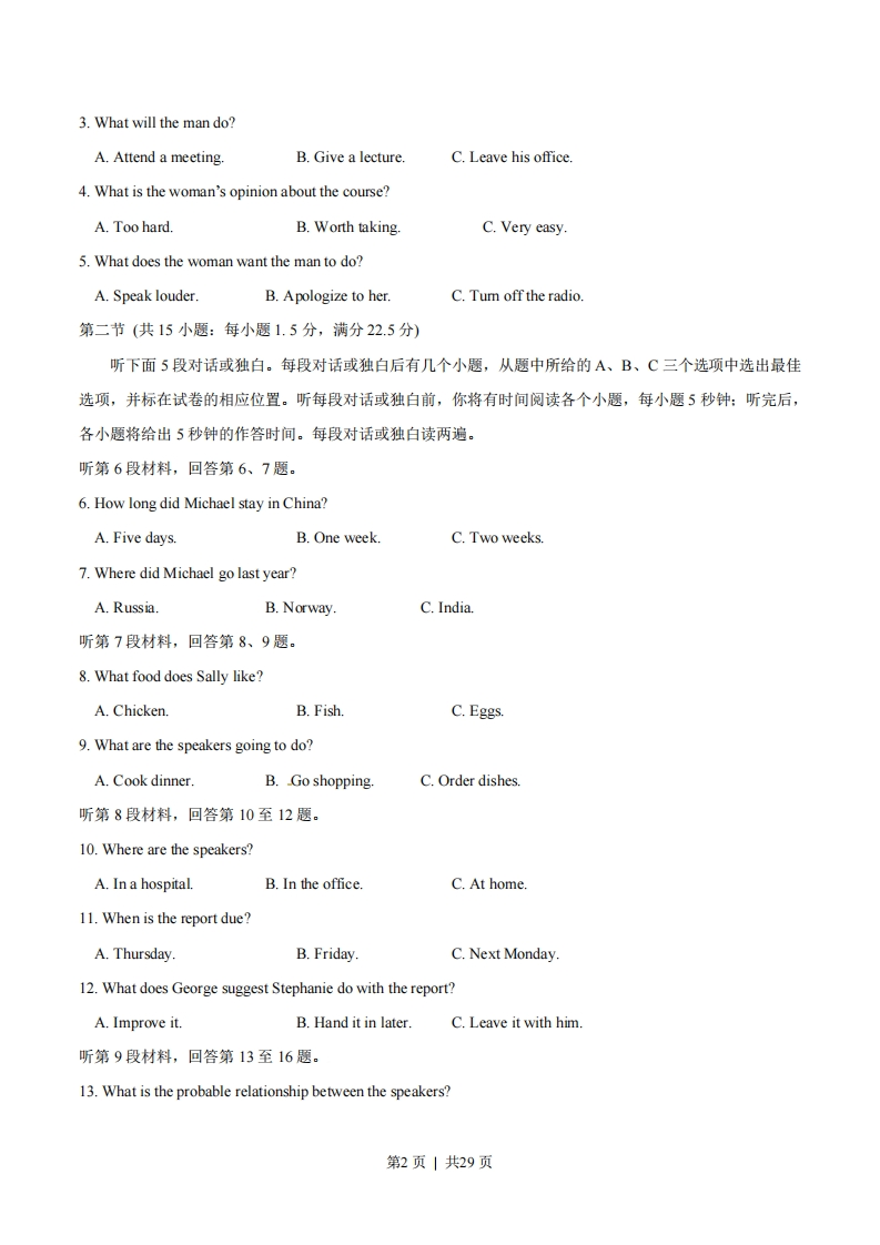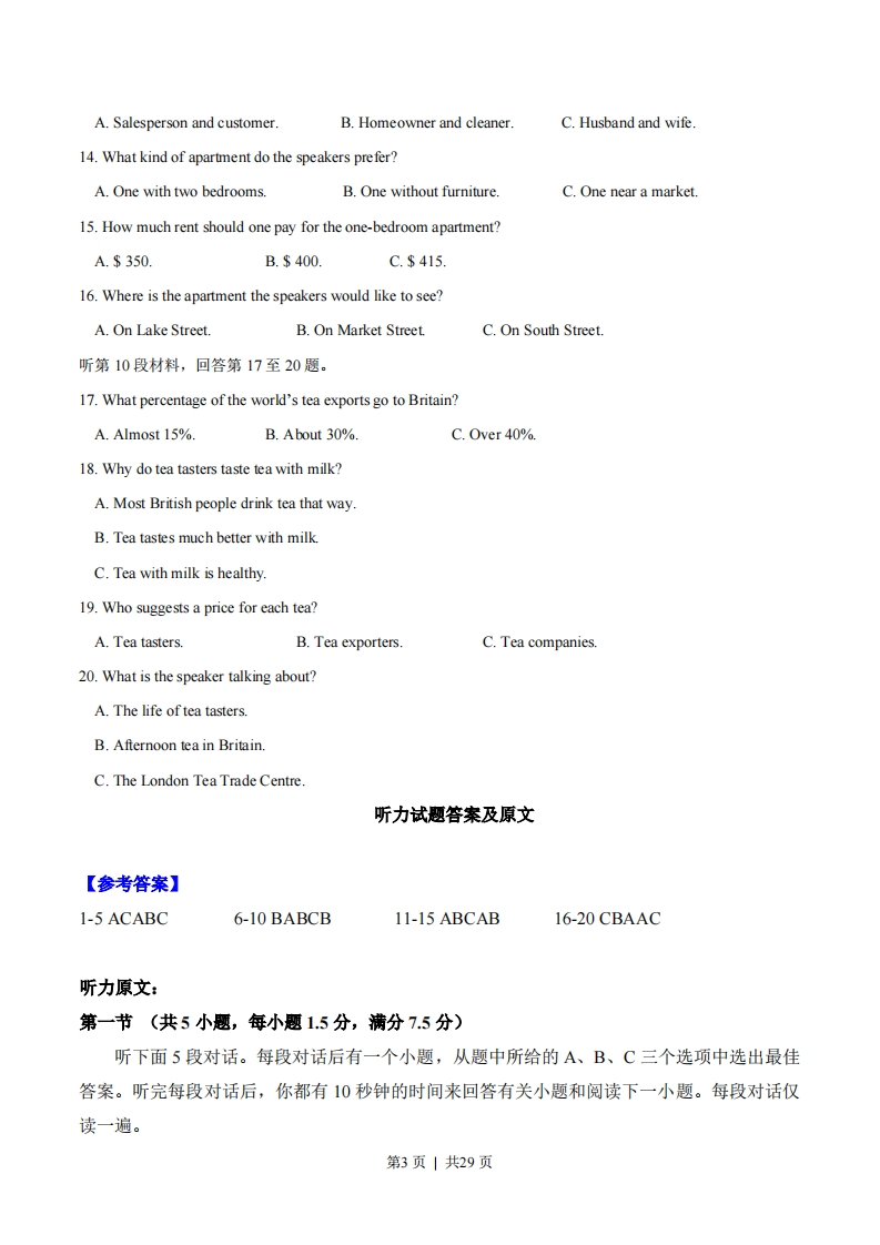 绝密★启用前2015年普通高等学校招生全国统一考试(安徽卷)英语本试卷分第I卷(选择题)和第Ⅱ卷(非选择题)两部分。全卷满分150分,考试时间120分钟。考生注意事项:1.答题前,务必在试题卷、答题卡规定的地方填写自己的姓名、座位号,并认真核对答题卡上所粘贴的条形码中姓名、座位号与本人姓名、座位号是否一致。务必在答题卡背面规定的地方填写姓名和座位号后两位。2.答第I卷时,每小题选出答案后,用2B铅笔把答题卡上对应题目的答案标号涂黑。如需改动,用橡皮擦干净后,再选涂其他答案标号。3.答第Ⅱ卷时,必须使用0.5毫米的黑色墨水签字笔在答题卡上书写,要求字体工整、笔迹清晰。作图题可先用铅笔在答题卡规定的位置绘出,确认后再用0.5毫米的黑色墨水签字笔描清楚。必须在题号所指示的答题区域作答,超出答题区域书写的答案无效,在试题卷、草稿纸上答题无效。4.考试结束,务必将试题卷和答题卡一并上交。第I卷第一部分听力(共两节,满分30分)做题时,先将答案标在试卷上。录音内容结束后,你将有两分钟的时间将试卷上的答案转涂到答题卡上。第一节(共5小题:每小题1.5分,满分7.5分)听下面5段对话。每段对话后有一个小题,从题中所给的A、B、C三个选项中选出最佳选项,并标在试卷的相应位置。听完每段对话后,你都有10秒钟的时间来回答有关小题和阅读下一小题。每段对话仅读一遍。例:How much is the shirt?A.£19.15.B.£9.18.C.£9.15.答案是C。l.What time is it now?A.9:10.B.9:50C.10:00.2.What does the woman think of the weather?A.It's nice.B.It's warm.C.It's cold.第1页|共29页3.What will the man do?A.Attend a meeting.B.Give a lecture.C.Leave his office.4.What is the woman's opinion about the course?A.Too hard.B.Worth taking.C.Very easy.5.What does the woman want the man to do?A.Speak louder.B.Apologize to her.C.Tum off the radio.第二节(共15小题:每小题1.5分,满分22.5分)听下面5段对话或独白。每段对话或独白后有几个小题,从题中所给的A、B、C三个选项中选出最佳选项,并标在试卷的相应位置。听每段对话或独白前,你将有时间阅读各个小题,每小题5秒钟:听完后,各小题将给出5秒钟的作答时间。每段对话或独白读两遍。听第6段材料,回答第6、7题。6.How long did Michael stay in China?A.Five days.B.One week.C.Two weeks.7.Where did Michael go last year?A.Russia.B.NorwayC.India.听第7段材料,回答第8、9题。8.What food does Sally like?A.Chicken.B.Fish.C.Eggs.9.What are the speakers going to do?A.Cook dinner.B.Go shopping.C.Order dishes.听第8段材料,回答第10至12题。10.Where are the speakers?A.In a hospital.B.In the office.C.At home.11.When is the report due?A.Thursday.B.Friday.C.Next Monday12.What does George suggest Stephanie do with the report?A.Improve it.B.Hand it in later.C.Leave it with him.听第9段材料,回答第13至16题。13.What is the probable relationship between the speakers?第2页|共29页A.Salesperson and customer.B.Homeowner and cleaner.C.Husband and wife14.What kind of apartment do the speakers prefer?A.One with two bedrooms.B.One without furnitureC.One near a market.15.How much rent should one pay for the one-bedroom apartment?A.$350B.$400C.$415.16.Where is the apartment the speakers would like to see?A.On Lake Street.B.On Market Street.C.On South Street.听第10段材料,回答第17至20题。17.What percentage of the world's tea exports go to Britain?A.Almost 15%.B.About 30%.C.0ver40%.18.Why do tea tasters taste tea with milk?A.Most British people drink tea that way.B.Tea tastes much better with milk.C.Tea with milk is healthy.19.Who suggests a price for each tea?A.Tea tasters.B.Tea exporters.C.Tea companies.20.What is the speaker talking about?A.The life of tea tasters.B.Afternoon tea in Britain.C.The London Tea Trade Centre.听力试题答案及原文【参考答案】1-5 ACABC6-10 BABCB11-15 ABCAB16-20 CBAAC听力原文:第一节(共5小题,每小题1.5分,满分7.5分)听下面5段对话。每段对话后有一个小题,从题中所给的A、B、C三个选项中选出最佳答案。听完每段对话后,你都有10秒钟的时间来回答有关小题和阅读下一小题。每段对话仅读一遍。第3页|共29页