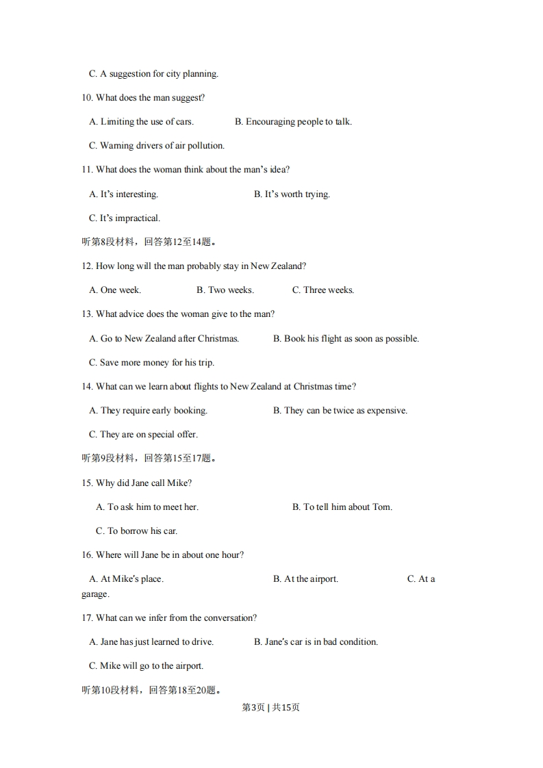 2008年普通高等学校招生全国统一考试(宁夏、海南卷)英语本试卷分第一卷(选择题)和第二卷(非选择题)两部分。考生作答时,将答案答在答题卡上,在本试卷上答题无效。考试结束后,将本试卷和答题卡一并交回。第一卷注意事项:1.答题前,考生务必先将自己的姓名、准考证号填写在答题卡上,认真核对条形码上的姓名、准考证号,并将条形码粘贴在答题卡的指定位置上。2.选择题答案使用范围B铅笔填涂,如需改动,用橡皮擦干净后,再选涂其它答案标号:非选择题答案使用0.5毫米的黑色中性(签字)笔或碳素笔书写,字体工整、笔迹清楚。3.请按照题号在各题的答题区域(黑色线框)内作答,超出答题区域书写的答案无效。4.保持卡面清洁,不折叠,不破损。第一部分听力(共两节,满分30分)做题时,请先将答案标在试卷上。听力部分结束前,你将有两分钟的时间将试卷上的答案转涂到答题卡。第一节(共5小题:每小题1.5分,满分7.5分)听下面5段对话。每段对话后有一个小题,从题中所给的A、B、C三个选项中选出最佳选项,并标在试卷的相应位置。听完每段对话后,你都有10秒钟的时间来回答有关小题和阅读下一小题。每段对话仅读一遍。例:How much is the shirt?A.£19.15.B.£9.15.C.£9.18.答案是B。1.What is the weather like?A.It's raining.B.It's cloudyC.It's sunny第1页1共15页2.Who will go to China next month?A.Lucy.B.Alice.C.Richard.3.What are the speakers talking about?A.The man's sister.B.A film.C.An actor.4.Where will the speakers meet?A.In Room 340.B.In Room 314.C.In Room 223.5.Where does the conversation most probably take place?A.In a restaurant.B.In an officeC.At home.第二节(共15小题:每小题1分,满分22.5分)听下面5段对话或独白。每段对话或独白后有几个小题,从题中所给的A、B、C三个选项中选出最佳选项,并标在试卷的相应位置。听完每段对话或独白前后,你将有时间阅读各个小题,每小题5秒钟:听完后,各小题将给出5秒钟的作答时间。每段对话或独白读两遍。听第6段材料,回答第6至8题。6.Why did the woman go to New York?A.To spend some time with the baby.B.To look after her sister.C.To find a new job.7.How old was the baby when the woman left New York?A.Two months.B.Five months.C.Seven months.8.What did the woman like doing most with the baby?A.Holding him.B.Playing with him.C.Feeding him.听第7段材料,回答第9至11题。9.What are the speakers talking about?A.A way to improve air quality.B.A problem with traffic rules.第2页1共15页C.A suggestion for city planning.10.What does the man suggest?A.Limiting the use of cars.B.Encouraging people to talk.C.Waming drivers of air pollution.11.What does the woman think about the man's idea?A.It's interesting.B.It's worth trying.C.It's impractical.听第8段材料,回答第12至14题。12.How long will the man probably stay in New Zealand?A.One week.B.Two weeksC.Three weeks.13.What advice does the woman give to the man?A.Go to New Zealand after Christmas.B.Book his flight as soon as possible.C.Save more money for his trip.14.What can we learn about flights to New Zealand at Christmas time?A.They require early booking.B.They can be twice as expensive.C.They are on special offer.听第9段材料,回答第15至17题。15.Why did Jane call Mike?A.To ask him to meet her.B.To tell him about Tom.C.To borrow his car.16.Where will Jane be in about one hour?A.At Mike's place.B.At the airport.C.Atagarage.17.What can we infer from the conversation?A.Jane has just learned to drive.B.Jane's car is in bad condition.C.Mike will go to the airport.听第10段材料,回答第18至20题。第3页1共15页