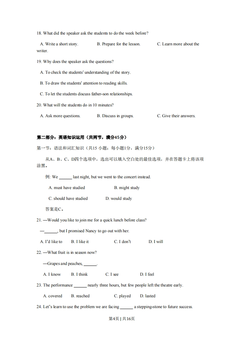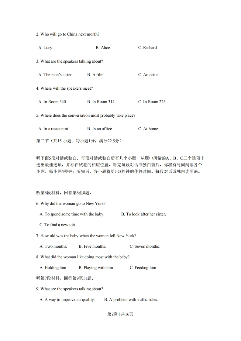 2008年普通高等学校招生全国统一考试(宁夏、海南卷)英语本试卷分第一卷(选择题)和第二卷(非选择题)两部分。考生作答时,将答案答在答题卡上,在本试卷上答题无效。考试结束后,将本试卷和答题卡一并交回。第一卷注意事项:1.答题前,考生务必先将自己的姓名、准考证号填写在答题卡上,认真核对条形码上的姓名、准考证号,并将条形码粘贴在答题卡的指定位置上。2.选择题答案使用范围B铅笔填涂,如需改动,用橡皮擦干净后,再选涂其它答案标号:非选择题答案使用0.5毫米的黑色中性(签字)笔或碳素笔书写,字体工整、笔迹清楚。3.请按照题号在各题的答题区域(黑色线框)内作答,超出答题区域书写的答案无效。4.保持卡面清洁,不折叠,不破损。第一部分听力(共两节,满分30分)做题时,请先将答案标在试卷上。听力部分结束前,你将有两分钟的时间将试卷上的答案转涂到答题卡。第一节(共5小题:每小题1.5分,满分7.5分)听下面5段对话。每段对话后有一个小题,从题中所给的A、B、C三个选项中选出最佳选项,并标在试卷的相应位置。听完每段对话后,你都有10秒钟的时间来回答有关小题和阅读下一小题。每段对话仅读一遍。例:How much is the shirt?A.£19.15.B.£9.15.C.£9.18.答案是B。1.What is the weather like?A.It's raining.B.It's cloudyC.It's sunny第1页1共16页2.Who will go to China next month?A.Lucy.B.Alice.C.Richard.3.What are the speakers talking about?A.The man's sister.B.A film.C.An actor.4.Where will the speakers meet?A.In Room 340.B.In Room 314.C.In Room 223.5.Where does the conversation most probably take place?A.In a restaurant.B.In an officeC.At home.第二节(共15小题:每小题1分,满分22.5分)听下面5段对话或独白。每段对话或独白后有几个小题,从题中所给的A、B、C三个选项中选出最佳选项,并标在试卷的相应位置。听完每段对话或独白前后,你将有时间阅读各个小题,每小题5秒钟:听完后,各小题将给出5秒钟的作答时间。每段对话或独白读两遍。听第6段材料,回答第6至8题。6.Why did the woman go to New York?A.To spend some time with the baby.B.To look after her sister.C.To find a new job.7.How old was the baby when the woman left New York?A.Two months.B.Five months.C.Seven months.8.What did the woman like doing most with the baby?A.Holding him.B.Playing with him.C.Feeding him.听第7段材料,回答第9至11题。9.What are the speakers talking about?A.A way to improve air quality.B.A problem with traffic rules.第2页1共16页C.A suggestion for city planning.10.What does the man suggest?A.Limiting the use of cars.B.Encouraging people to talk.C.Waming drivers of air pollution.11.What does the woman think about the man's idea?A.It's interesting.B.It's worth trying.C.It's impractical.听第8段材料,回答第12至14题。12.How long will the man probably stay in New Zealand?A.One week.B.Two weeksC.Three weeks.13.What advice does the woman give to the man?A.Go to New Zealand after Christmas.B.Book his flight as soon as possible.C.Save more money for his trip.14.What can we learn about flights to New Zealand at Christmas time?A.They require early booking.B.They can be twice as expensive.C.They are on special offer.听第9段材料,回答第15至17题。15.Why did Jane call Mike?A.To ask him to meet her.B.To tell him about Tom.C.To borrow his car.16.Where will Jane be in about one hour?A.At Mike's place.B.At the airport.C.Atagarage.17.What can we infer from the conversation?A.Jane has just learned to drive.B.Jane's car is in bad condition.C.Mike will go to the airport.听第10段材料,回答第18至20题。第3页1共16页