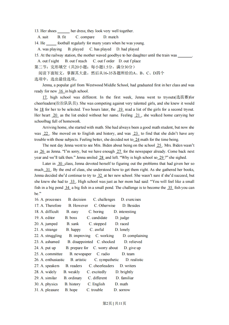 2008年普通高等学校招生全国统一考试(天津卷)英语本试卷分第I卷(选择题)、第II卷(非选择题)和第III卷(选择题)三部分,共150分,考试用时120分钟。第I卷1至10页,第II卷11至12页,第III卷13至16页,考生务必将答案写在答题卡上,答在试卷上的无效。考试结束后,将本试卷和答题卡一并交回。祝各位考生考试顺利!第I卷第一部分:英语知识运用(共两节,满分45分)第一节:单项填空(共15小题:每小题1分,满分15分)从A、B、C、D四个选项中,选出可以填入空白处的最佳选项。Stand over there you'll be able to see it before.A.orB.andC.but D.while答案是B。1.We'll have a picnic in the park this Sunday it rains or it's very cold.A.since B.if C.unless D.until2.My brother is really.He often works in his office far into the night.A.open-minded B.hard-working C.self-confident D.warm-hearted3.----I just can't stop worrying about the result of the job interview.---There's nothing you can do now but wait.A.Relax B.Go ahead C.Go for it D.Good luck4.their hats into the air,the fans of the winning team let out loud shouts of victory.A.To throw B.Thrown C.Throwing D.Being thrown5.To know more about the British Museum,you can use the Internet to go to the library,orA.neitherB.some C.all D.both6.She have left school,for her bike is still here.A.can't B.wouldn't C.shouldn't D.needn't7.The meal over,the managers went back to the meeting room to their discussion.A.put away B.take down C.look over D.carry on8.It was along the Mississippi River Mark Twain spent much of his childhood.A.how B.which C.that D.where9.---How much do I owe you for lunch?---.It's nothing.A.You're welcome B.Forget it C.With pleasure D.That's right10.Many Chinese universities provided scholarships for students financial aid.A.in favour of B.in honour of C.in face of D.in need of11.Most air pollution is caused by the burning of like coal,gas and oil.A.fuels B.articles C.goods D.products12.The last time we had great fun was we were visiting the Water Park.A.where B.how C.when D.why第1页共11页13.Her shoes her dress;they look very well together.A.suit B.fit C.compare D.match14.He football regularly for many years when he was young.A.was playing B.played C.has played D.had played15.At the railway station,the mother waved goodbye to her daughter until the train wasA.out fsight B.out f reach C.out f order D.out fplace第二节:完形填空(共20小题:每小题1.5分,满分30分)阅读下面短文,掌握其大意,然后从16-35各题所给的A、B、C、D四个选项中,选出最佳选项。Jenna,a popular girl from Westwood Middle School,had graduated first in her class and wasready for new 16 in high school.17,high school was different.In the first week,Jenna went to tryouts()forcheerleaders(拉s拉队队员).She was competing against very talented girls,and she knew it wouldbe 18 for her to be selected.Two hours later,the 19 read a list of the girls for a second tryout.Her heart 20 as the list ended without her name.Feeling 21,she walked home carrying herschoolbag full of homework.Arriving home,she started with math.She had always been a good math student,but now shewas 22.She moved on to English and history,and was 23 to find that she didn't have anytrouble with those subjects.Feeling better,she decided not to_24 math for the time being.The nest day Jenna went to see Mrs.Biden about being on the school 25.Mrs.Biden wasn'tas 26 as Jenna."I'm sorr