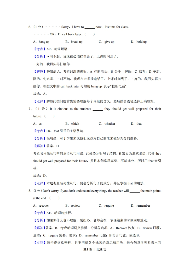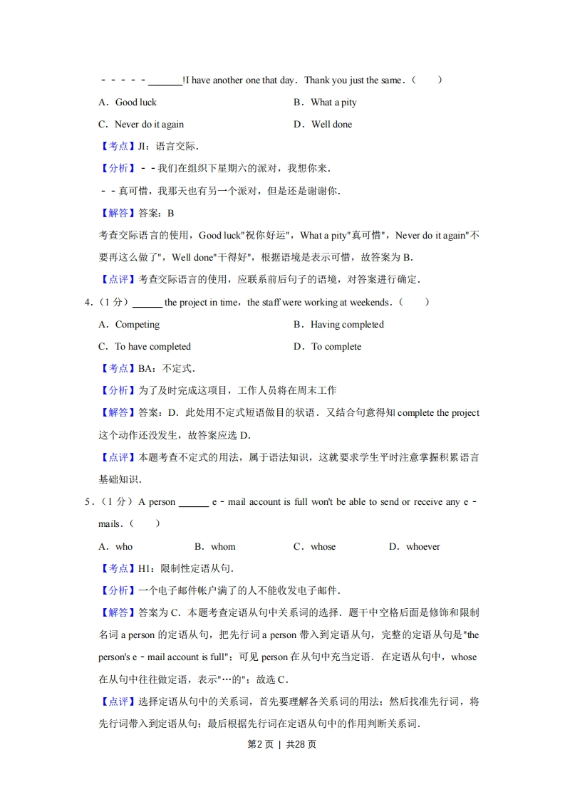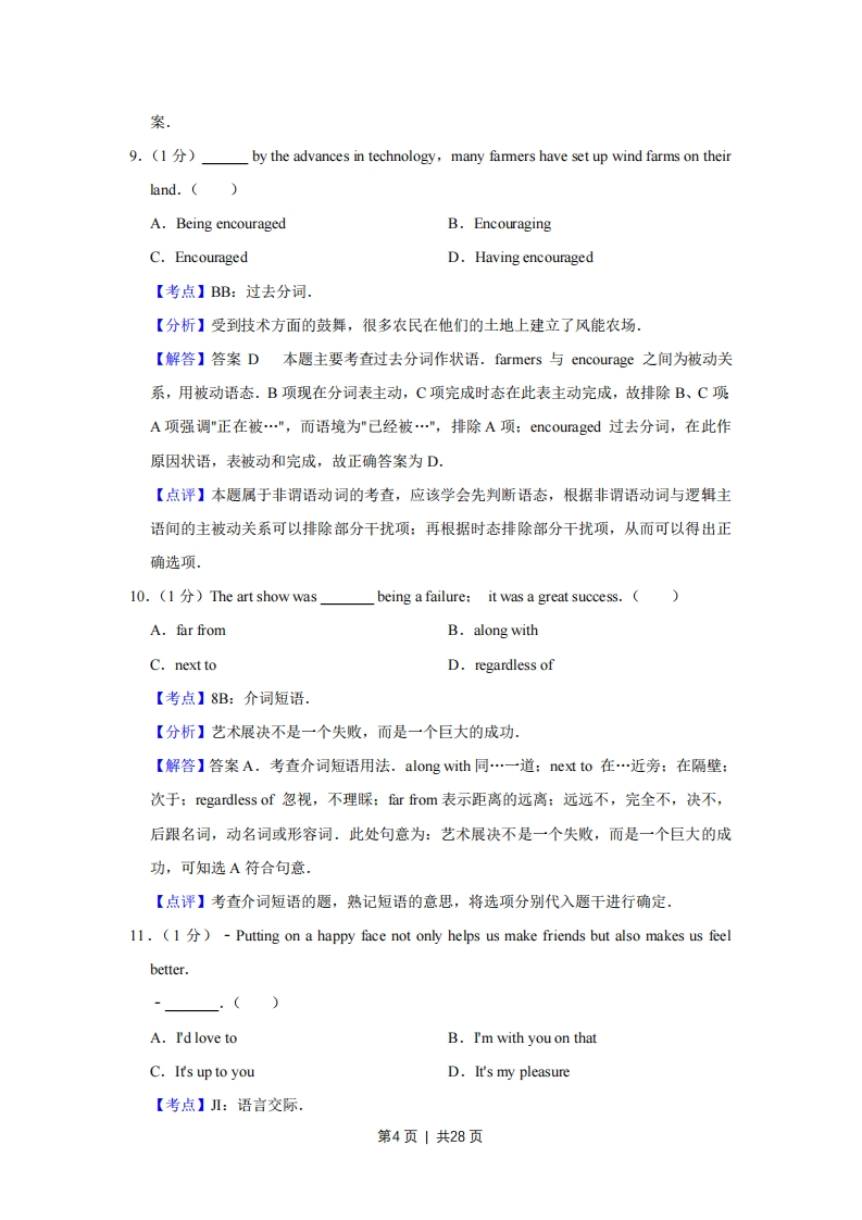 2009年天津市高考英语试卷解析版◆考答案与试题解析第1卷第一部分:英语知识运用(共两节,满分15分)第一节:单项填空(共15小愿:每小题1分,满分15分)从A、B、C、D四个选项中,选出可以填入空白处的最佳选项。例Stand over there you'll be able to see it better.A.or B.and C.but D.whileB。1.(1)I'm trying to break theof getting up too late.A.traditionB.convenienceC.habitD.leisure【考点】35:名词的词义辨析【分析】我正在努力改掉晚起的习惯.【解答】答案:C解析:A:传统:B:便利:C:习惯:D:娱乐.根据句意"我正在努力改掉晚起的习惯"及所给选项分析可知本题答案为C选项,其余选项均不符合题意.【点评】本题考查名词的辨析,做此类题目时一定要清楚各个选项的含义再结合句意选出最佳答案,2.(1分)My parentsin Hong Kong.They were born there and have lived nowhereelse.()A.liveB.livedC.were livingD.had lived【考点】E1:一般现在时.【分析】我的父母住在香港.他们在那里出生而且从未在别的地方生活过,【解答】答案A.根据句子提示"They were born there and have lived nowhere else",我父母亲从来没有再别的地方生活过.因此他们现在仍然住在香港,表示现在的状态,应该用一般现在时,其它答案都是过去的时态,不符合题意,故选A.【点评】本题考查时态辨析.解答此类题目首先要读懂句意,捕捉信息,理解情境,综合运用,灵活答题,结合具体的语境,选出正确的时态,在平时学习的过程中,对每一种时态的用法要掌握到位。3.(1)-----We're organizing a party next Saturday,and I'd like you to come.第1页1共28页!I have another one that day.Thank you just the same.(A.Good luckB.What a pityC.Never do it againD.Well done【考点】Ⅱ:语言交际.【分析】·-我们在组织下星期六的派对,我想你来。-·真可惜,我那天也有另一个派对,但是还是谢谢你.【解答】答案:B考查交际语言的使用,Good luck"祝你好运",What a pity"真可惜",Never do it again"不要再这么做了",Well done"干得好",根据语境是表示可惜,故答案为B.【点评】考查交际语言的使用,应联系前后句子的语境,对答案进行确定。4.(1分)the project in time,the staff were working at weekends.(A.CompetingB.Having completedC.To have completedD.To complete【考点】BA:不定式.【分析】为了及时完成这项目,工作人员将在周末工作【解答】答案:D.此处用不定式短语做目的状语.又结合句意得知complete the project这个动作还没发生,故答案应选D【点评】本题考查不定式的用法,属于语法知识,这就要求学生平时注意掌握积累语言基础知识.5.(A persone-mail account is full won't be able to send or receive any e-mails.()A.whoB.whomC.whoseD.whoever【考点】H1:限制性定语从句【分析】一个电子邮件帐户满了的人不能收发电子邮件,【解答】答案为C.本题考查定语从句中关系词的选择,题干中空格后面是修饰和限制名词a person的定语从句,把先行词a person带入到定语从句,完整的定语从句是"heperson'se-mail account is full'":可见person在从句中充当定语.在定语从句中,whose在从句中往往做定语,表示"…的":故选C【点评】选择定语从句中的关系词,首先要理解各关系词的用法:然后找准先行词,将先行词带入到定语从句:最后根据先行词在定语从句中的作用判断关系词,第2页|共28页6.(1)-----Sorry,I have to now.It's time for class.-----OK,I'll call back later.(A.hang upB.break upC.give upD.hold up【考点】A9:动词短语.【分析】-对不起,我现在必须挂电话了.上课时间到了.-好的.我回头再打给你【解答】答案是A.考查词组的辨析.A挂断电话:B分手,解散:C放弃:D举起,阻挡.句意是:~对不起,我现在必须挂电话了.上课时间到了.-好的。我回头再打给你.根据文中的call back later可知用hang up表示"挂断电话".故选:A.【点评】解答此类问题首先需要理解每个词组的含义,然后结合语境选择正确答案,7.(1)It is obvious to the studentsthey should get well prepared for theirfuture.(A.asB.whichC.whetherD.that【考点】H4:hat引导的主语从句.【分析】很明显,对于学生来说他们应该为自己的未来做好充分的准备【解答】答案:D考查名词性从句中的主语从句用法.此处要分析句子结构,看出it为形式主语,代替hyshould get well prepared for their future,并且本句意思完整,不缺成分,所以用that来引导:故选:D【点评】本题考查名词性从句,要会分析句子的成分,并且掌握that的用法,8.(1)Don't worry if you don't understand everything,the teacher willthe main pointsat the end.A.recoverB.reviewC.requireD.remember【考点】AE:动词的辨析【分析】如果你什么也不理解,别担心.老师会在一节课结束的时候回顾重点.【解答】答案:B.考查动词词义辨析.分析各选项:A.Recover恢复:B.review回顾,总结:C.require需要,要求:D.remember记住:B符合句意,故选B.【点评】题考查词意辨析,只要明确各个选项的意思和用法,结合句意很容易得出答第3页1共28页