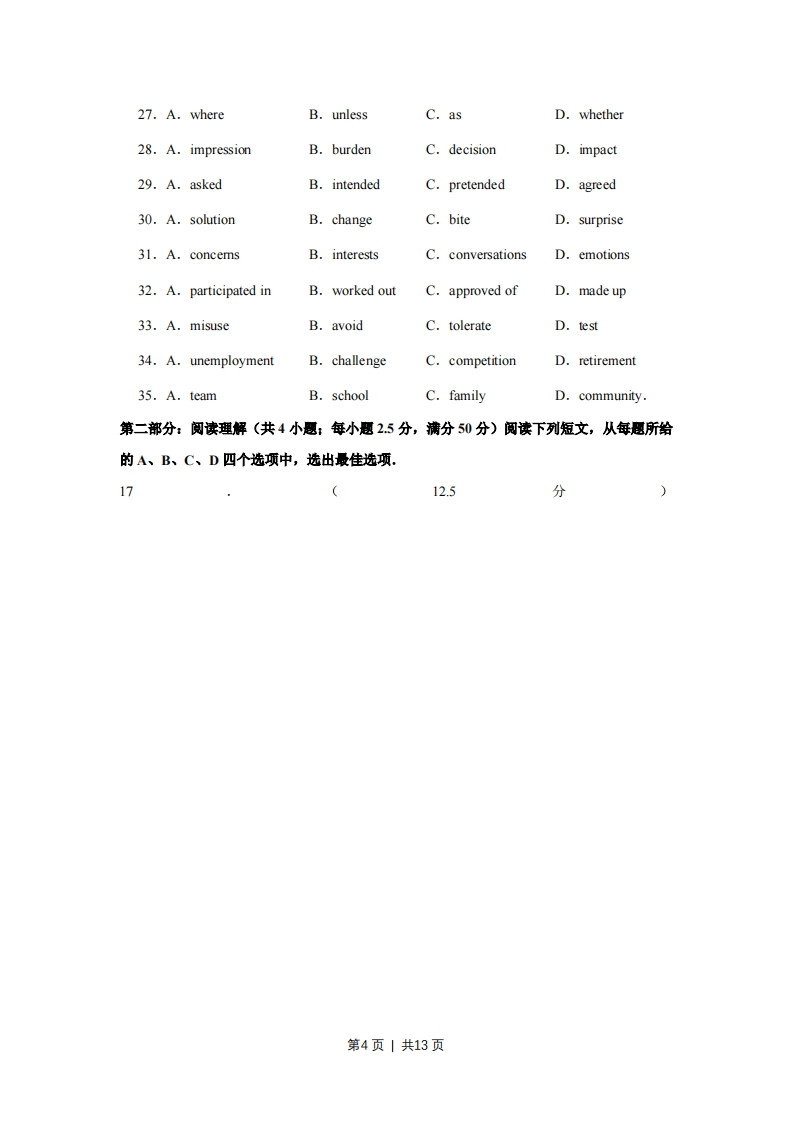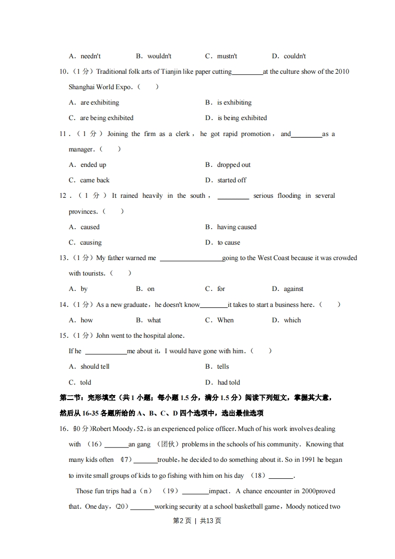2010年天津市高考英语试卷第一节:单项填空(共15小题:每小题1分,满分15分)从A、B、C、D四个选项中,选出可以填入空白处的最佳选项,例:Standoverthereyou’llbeabletoseeitbetter.A.orB.andC.butD.while B.1.(1)He telephoned the travel agency to_three air tickets to London.(A.orderB.arrangeC.takeD.book2.(1)Excuse me,I wonder if you can help me?Sure.?()A.What helpB.What is thisC.What is itD.What do you want3.(1)James took the magazines off the little table to makefor the television.A.roomB.areaC.fieldD.position4.(1分)Weon this project for four hours.Let's have a rest.A.are workingB.have been workingC.workedD.had worked5.(1)People have always beenabout exactly how life on earth began.(A.curiousB.excitedC.anxiousD.careful6.(1分)in my life impressed me so deeply as my first visit to the PalaceMuseum.(A.AnythingB.NothingC.EverythingD.Something7.(1)-Professor Johnson,I'm afraid I can't finish the report within this week.、-·How about next week?()A.Good for youB.It won't bother meC.Not at allD.That's OK8.(1)Can you believe I had to pay 30 dollars for a haircut?You should try the barber's_I go.It's only $15.)A.asB.whichC.whereD.that9.(1分)Markhave hurried.After driving at top speed.he arrived half an hourearly.()第1页|共13页A.needn'tB.wouldn'tC.mustn'tD.couldn't10.(1)Traditional folk arts of Tianjin like paper cutting_at the culture show of the 2010Shanghai World Expo.(A.are exhibitingB.is exhibitingC.are being exhibitedD.is being exhibited11.(1)Joining the firm as a clerk,he got rapid promotion,andas amanager.()A.ended upB.dropped outC.came backD.started off12.(1)It rained heavily in the south,serious flooding in severalprovinces.(A.causedB.having causedC.causingD.to cause13.(1)My father warned megoing to the West Coast because it was crowdedwith tourists.(A.byB.onC.forD.against14.(As a new graduate,he doesn't know.Lit takes to start a business here.(A.howB.whatC.WhenD.which15.(1)John went to the hospital alone.Ifheme about it,I would have gone with him.A.should tellB.tellsC.toldD.had told第二节:完形填空(共1小题:每小题1.5分,满分1.5分)阅读下列短文,掌握其大意,然后从1635各题所给的A、B、C、D四个选项中,选出最佳选项16.30)Robert Moody,52,is an experienced police officer.Much of his work involves dealingwith (16)an gang (problems in the schools of his community.Knowing thatmany kids often (7)trouble,he decided to do something about it.So in 1991 he beganto invite small groups of kids to go fishing with him on his day (1)Those fun trips had a (n)(19)impact.A chance encounter in 2000provedthat.One day,20)working security at a school basketball game,Moody noticed two第2页|共13页young guys (21)_He sensed trouble between them.(22)one of themheaded toward Moody and gave him a hug."I (23)you.You took me (24).when I was in fifth grade.That was one of the (25)days of my life.Deeply touched by the boy's word,Moody decided to create a foundation (that(26)teenagers to the basics of fishing in camping programs."As a policeman,I saw(27)there was violence,drugs were always behind it.They have a damaging(28)on the kids,"says Moody.By turning kids on to fishing,he (29)_to present an alternative way of life,