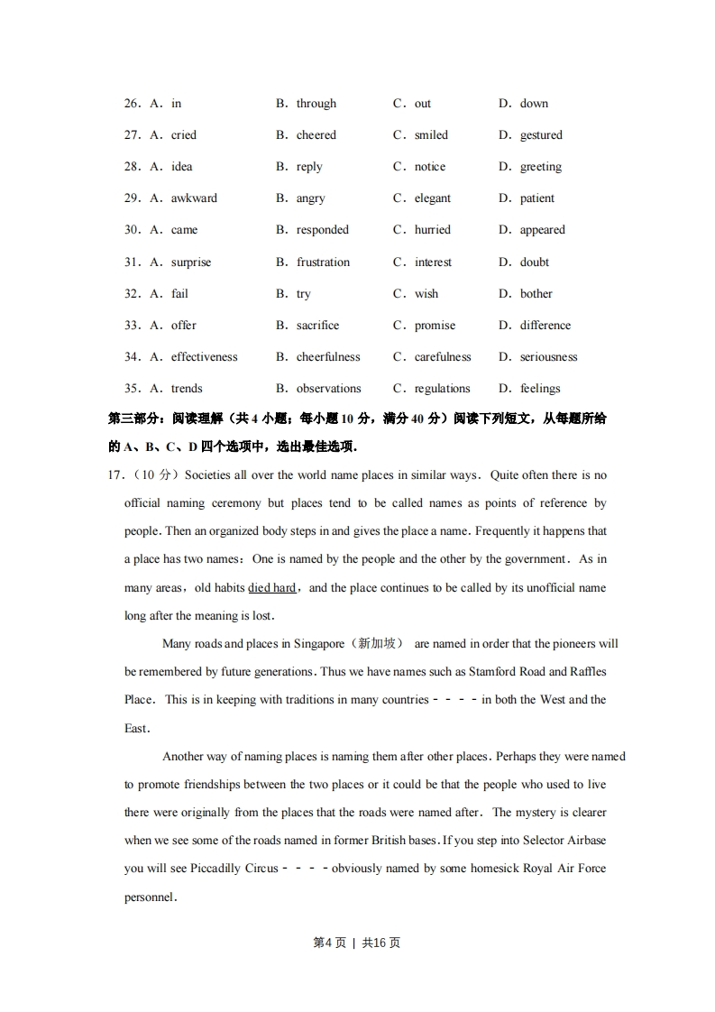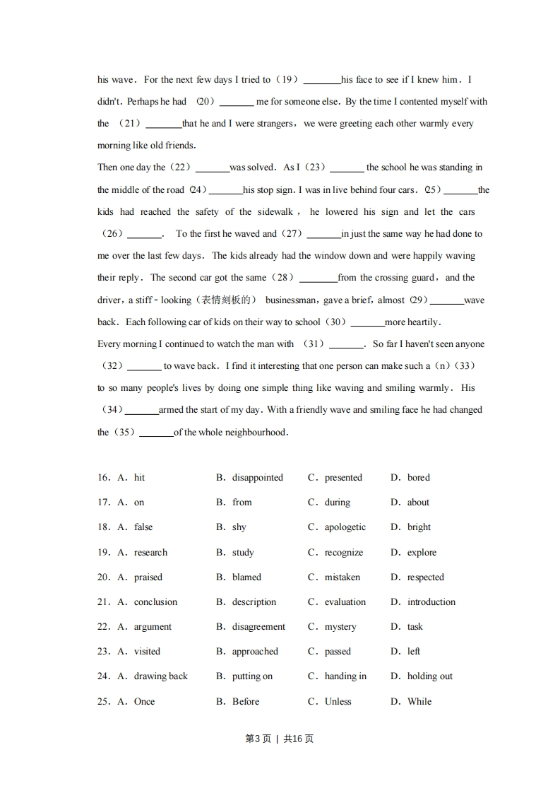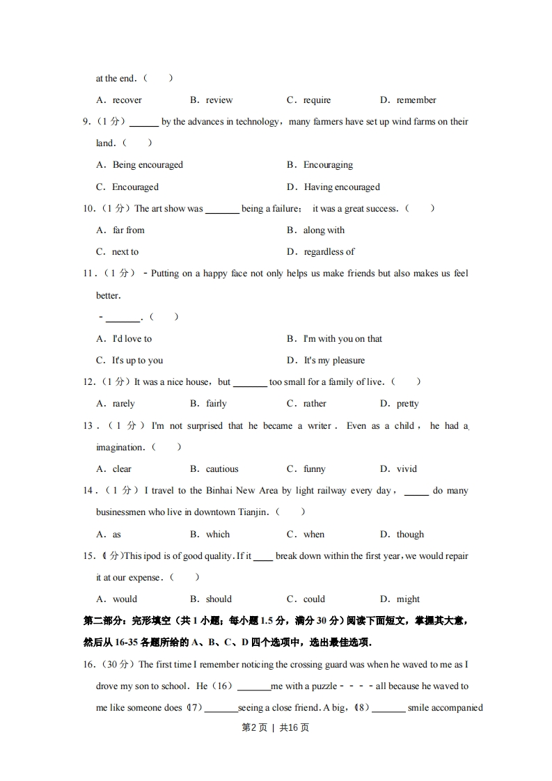 2009年天津市高考英语试卷第I卷第一部分:英话知识运用(共两节,满分15分)第一节:单项填空(共15小题:每小题1分,满分15分)从A、B、C、D四个选项中,选出可以填入空白处的最佳选项。例Stand over thereyou’ll be able to see it better.A.orB.andC.butD.while答案是B。1.(1)I'm trying to break theof getting up too late.(A.traditionB.convenienceC.habitD.leisure2.(1分)My parentsin Hong Kong.They were born there and have lived nowhereelse.()A.liveB.livedC.were livingD.had lived3.()-----We're organizing a party next Saturday,and I'd like you to come.!I have another one that day.Thank you just the same.(A.Good luckB.What a pityC.Never do it againD.Well done4.(1)the project in time,the staff were working at weekends.A.CompetingB.Having completedC.To have completedD.To complete5.(1分)A persone-mail account is full won't be able to send or receive any emails.()A.whoB.whomC.whoseD.whoever6.()-----Sorry,I have tonow.It's time for class.-----OK,I'll call back later.A.hang upB.break upC.give upD.hold up7.(1)It is obvious to the studentsthey should get well prepared for theirfuture.(A.asB.whichC.whetherD.that8.(1)Don't worry if you don't understand everything,the teacher willthe main points第1页|共16页at the end.(A.recoverB.reviewC.requireD.remember9.(1分)by the advances in technology,many farmers have set up wind farms on theirland.()A.Being encouragedB.EncouragingC.EncouragedD.Having encouraged10.(The art show wasbeing a failure:it was a great success.(A.far fromB.along withC.next toD.regardless of11.(1)-Putting on a happy face not only helps us make friends but also makes us feelbetter.A.I'd love toB.I'm with you on thatC.It's up to youD.It's my pleasure12.(1)It was a nice house,buttoo small for a family of live.(A.rarelyB.fairlyC.ratherD.pretty13.(1)I'm not surprised that he became a writer.Even as a child,he had a.imagination.()A.clearB.cautiousC.funnyD.vivid14.(1)I travel to the Binhai New Area by light railway every day,do manybusinessmen who live in downtown Tianjin.(A.asB.whichC.whenD.though15.)This ipod is of good quality.If it break down within the first year,we would repairit at our expense.(A.wouldB.shouldC.couldD.might第二部分:完形填空(共1小愿:每小题15分,满分30分)阅读下面短文,掌握其大意,然后从16-35各题所给的A、B、C、D四个选项中,选出最佳选项.16.(30)The first time I remember noticing the crossing guard was when he waved to me as Idrove my son to school.He (16)me with a puzzle----all because he waved tome like someone does (7)seeing a close friend.A big,8)_smile accompanied第2页|共16页his wave.For the next few days I tried to (19)his face to see if I knew him.Ididn't.Perhaps he had 20)me for someone else.By the time I contented myself withthe (21)that he and I were strangers,we were greeting each other warmly everymorning like old friends.Then one day the (22)was solved.As I (23)the school he was standing inthe middle of the road 24)his stop sign.I was in live behind four cars.25)thekids had reached the safety of the sidewalk,he lowered his sign and let the cars(26)To the first he waved and (27)in just the same way he had done tome over the last few days.The kids already had the window down and were happily
