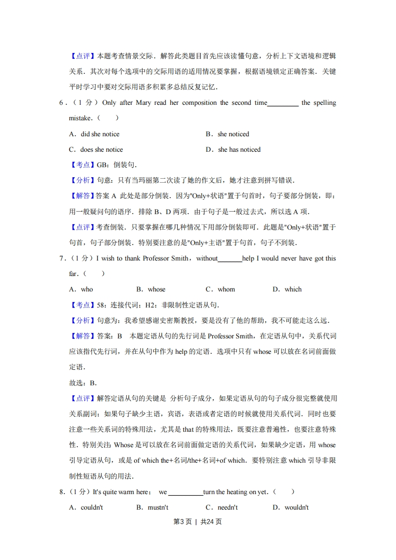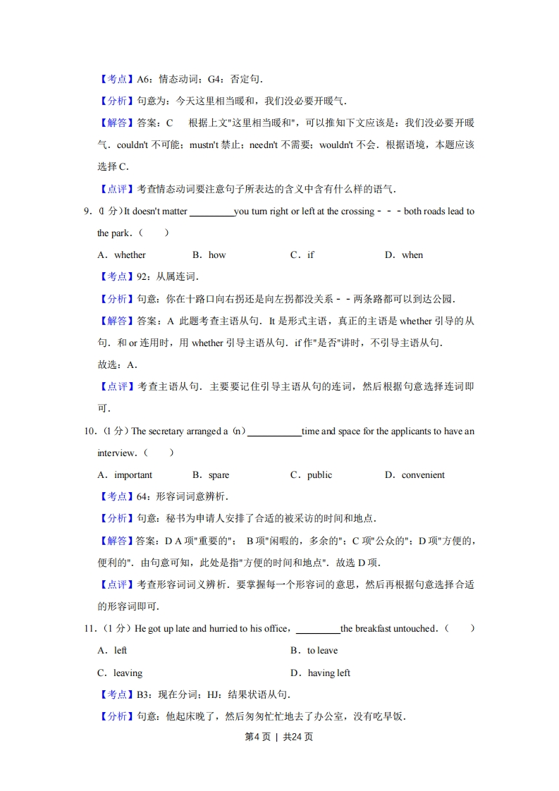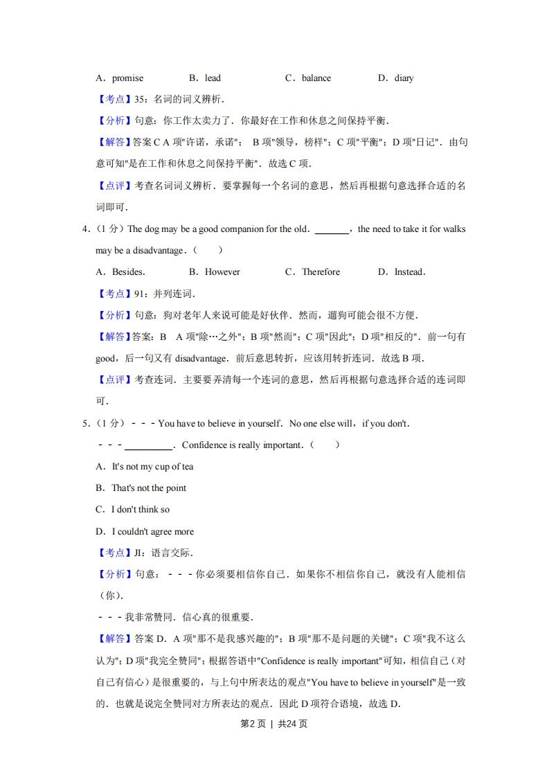 2012年天津市高考英语试卷解析版套考答案与试题解析第一部分:英语知识运用(共两节,满分15分)第一节:单项填空(共15小题,每小题1分,满分15分)从A、B、C、D四个选项中,选出可以填入空白处的最佳选项.1.(1)---Can I have a day off tomorrow,Mr.Johnson?I can manage without you.(A.Forget itB.I'm afraid notC.It dependsD.Of course【考点】:语言交际【分析】句意:~-约翰逊先生,明天我可以请一天的假吗?··当然可以,没有你我能应付:【解答】答案D.A项"休想:算了吧":B项"我恐怕不行":C项"视情况而定":D项"当然":根据答语中'I can manage without you"可知,明天没有你我能应付,说明是同意对方请假.因此D项符合语境,故选D.【点评】本题考查情景交际.解答此类题目首先应该读懂句意,分析上下文语境和逻辑关系.其次对每个选项中的交际用语的适用情况要掌握,根据语境锁定正确答案,关键平时学习中要对交际用语多积累多总结反复记忆:2.(1)The letters for the bosson his desk but he didn't read them until threelater.(A.were putB.was putC.putD.has put【考点】F4:一般过去时的被动语态,【分析】句意:给老板的那些信(被)放在他的办公桌上,但他直到三天后才读.【解答】答案A此处The letters和put之间是被动关系.由but he didn'tread可知,应该用过去式,即:一般过去时的被动语态,故选:A【点评】考查一般过去时的被动语态.主要看句子的主语和动词之间是主动还是被动关系,然后再根据时间状语确定时态3.(1)You were working too hard.You'd better keep abetween work andrelaxation.()第1页|共24页A.promiseB.leadC.balanceD.diary【考点】35:名词的词义辨析.【分析】句意:你工作太卖力了.你最好在工作和休息之间保持平衡.【解答】答案CA项"许诺,承诺":B项"领导,榜样":C项"平衡”:D项"日记".由句意可知"是在工作和休息之间保持平衡”.故选C项,【点评】考查名词词义辨析.要掌握每一个名词的意思,然后再根据句意选择合适的名词即可4.(1)The dog may be a good companion for the old.the need to take it for walksmay be a disadvantage.(A.Besides.B.HoweverC.ThereforeD.Instead.【考点】91:并列连词.【分析】句意:狗对老年人来说可能是好伙伴.然而,遛狗可能会很不方便,【解答】答案:BA项"除…之外":B项"然而":C项"因此":D项"相反的".前一句有good,后一句又有disadvantage.前后意思转折,应该用转折连词.故选B项.【点评】考查连词.主要要弄清每一个连词的意思,然后再根据句意选择合适的连词即可5.()---You have to believe in yourself.No one else will,if you don't.Confidence is really important.(A.It's not my cup of teaB.That's not the pointC.I don't think soD.I couldn't agree more【考点】I:语言交际.【分析】句意:-·-你必须要相信你自己.如果你不相信你自己,就没有人能相信(你).-·-我非常赞同.信心真的很重要.【解答】答案D.A项"那不是我感兴趣的":B项"那不是问题的关键":C项"我不这么认为":D项"我完全赞同":根据答语中"Confidence is really important"可知,相信自己(对自己有信心)是很重要的,与上句中所表达的观点"You have to believe in yourself"是一致的.也就是说完全赞同对方所表达的观点.因此D项符合语境,故选D.第2页1共24页【点评】本题考查情景交际,解答此类题目首先应该读懂句意,分析上下文语境和逻辑关系.其次对每个选项中的交际用语的适用情况要掌握,根据语境锁定正确答案.关键平时学习中要对交际用语多积累多总结反复记忆6.(1)Only after Mary read her composition the second timethe spellingmistake.A.did she noticeB.she noticedC.does she noticeD.she has noticed【考点】GB:倒装句.【分析】句意:只有当玛丽第二次读了她的作文后,她才注意到拼写错误,【解答】答案A此处是部分倒装.因为"Oly+状语"置于句首时,句子要部分倒装,即:用一般疑问句的语序.排除B、D两项.由于句子是一般过去式,所以选A项.【点评】考查倒装.只要掌握在哪几种情况下用部分倒装即可.此题是"Oly+状语"置于句首,句子部分倒装.特别要注意的是"Oly+主语"置于句首,句子不到装7.(1)I wish to thank Professor Smith,without help I would never have got thisfar.()A.whoB.whoseC.whomD.which【考点】58:连接代词:H2:非限制性定语从句【分析】句意为:我希望感谢史密斯教授,要是没有了他的帮助,我不可能走这么远,【解答】答案:B本题定语从句的先行词是Professor Smith,在定语从句中,关系代词应该指代先行词,并在从句中作为help的定语.选项中只有whose可以放在名词前面做定语,故选:B.【点评】解答定语从句的关键是分析句子成分,如果定语从句的句子成分很完整就使用关系副词:如果句子缺少主语,宾语,表语或者定语的时候就使用关系代词.同时也要注意一些关系词的特殊用法,尤其是that的特殊用法,既要注意普遍性,也要注意特殊性.特别关注Whose是可以放在名词前面做定语的关系代词,如果缺少定语,用whose引导定语从句,或是of which the-+名词he+名词+of which.要特别注意which引导非限制性短语从句的用法8.(It's quite warm here:we._turn the heating on yet.A.couldn'tB.mustn'tC.needn'tD.wouldn't第3页1共24页