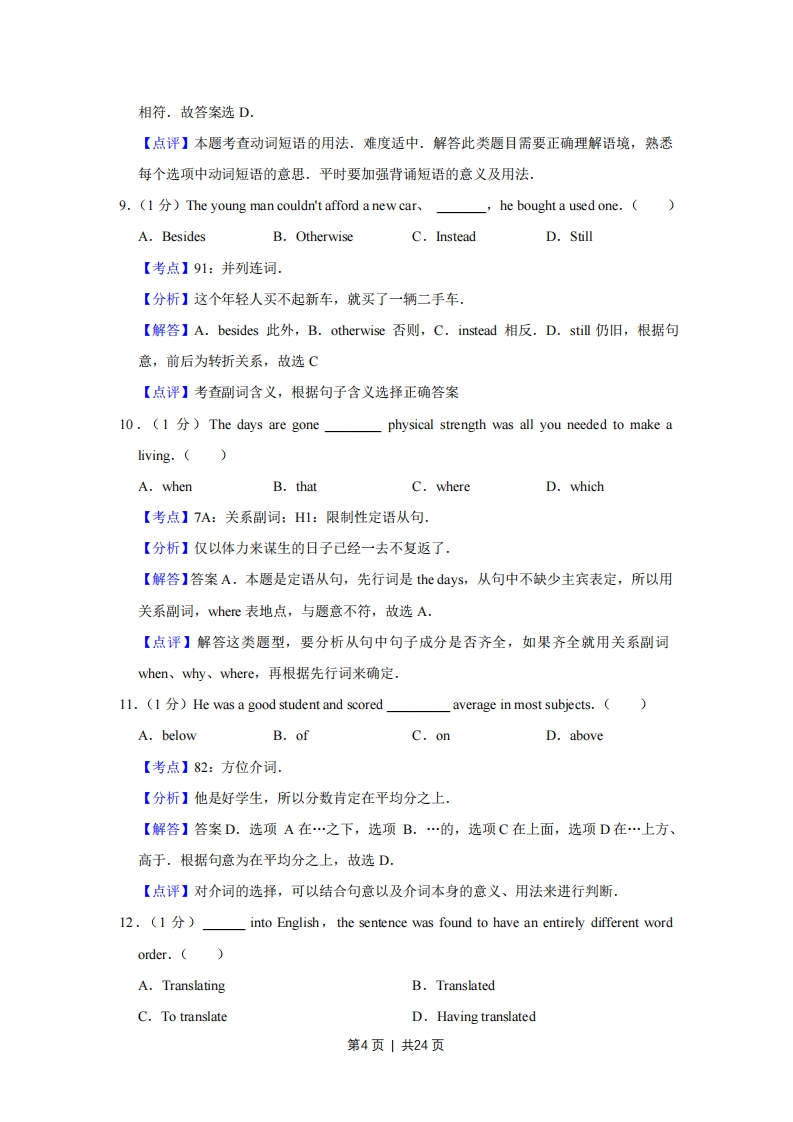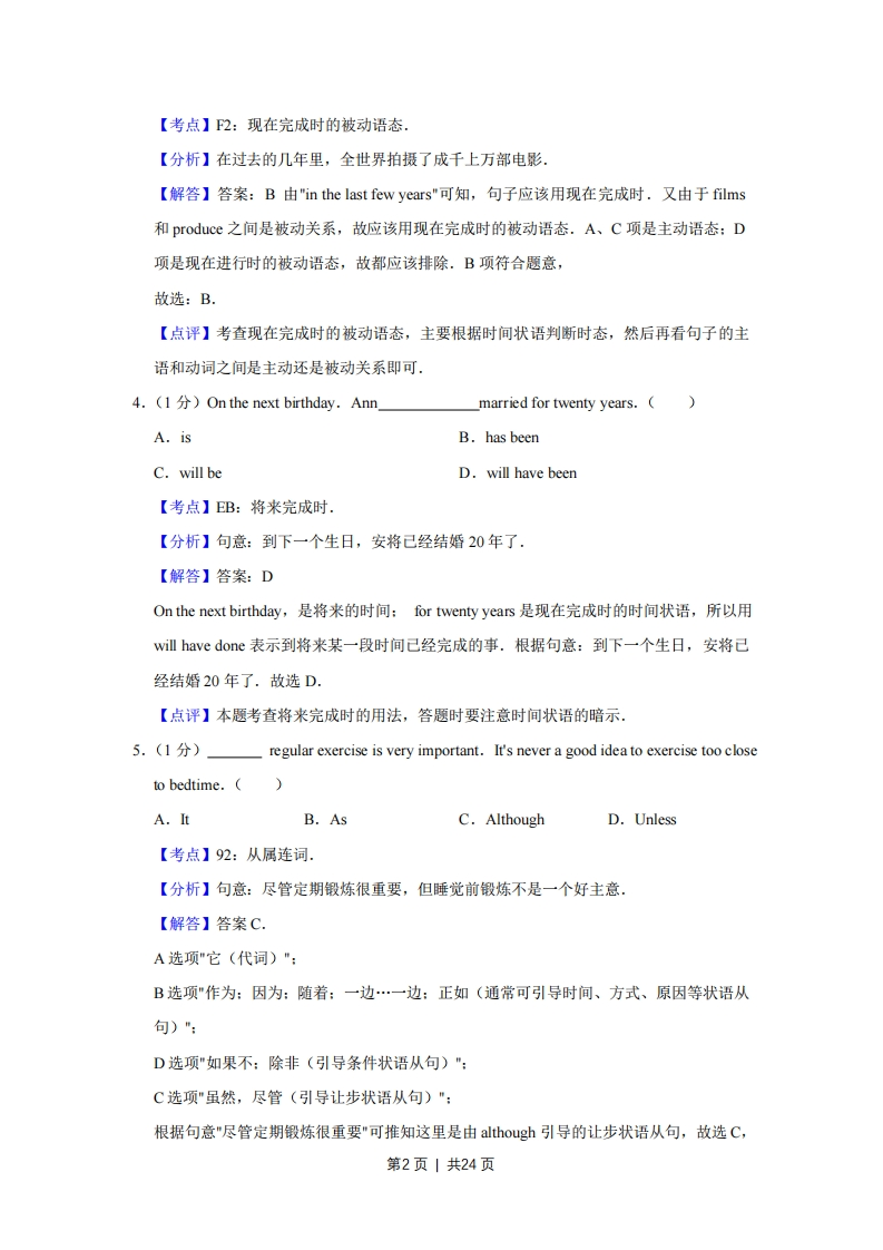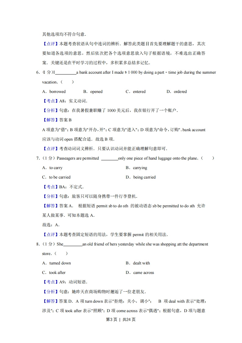 2011年天津市高考英语试卷解析版◆考答案与试题解析第一部分:英语知识运用(共两节,满分15分)第一节:单项填空(共15小题,每小题1分,满分15分)l.(1分)We feelour duty to make our country a better place.(A.itB.thisC.thatD.one【考点】GF:it的用法,【分析】我们感觉使我们的国家变成一个更好的地方是我们的责任,【解答】答案:A.题干中动词feel的真正宾语是不定式to make our country a betterplace,it作形式宾语,代替此不定式,our duty作宾语补足语,构成"动词+it+n.+todo".故选A.【点评】此题考查t作形式宾语.t作形式宾语常用的结构如下:①feel/make/think/find/consider+-ittn./adj./介词短语+todo②enjoy/like/love/dislike/hate+it+when-从句③appreciate it+-if-从句④rely on/dependon/count on/see to it+that-从句2.(1)Just a moment.I haven't finished packing my suitcase.It's high time we left for the airport.(A.Go aheadB.Take it easyC.Hurry upD.That's fine【考点】I:语言交际.【分析】·-稍等一会儿.我还没有装好旅行箱.--快点.快到我们去飞机场的时间了【解答】答案C.由空后的"快到我们去飞机场的时间了."可知此处应该催促对方抓紧时间.Go ahead."干吧,继续,开始":Take it easy."放松点,别紧张":Hurry up."快点,赶快":That's fine."没事,没关系".所以应该选择C.【点评】做这类题目,要根据选项的意义、用法及句意来做出正确的选择和判断.3.(1)In the last few years thousands of filmsall over the word.(A.have producedB.have been producedC.are producingD.are being produced第1页1共24页【考点】2:现在完成时的被动语态.【分析】在过去的几年里,全世界拍摄了成千上万部电影.【解答】答案:B由"in the last few years"可知,句子应该用现在完成时.又由于films和produce之间是被动关系,故应该用现在完成时的被动语态.A、C项是主动语态:D项是现在进行时的被动语态,故都应该排除.B项符合题意,故选:B.【点评】考查现在完成时的被动语态,主要根据时间状语判断时态,然后再看句子的主语和动词之间是主动还是被动关系即可.4.(On the next birthday.Annmarried for twenty years.(A.isB.has beenC.will beD.will have been【考点】EB:将来完成时.【分析】句意:到下一个生日,安将己经结婚20年了.【解答】答案:DOn the next birthday,是将来的时间:for twenty years是现在完成时的时间状语,所以用will have done表示到将来某一段时间己经完成的事.根据句意:到下一个生日,安将己经结婚20年了.故选D.【点评】本题考查将来完成时的用法,答题时要注意时间状语的暗示。5.(1)regular exercise is very important.It's never a good idea to exercise too closeto bedtime.(A.ItB.AsC.AlthoughD.Unless【考点】92:从属连词.【分析】句意:尽管定期锻炼很重要,但睡觉前锻炼不是一个好主意.【解答】答案C.A选项"它(代词)":B选项"作为:因为:随着:一边一边:正如(通常可引导时间、方式、原因等状语从句)":D选项"如果不:除非(引导条件状语从句)":C选项"虽然,尽管(引导让步状语从句)":根据句意"尽管定期锻炼很重要"可推知这里是由although引导的让步状语从句,故选C,第2页|共24页其他选项均不符合句意。【点评】本题考查状语从句中连词的辨析.解答此类题目首先要理解题干的意思,其次要知道各选项的意思,然后依次把各个选项意思放入句子根据语境,不难选出正确答案.关键还是在平时学习的过程中,多积累多总结多记忆6.0分)Ia bank account after I made s 1 000 by doing a part-time job during the summervacation.A.borrowedB.openedC.enteredD.ordered【考点】A8:实义动词.【分析】句意:在我暑假兼职赚了1000美元后,我在银行开了一个账户.【解答】答案BA项意为"借":B项意为"开办,开":C项意为"进入":D项意为"命令,订购".bank account应该与动词open搭配合适.故选B项.【点评】考查动词词义辨析.只要认识动词并能正确理解句意即可.7.(1)Passeagers are permittedonly one piece of hand luggage onto the plane.(A.to carryB.carryingC.to be carriedD.being carried【考点】BA:不定式【分析】句意:旅客只可以随身携带一件行李登机:【解答】答案A.根据短语permit sb to do sth的被动语态sb be permitted to do sth允许某人做某事.可知本题选A.故选:A.【点评】本题考查固定短语的用法,学生要掌握permit的相关用法,8.(1分)Shean old friend of hers yesterday while she was shopping att the departmentstore.()A.tumed downB.dealt withC.took afterD.came across【考点】A9:动词短语,【分析】句意:她昨天在商场购物时邂逅了一位老朋友.【解答】答案D.A项turn down表示"拒绝:关小,调小":B项deal with表示"处理:涉及":C项took after表示"照顾":D项come across表示"偶遇":根据句意,D项与题意第3页1共24页