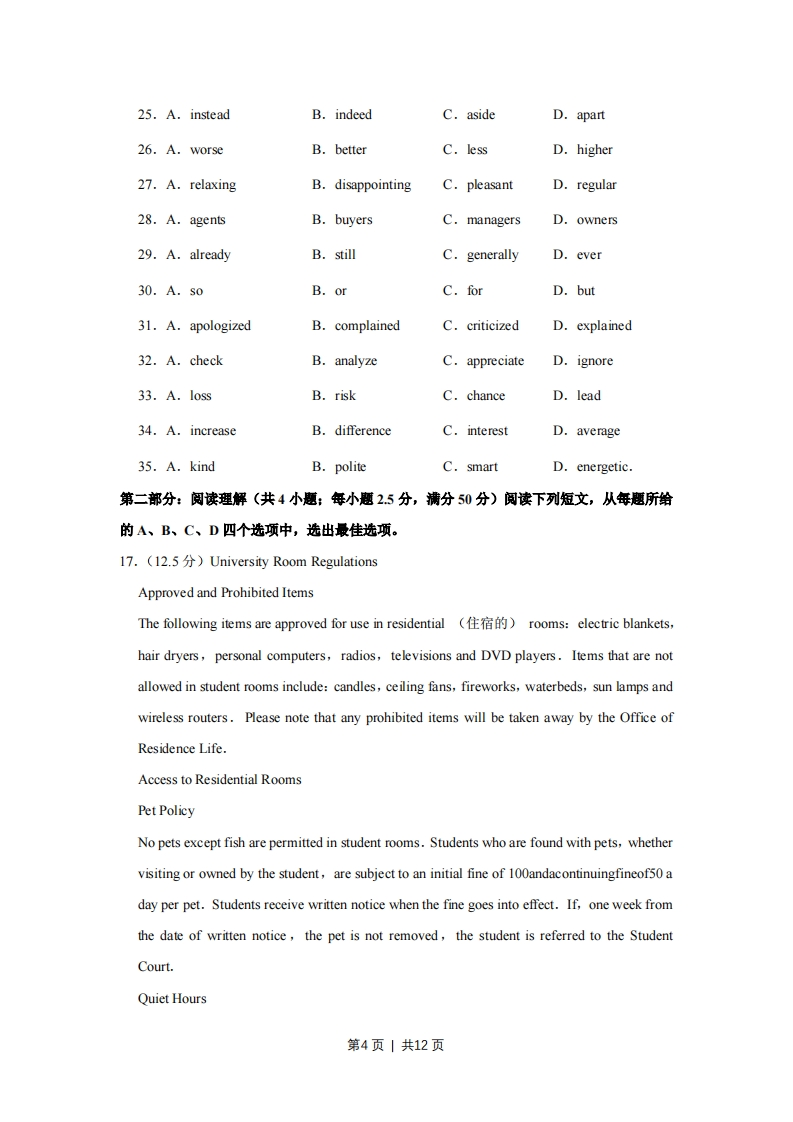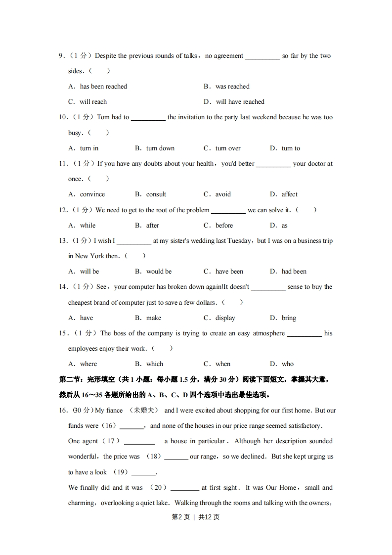 2015年天津市高考英语试卷一、选择题(共15小题,每小题1分,满分15分)1.(Sorry,Liz.I think I was a bit rude to you.but don't do that again!(A.Go aheadB.Forget itC.It dependsD.With pleasure2.(1)The quality of education in this small school is better thanin some largerschools.()A.thatB.oneC.itD.this3.(1)Only when Lily walked into the officethat she had left the contract athome.()A.she realizedB.has she realizedC.she has realizedD.did she realize4.(-Jack,you seem excited.I won the first prize (A.Guess whatB.So whatC.Pardon meD.Who cares5.(1分)in painting,John didn't notice evening approaching.(A.To absorbB.To be absorbedC.AbsorbedD.Absorbing6.(1)Jane can't attend the meeting at 3o'clock this afternoon because shea classat that time.A.will teachB.would teachC.has taughtD.will be teaching7.4分)1have worried before I came to the new school,for my classmates here arevery friendly to me.(A.mightn'tB.mustn'tC.needn'tD.couldn't8.(1分)for two days,Steve managed to finish his report on schedule.(A.To workB.WorkedC.To be workingD.Having worked第1页|共12页9.(1)Despite the previous rounds of talks,no agreementso far by the twosides.(A.has been reachedB.was reachedC.will reachD.will have reached10.(1分)Tom had tothe invitation to the party last weekend because he was toobusy.()A.tum inB.tumn downC.tum overD.tum to11.(1)If you have any doubts about your health,you'd betteryour doctor atonce.()A.convinceB.consultC.avoidD.affect12.(We need to get to the root of the problemwe can solve it.A.whileB.afterC.beforeD.as13.(1分)I wishIat my sister's wedding last Tuesday,but I was on a business tripin New York then.(A.will beB.would beC.have beenD.had been14.(1)See,your computer has broken down again!It doesn'tsense to buy thecheapest brand of computer just to save a few dollars.A.haveB.makeC.displayD.bring15.(1)The boss of the company is trying to create an easy atmospherehisemployees enjoy their work.(A.whereB.whichC.whenD.who第二节:完形填空(共1小题:每小题15分,满分30分)阅读下面短文,掌握其大意,然后从16~35各题所给出的A、B、C、D四个选项中选出最佳选项。l6.G0分)My fiance(未婚夫)and I were excited about shopping for our first home.But ourfunds were (16)and none of the houses in our price range seemed satisfactory.One agent (17)a house in particular.Although her description soundedwonderful,the price was (18)our range,so we declined.But she kept urging usto have a look (19)We finally did and it was (20)at first sight.It was Our Home,small andcharming,overlooking a quiet lake.Walking through the rooms and talking with the owners,第2页|共12页a nice elderly couple,we felt the warmth and (21)of the marriage within thathome.As perfect as it was,the price remained too high for us.But every day,we would sit bythe lake,looking at the house and dreaming of (22)it would be like to livethere.Days later,we made a (n)(23)-far below the asking price.Surprisingly,theydidn't (24)us.They renewed their offer (25)It was also much morethan we could afford,but far (26)than the original asking price.The next day,we got a (27)message that another buyer had offered a much higherprice.Even so,we decid