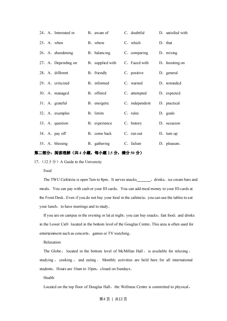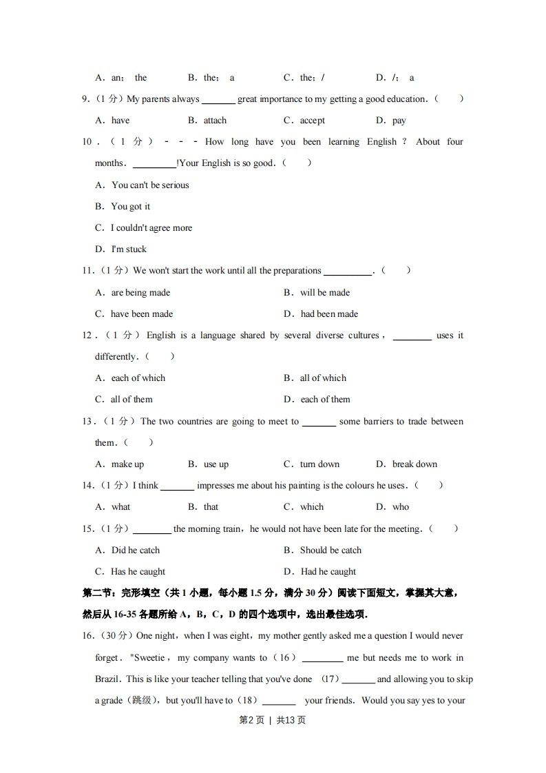 2014年天津市高考英语试卷第一节:单项填空(共15小题:每小题1分,满分15分)1.(Give me a chance,I'll give you a wonderful surprise.(A.ifB.orC.andD.while2.1)---Ok,I'll fix your computer right now.---Oh,take yourtime.()A.I can't stand itB.I'm in no hurryC.That's a great ideaD.It's not my cup oftea3.(1)Wind is now the world's fastest growing_ofpower.(A.sourceB.senseC.resultD.root4.(1分)you start eating in a healthier way,weight control will become mucheasier.A.unlessB.AlthoughC.BeforeD.Once5.)Anxiously,she took the dress out of the package and tried it on,onlyit didn'tfit()A.to findB.foundC.findingD.having found6.(1分)the school,the village has a clinic,which was also built with governmentsupport.(A.In reply toB.In addition toC.In charge ofD.In place of7.(Clearly and thoughtfully_the book inspires confidence in students who wishto seek their own answers.(A.writingB.to writeC.writtenD.being written8.(1分)Life is likeocean:Onlystrong-welled can reach the othershore.()第1页1共13页A.an:theB.the:aC.the:/D./;a9.(1)My parents alwaysgreat importance to my getting a good education.(A.haveB.attachC.acceptD.pay10.1)---How long have you been learning English About fourmonths.!Your English is so good.(A.You can't be seriousB.You got itC.I couldn't agree moreD.I'm stuck11.(1)We won't start the work until all the preparationsA.are being madeB.will be madeC.have been madeD.had been made12.(1)English is a language shared by several diverse cultures,uses itdifferently.()A.each of whichB.all of whichC.all of themD.each ofthem13.(1)The two countries are going to meet tosome barriers to trade betweenthem.()A.make upB.use upC.tum downD.break down14.(1分)I thinkimpresses me about his painting is the colours he uses.(A.whatB.thatC.whichD.who15.(1分)the moming train,he would not have been late for the meeting.(A.Did he catchB.Should be catchC.Has he caughtD.Had he caught第二节:完形填空(共1小题,每小题15分,满分30分)阅读下面短文,掌握其大意,然后从1635各题所给A,B,C,D的四个选项中,选出最佳选项.16.(30)One night,when I was eight,my mother gently asked me a question I would neverforget."Sweetie,my company wants to (16)me but needs me to work inBrazil.This is like your teacher telling that you've done (17)and allowing you to skipa grade(跳级),but you'll have to(18)your friends.Would you say yes to your第2页|共13页teacher?"She gave me a hug and asked me to think about it.I was puzzled.The question keptme(19)for the rest of the night I had said"yes"but for the first time,I realized the(20)decisions adults had to make.For almost four years,my mother would call us from Brazil every day.Every evening I'd(21)wait for the phone to ring and then tell her every detail of my day.A phonecall,however,could never replace her (22)and it was difficult not to feel lonely attimes.During my fourth-grade Christmas break,we flew to Rio to visit her.Looking at her large(23)apartment,I became (24)how lonely my mother must have been inBrazil herself.It was then 25)I started to appreciate the tough choices she had to makeon(26)family and work.(27)difficult decisions,she used to tell me,you wouldn't know